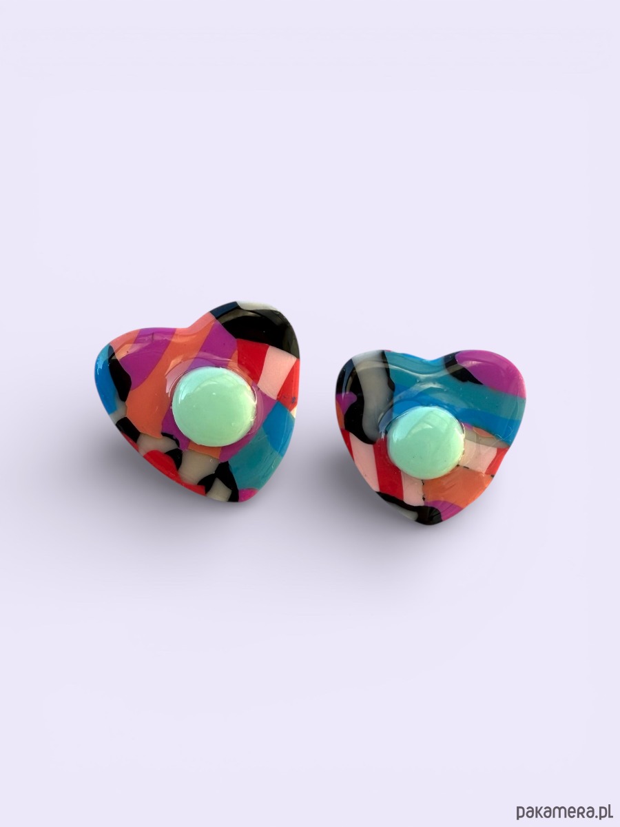 Oryginalne kolczyki wykonane ręcznie z dbałością o szczegóły z profesjonalnej glinki polimerowej, wypalane w piecu i szlifowane w domowej pracowni. Każda para kolczyków jest niepowtarzalna i wyjątkowa. Kolczyki są bardzo lekkie i wygodne, nie obciążają płatka ucha i przyciągają spojrzenia. Zapinane na sztyft ze stali chirurgicznej.