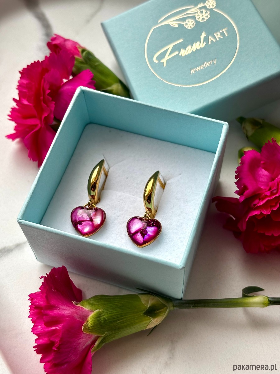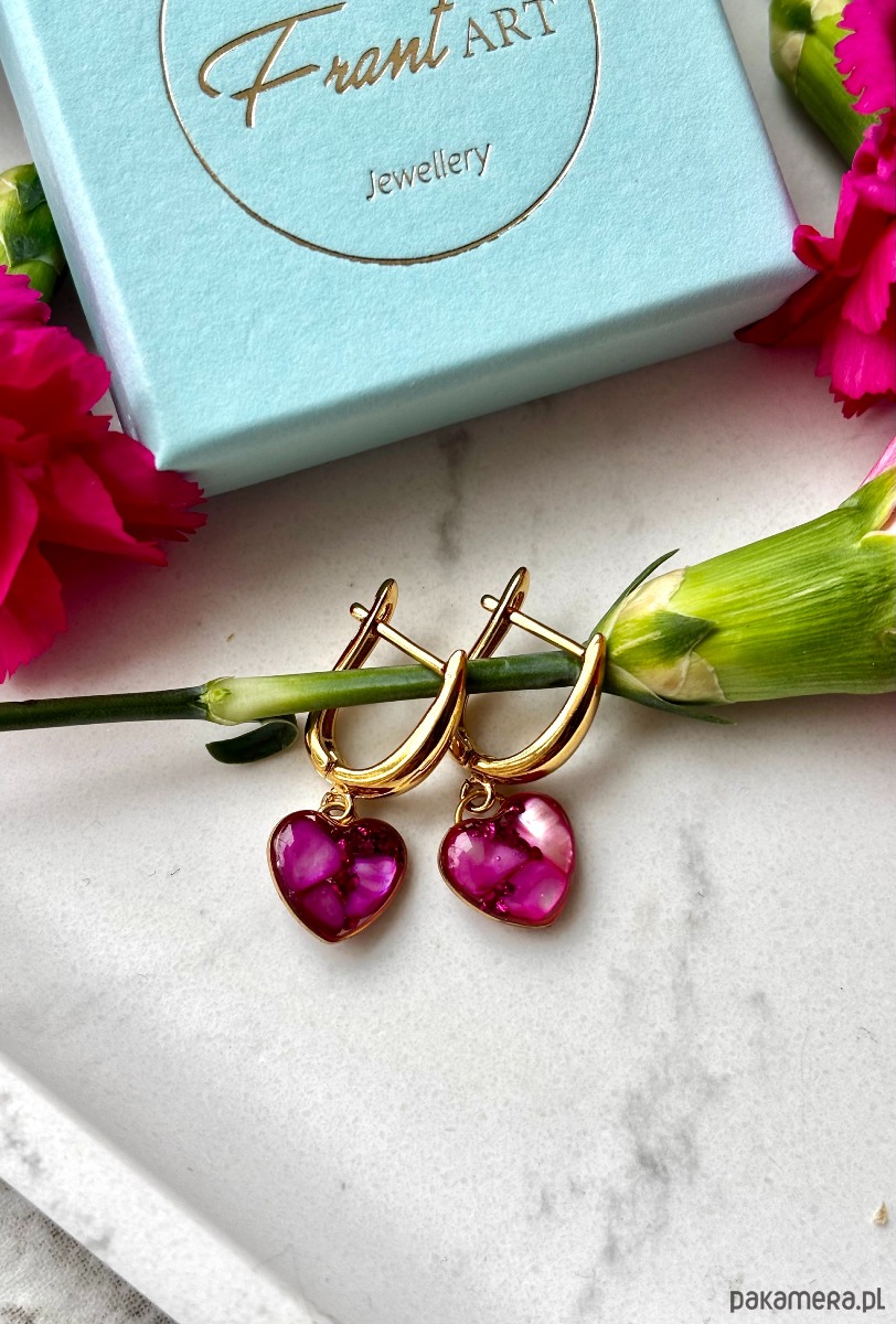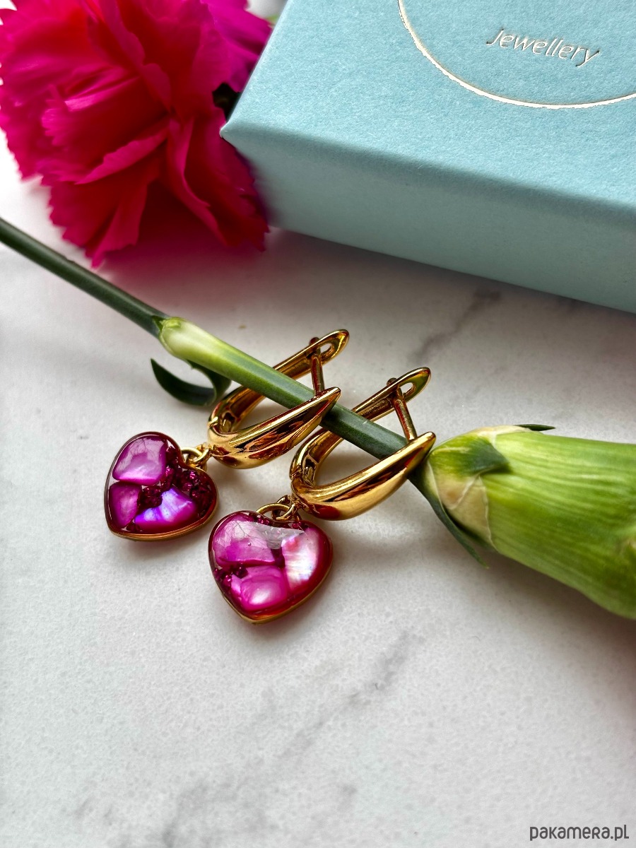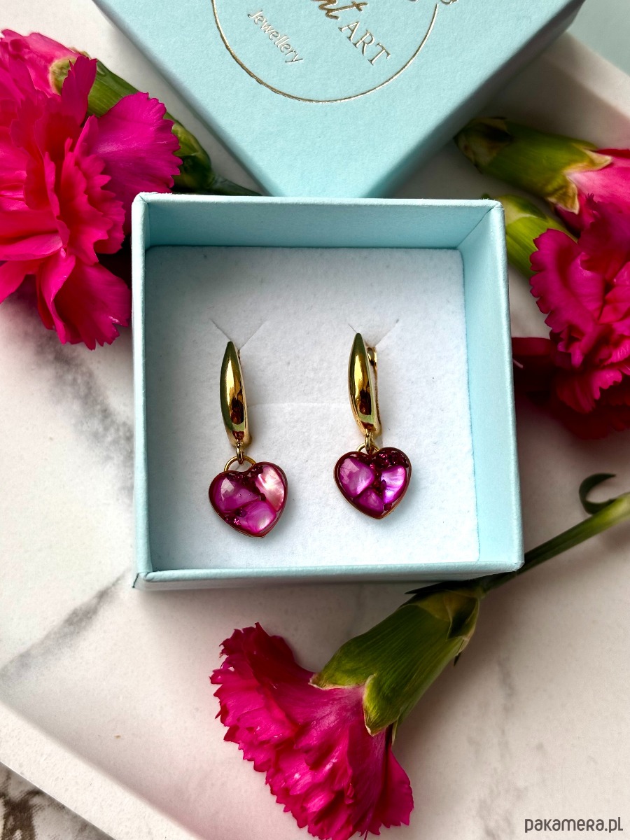 Ręcznie wykonane wiszące kolczyki z zawieszkami w kształcie serca. Biżuteria wykonana jest z wyselekcjonowanych kawałków muszli, drobinek szkła w odcieniach intensywnego różu. Kolczyki pięknie prezentują się na uchu, są efektowne i wyjątkowo lekkie co stanowi komfort noszenia.