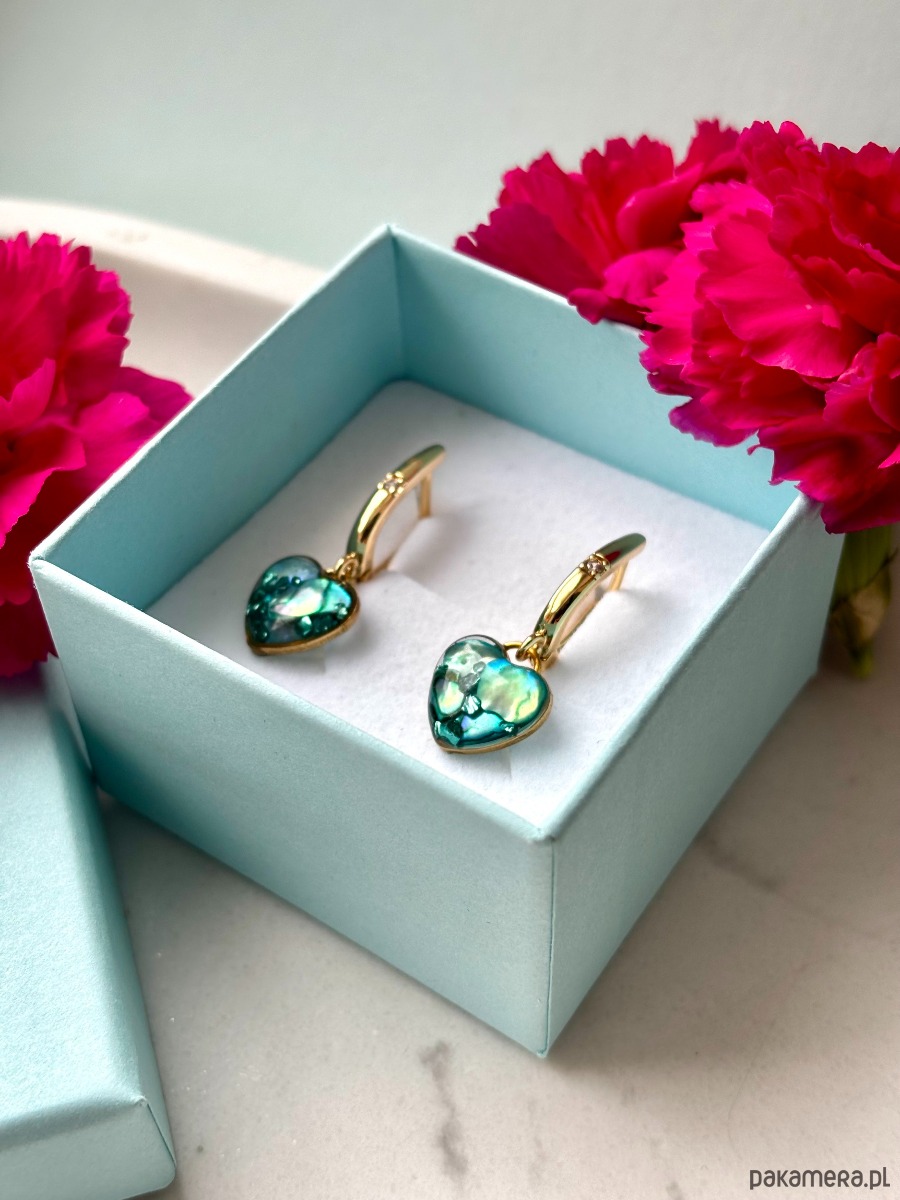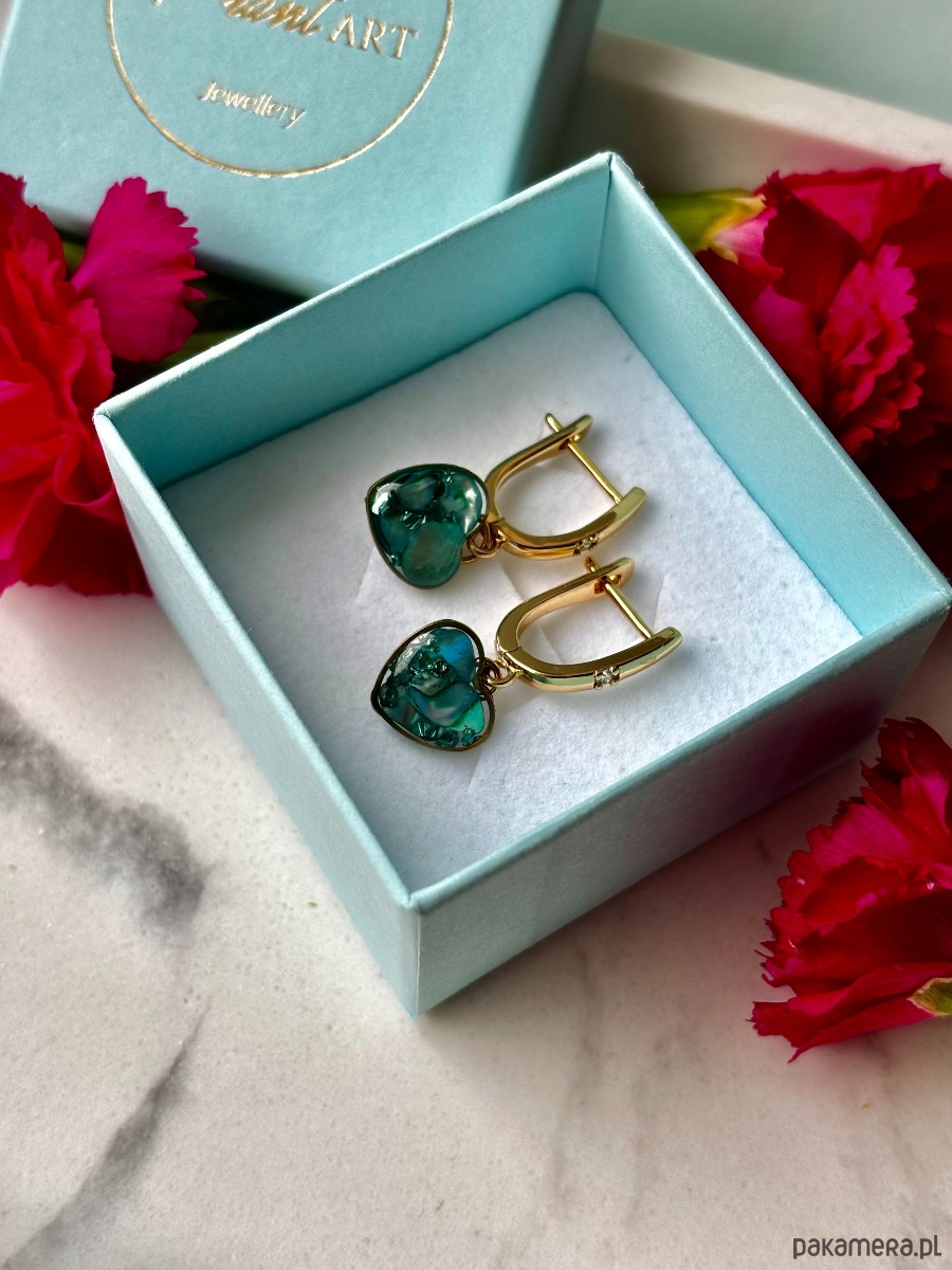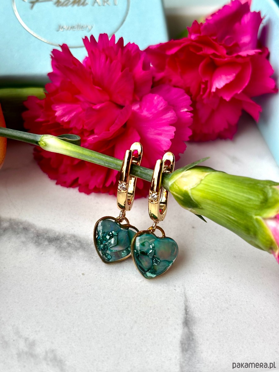 Ręcznie wykonane wiszące kolczyki z zawieszkami w kształcie serca. Biżuteria wykonana jest z wyselekcjonowanych kawałków muszli, drobinek szkła w odcieniach głębokiej zieleni. Kolczyki pięknie prezentują się na uchu, są efektowne i wyjątkowo lekkie co stanowi komfort noszenia.