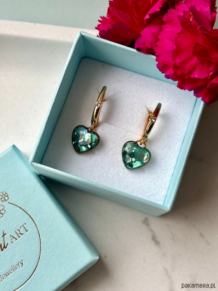 Ręcznie wykonane wiszące kolczyki z zawieszkami w kształcie serca. Biżuteria wykonana jest z wyselekcjonowanych kawałków muszli, drobinek szkła w odcieniach głębokiej zieleni. Kolczyki pięknie prezentują się na uchu, są efektowne i wyjątkowo lekkie co stanowi komfort noszenia.
