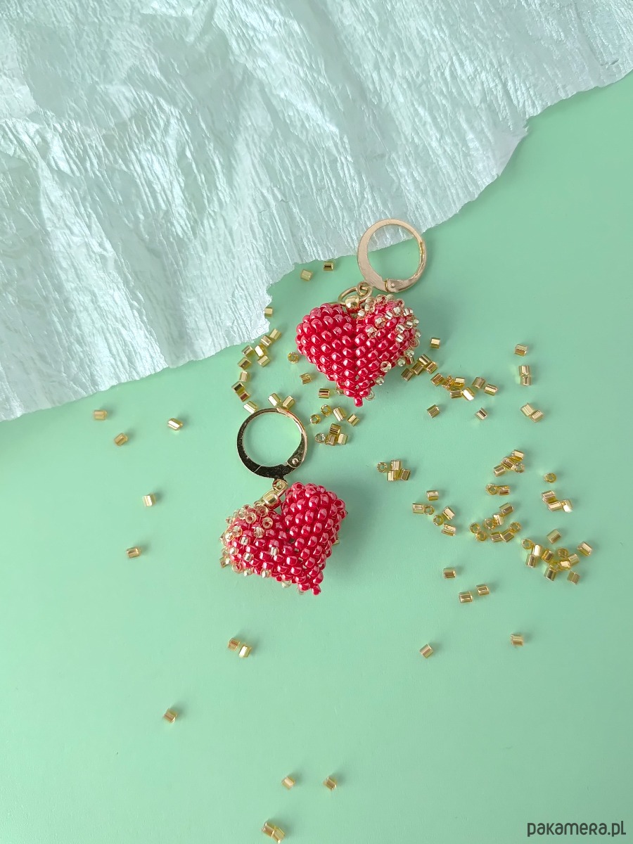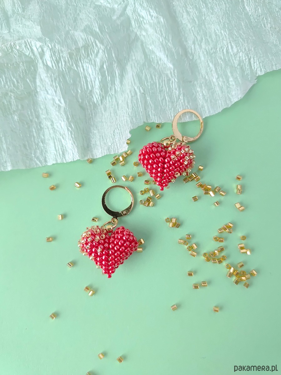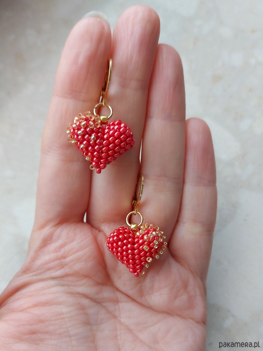 Czerwone jak emocje, z nutką złota – te kolczyki w kształcie serc zostały wykonane ręcznie, koralik po koraliku. Klasyczna czerwień przeplata się tu z delikatnym połyskiem złotych koralików, tworząc efekt, który przyciąga wzrok, ale nie dominuje.