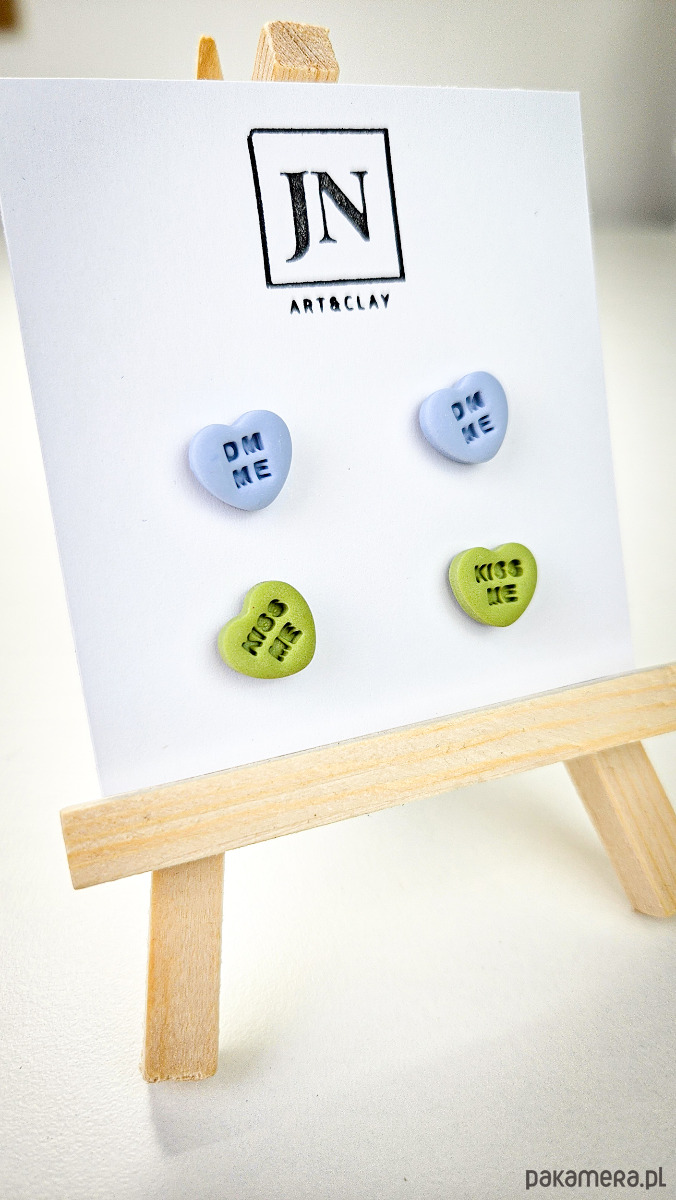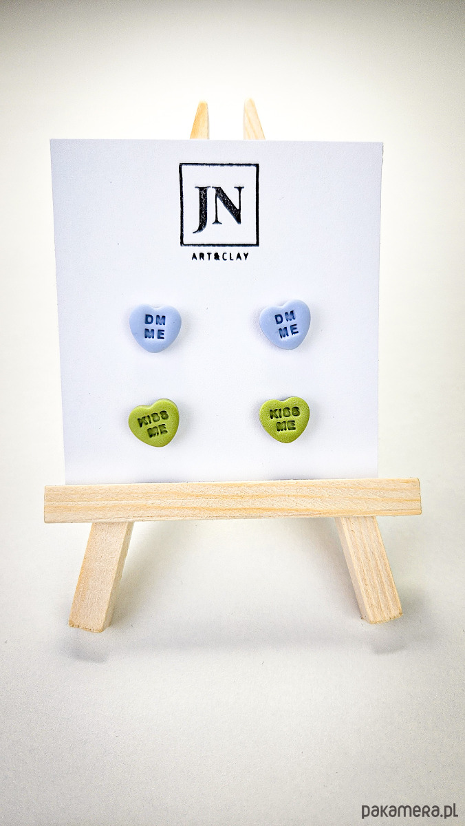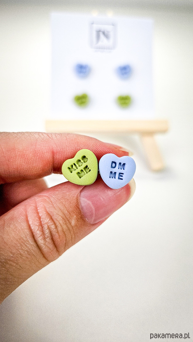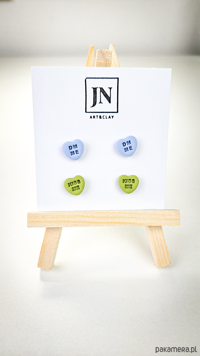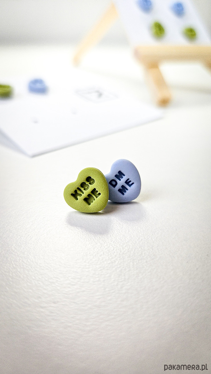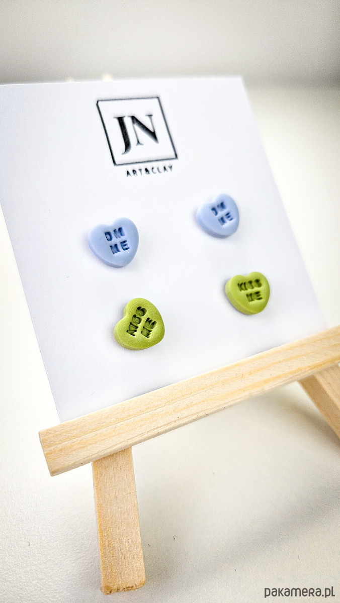 Zestaw 2 par kolczyków w kształcie serca. Te urocze kolczyki są inspirowane walentynkowymi cukierkami. Serduszka są ręcznie wykonane z gliny polimerowej w różnych kolorach. Zapinane na sztyft z barankiem ze stali chirurgicznej. Jest to idealny prezent dla niej na walentynki. Możesz nosić je parami lub mieszać kolory. W mojej ofercie znajdziesz różne wersje kolorystyczne tych kolczyków z różnymi napisami. Idealne dla fanek kolorów i małych słodkich, uroczych kolczyków i dodatków.