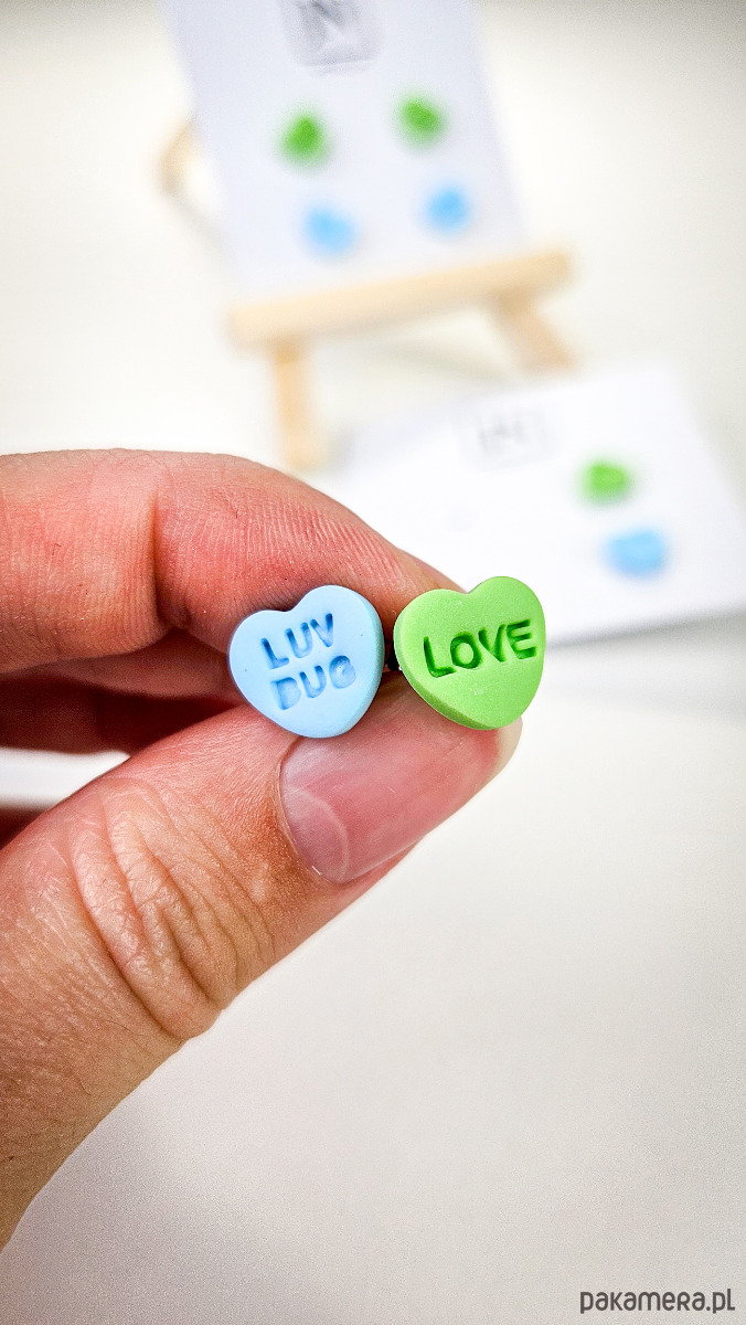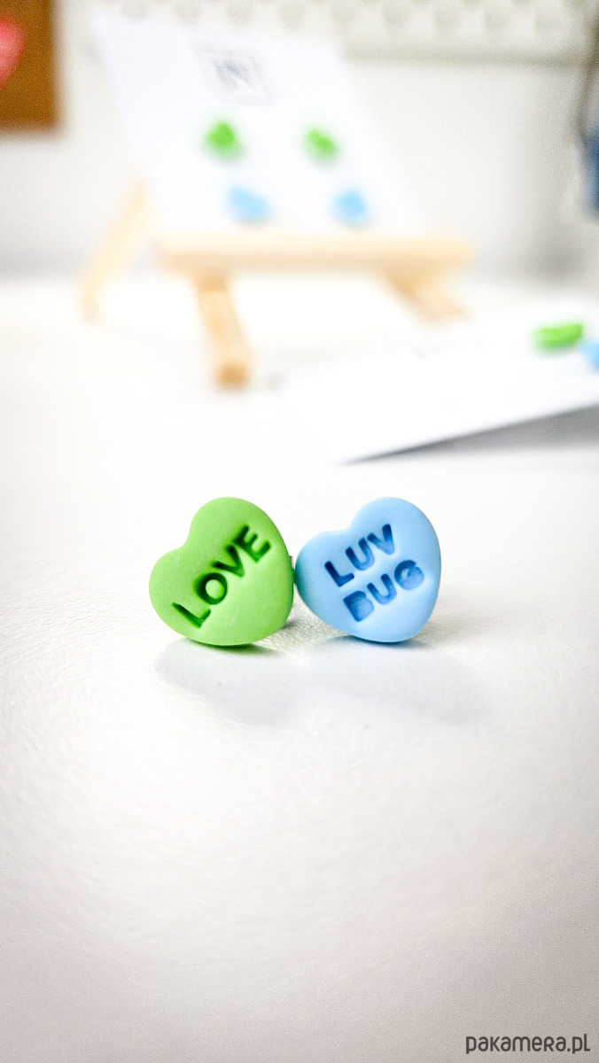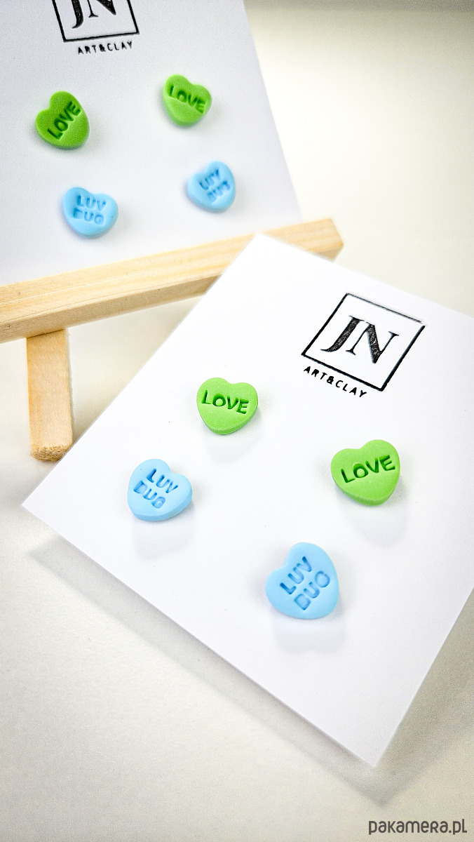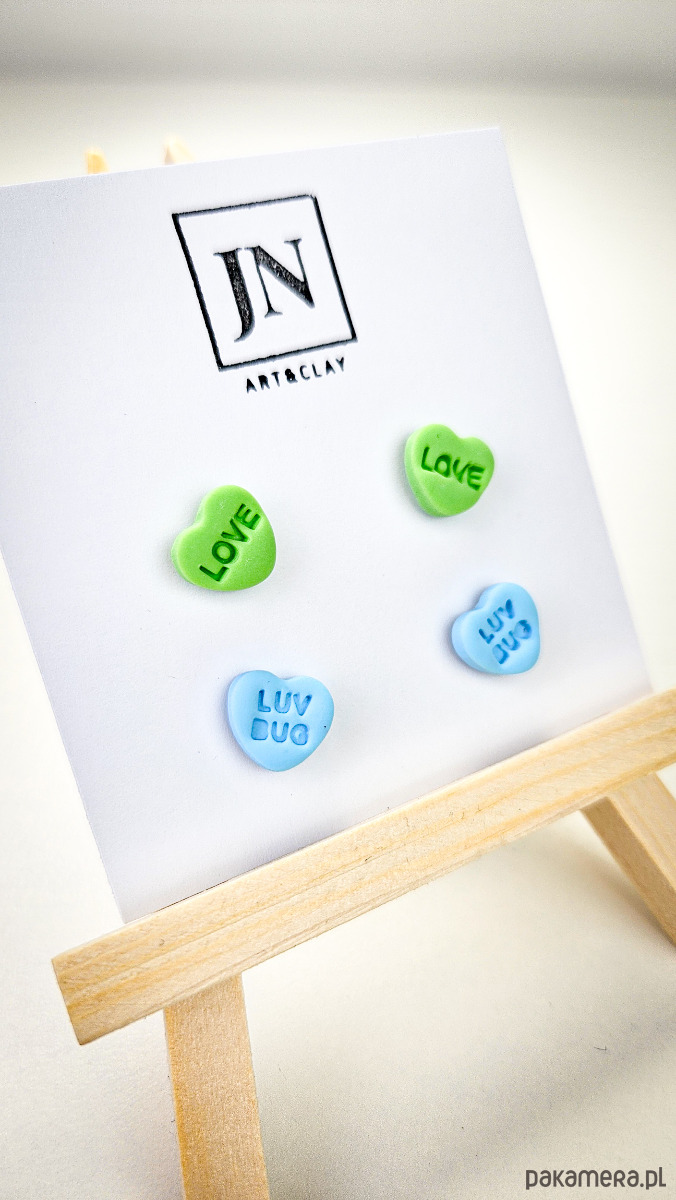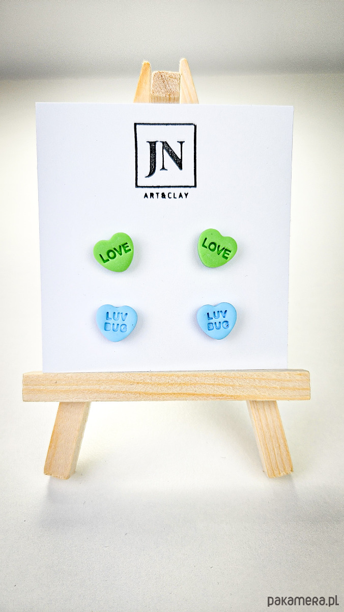 Zestaw 2 par kolczyków w kształcie serca. Te urocze kolczyki są inspirowane walentynkowymi cukierkami. Serduszka są ręcznie wykonane z gliny polimerowej w różnych kolorach. Zapinane na sztyft z barankiem ze stali chirurgicznej. Jest to idealny prezent dla niej na walentynki. Możesz nosić je parami lub mieszać kolory. W mojej ofercie znajdziesz różne wersje kolorystyczne tych kolczyków z różnymi napisami. Idealne dla fanek kolorów i małych słodkich, uroczych kolczyków i dodatków.