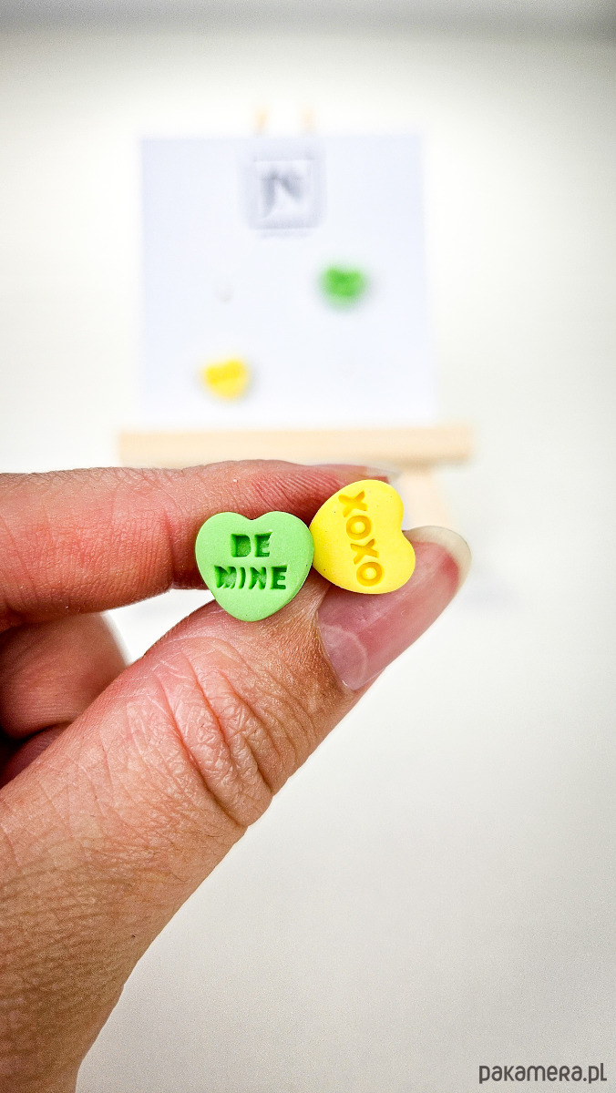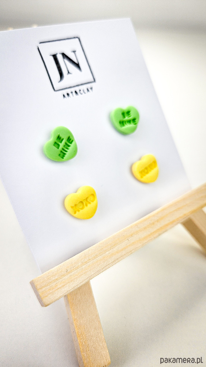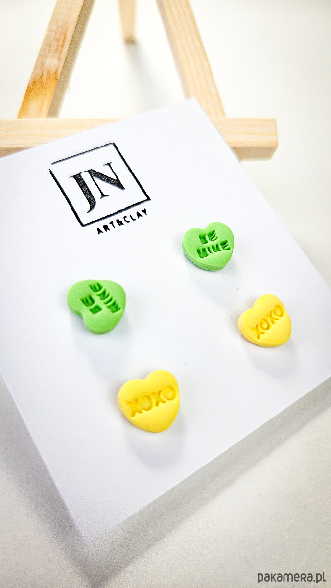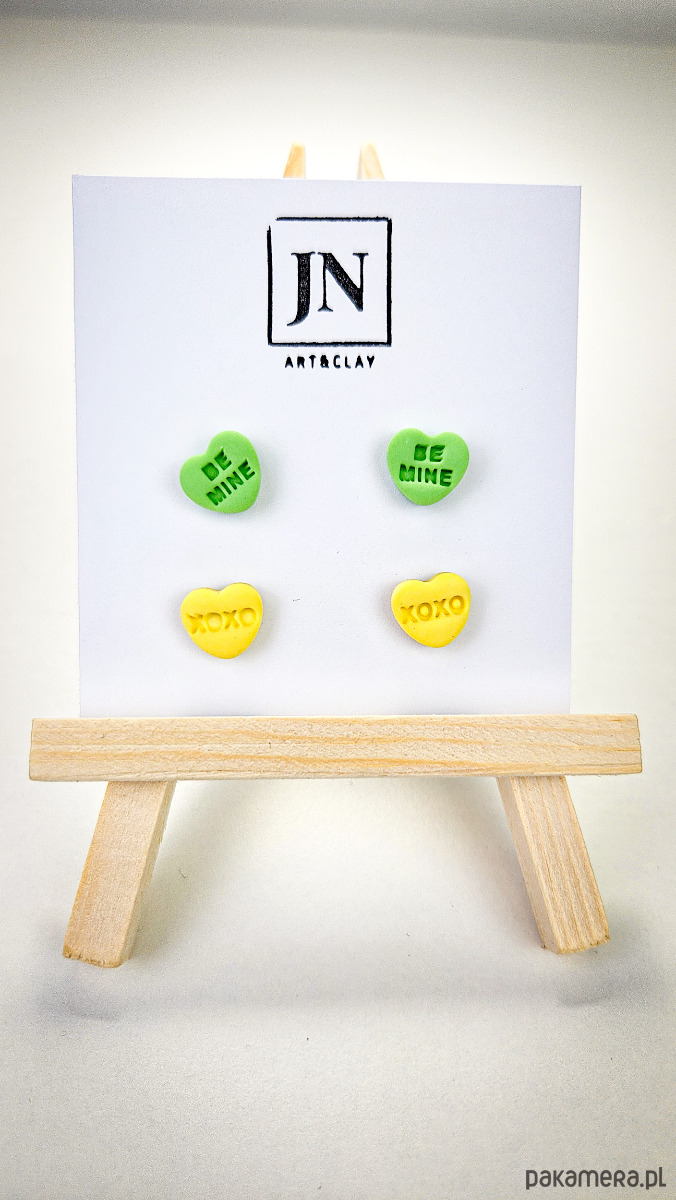 Zestaw 2 par kolczyków w kształcie serca. Te urocze kolczyki są inspirowane walentynkowymi cukierkami. Serduszka są ręcznie wykonane z gliny polimerowej w różnych kolorach. Zapinane na sztyft z barankiem ze stali chirurgicznej. Jest to idealny prezent dla niej na walentynki. Możesz nosić je parami lub mieszać kolory. W mojej ofercie znajdziesz różne wersje kolorystyczne tych kolczyków z różnymi napisami. Idealne dla fanek kolorów i małych słodkich, uroczych kolczyków i dodatków.