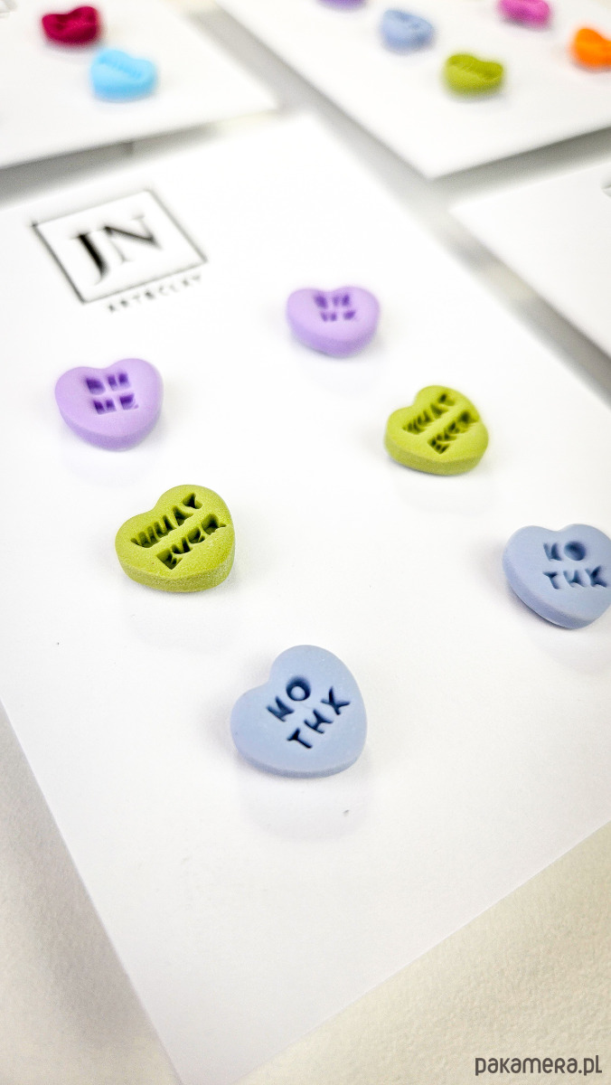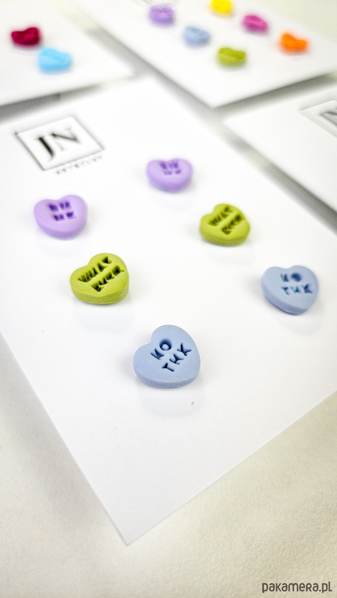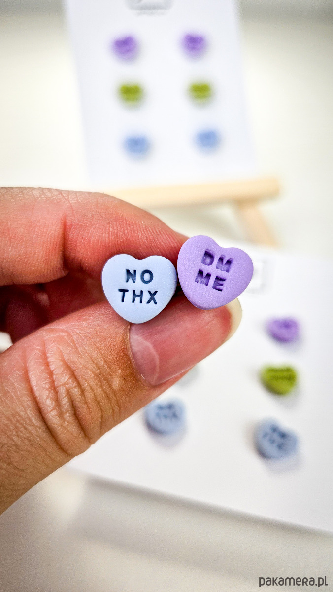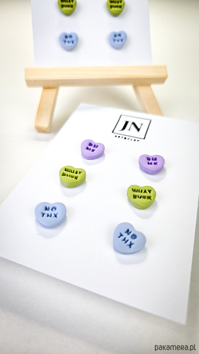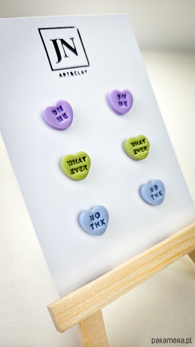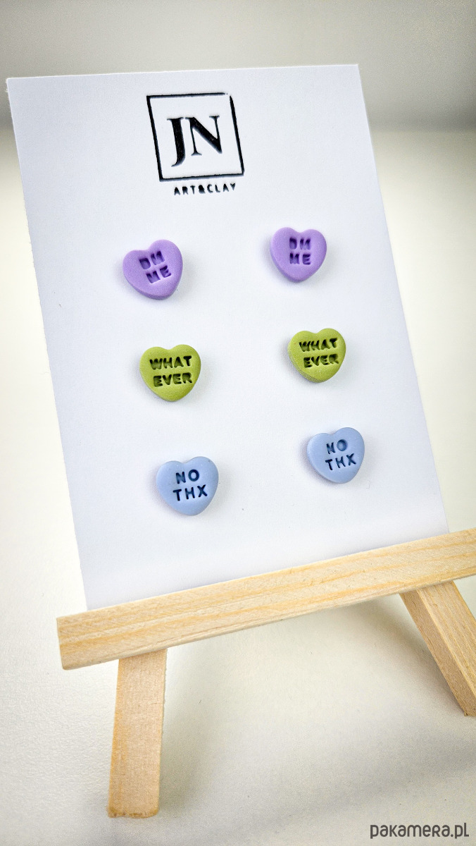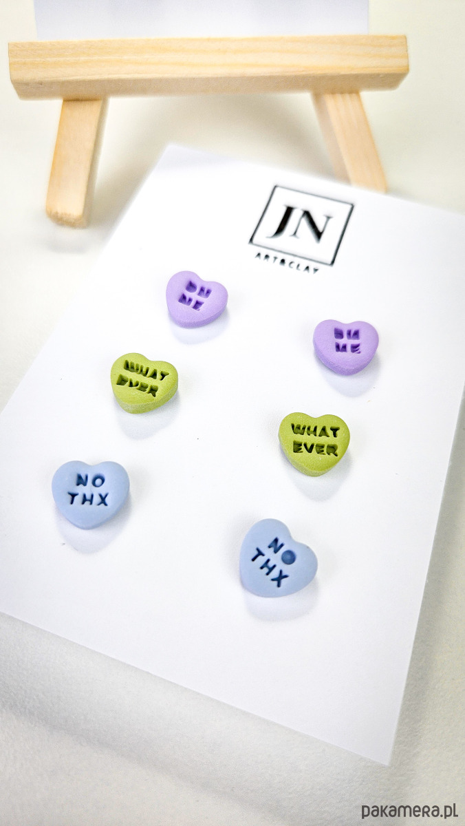 Zestaw 3 par kolczyków w kształcie serca. Te urocze kolczyki są inspirowane walentynkowymi cukierkami. Serduszka są ręcznie wykonane z gliny polimerowej w różnych kolorach. Zapinane na sztyft z barankiem ze stali chirurgicznej. Jest to idealny prezent dla niej na walentynki. Kolczyki można nosić parami lub mieszać ze sobą. W mojej ofercie znajdziesz różne wersje kolorystyczne tych kolczyków z różnymi napisami. Idealne dla fanek kolorów i małych słodkich, uroczych kolczyków i dodatków.