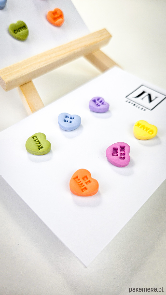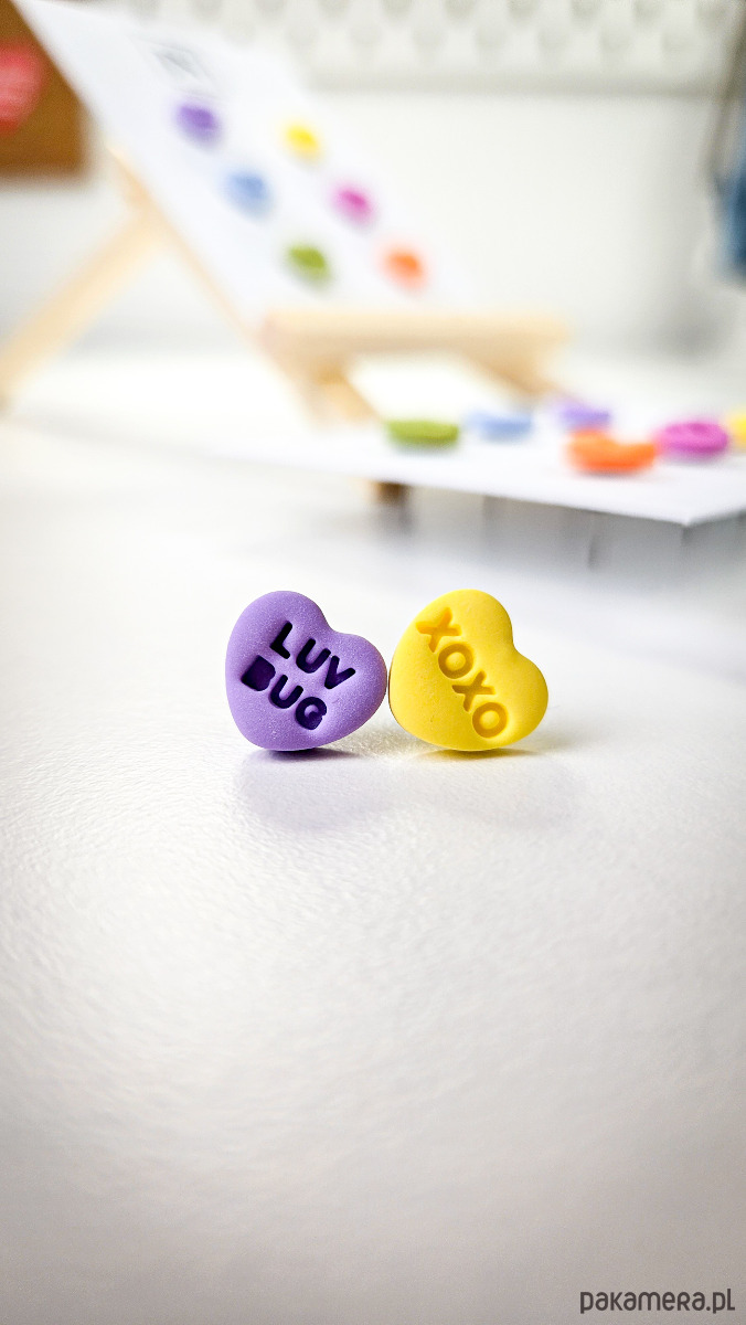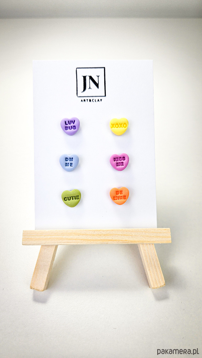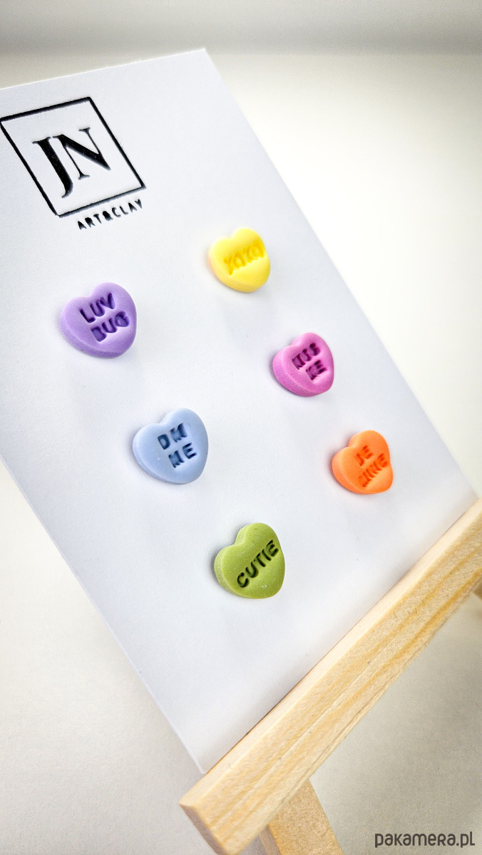 Zestaw 3 par kolczyków w kształcie serca. Te urocze kolczyki są inspirowane walentynkowymi cukierkami. Serduszka są ręcznie wykonane z gliny polimerowej w różnych kolorach. Zapinane na sztyft z barankiem ze stali chirurgicznej. Jest to idealny prezent dla niej na walentynki. Każdy kolczyk jest w innym kolorze, dzięki temu możesz je nosić w różnych kombinacjach w zależności od nastroju i stylizacji. W mojej ofercie znajdziesz różne wersje kolorystyczne tych kolczyków z różnymi napisami. Idealne dla fanek kolorów i małych słodkich, uroczych kolczyków i dodatków.