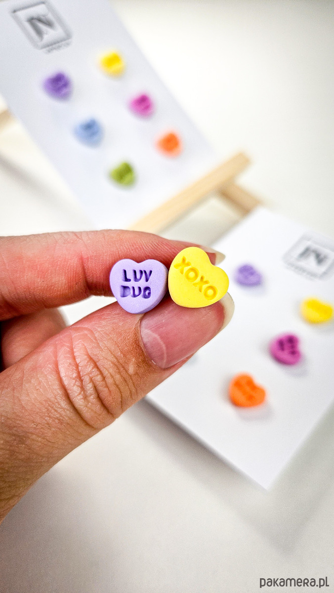 Napisy na kolczykach: Be mine, DM ME, Kiss me, Cutie, XOXO, Luv Bug