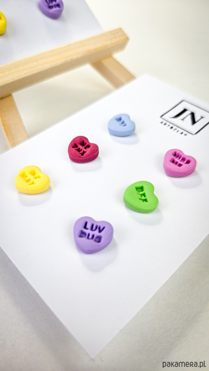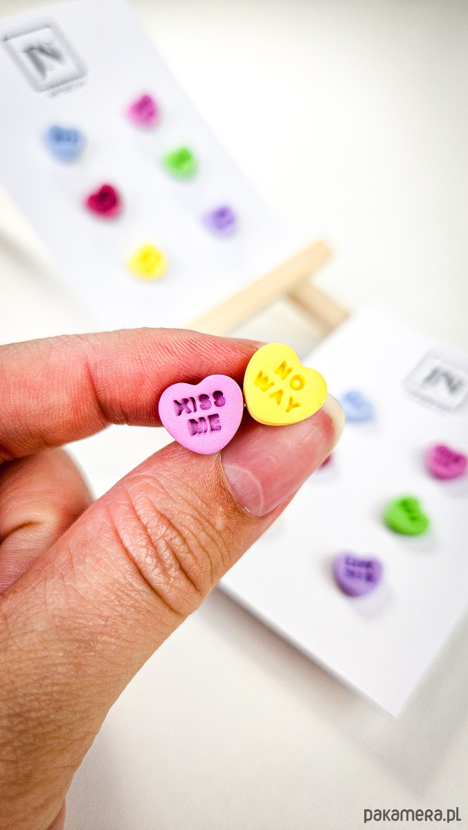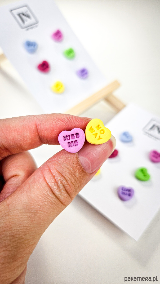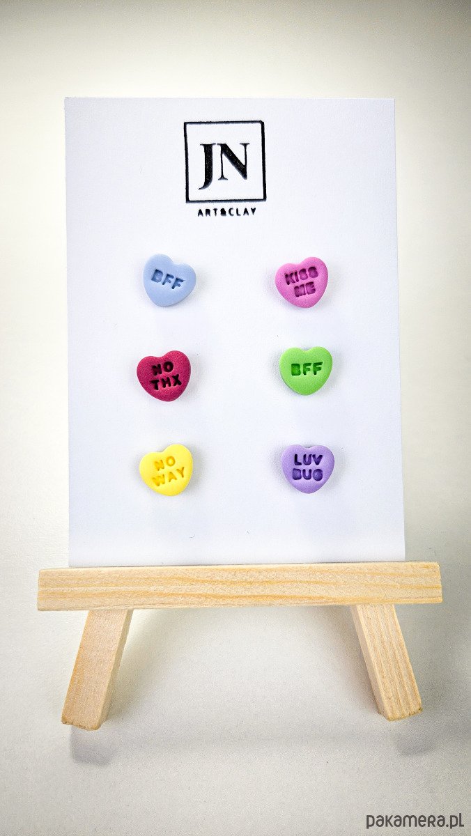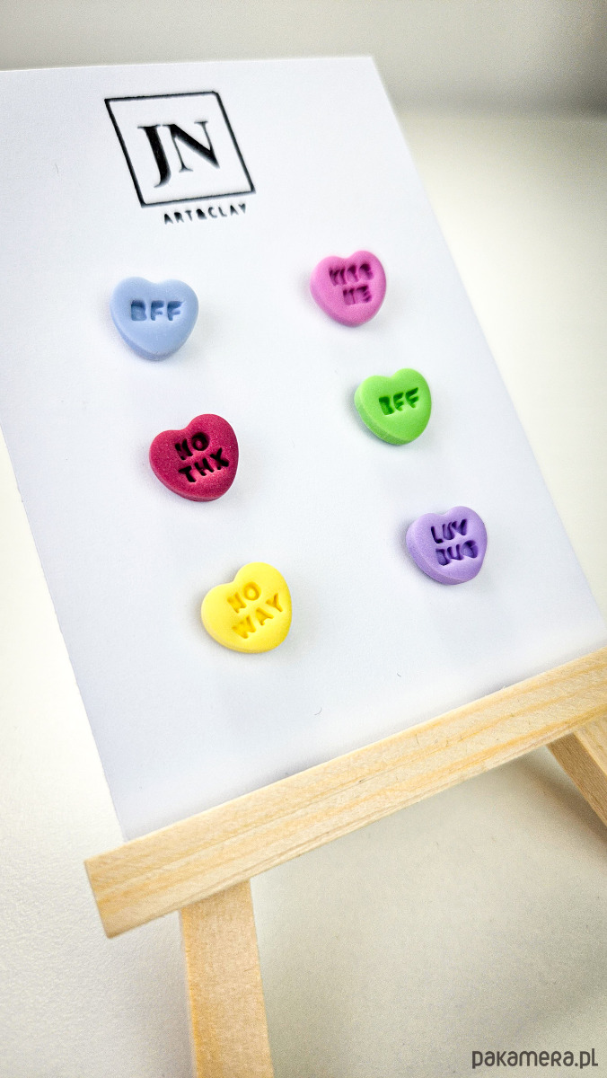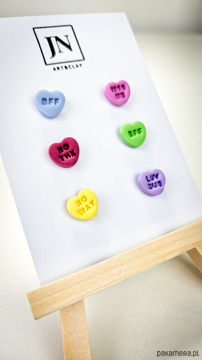 Zestaw 3 par kolczyków w kształcie serca. Te urocze kolczyki są inspirowane walentynkowymi cukierkami. Serduszka są ręcznie wykonane z gliny polimerowej w różnych kolorach. Zapinane na sztyft z barankiem ze stali chirurgicznej. Jest to idealny prezent dla niej na walentynki. Każdy kolczyk jest w innym kolorze, dzięki temu możesz je nosić w różnych kombinacjach w zależności od nastroju i stylizacji. W mojej ofercie znajdziesz różne wersje kolorystyczne tych kolczyków z różnymi napisami. Idealne dla fanek kolorów i małych słodkich, uroczych kolczyków i dodatków.