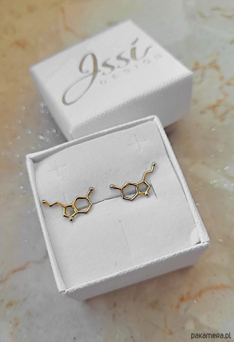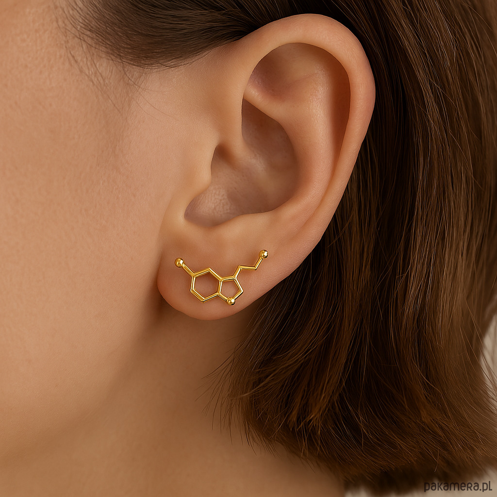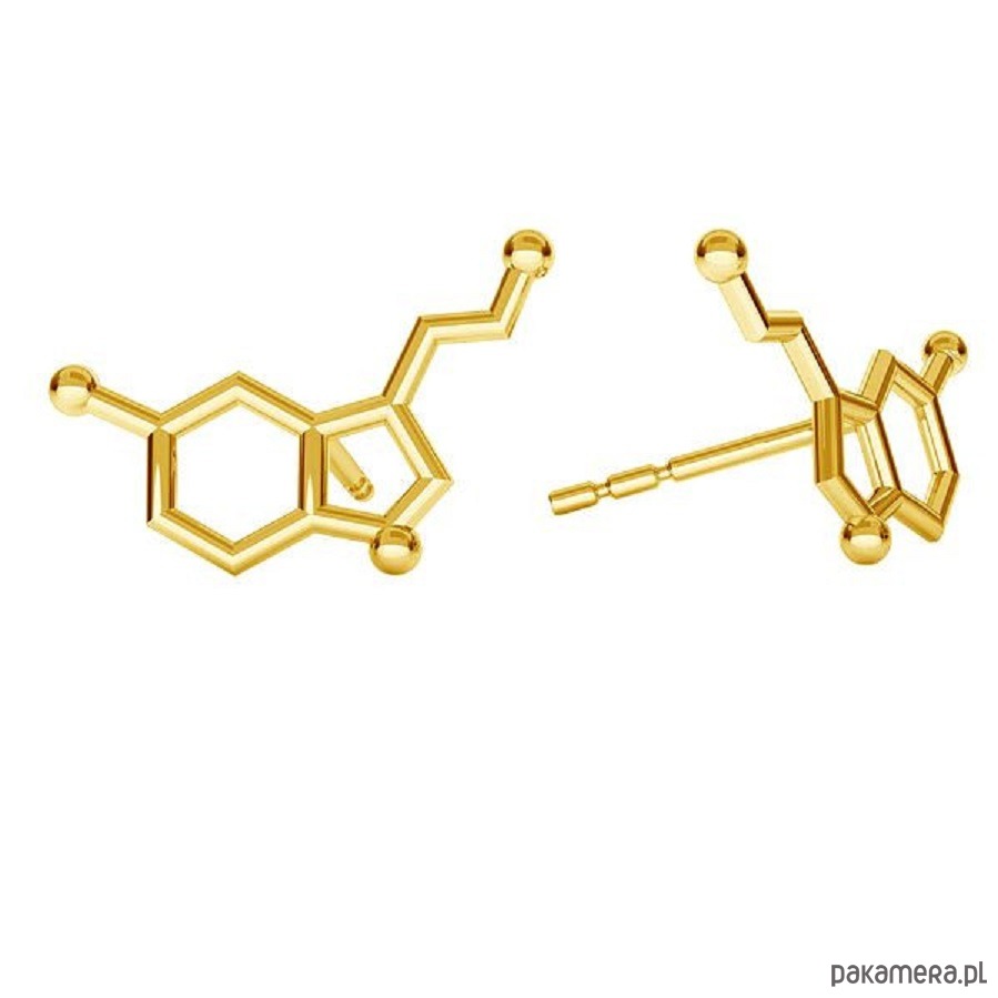 Kolczyki zapinane na sztyfty, w kształcie wzoru molekularnego serotoniny.