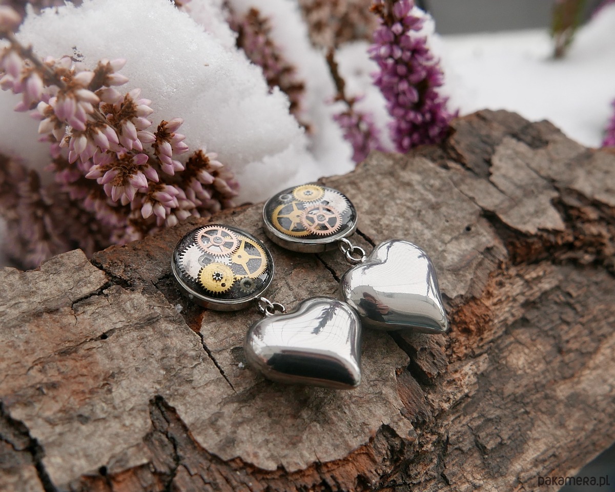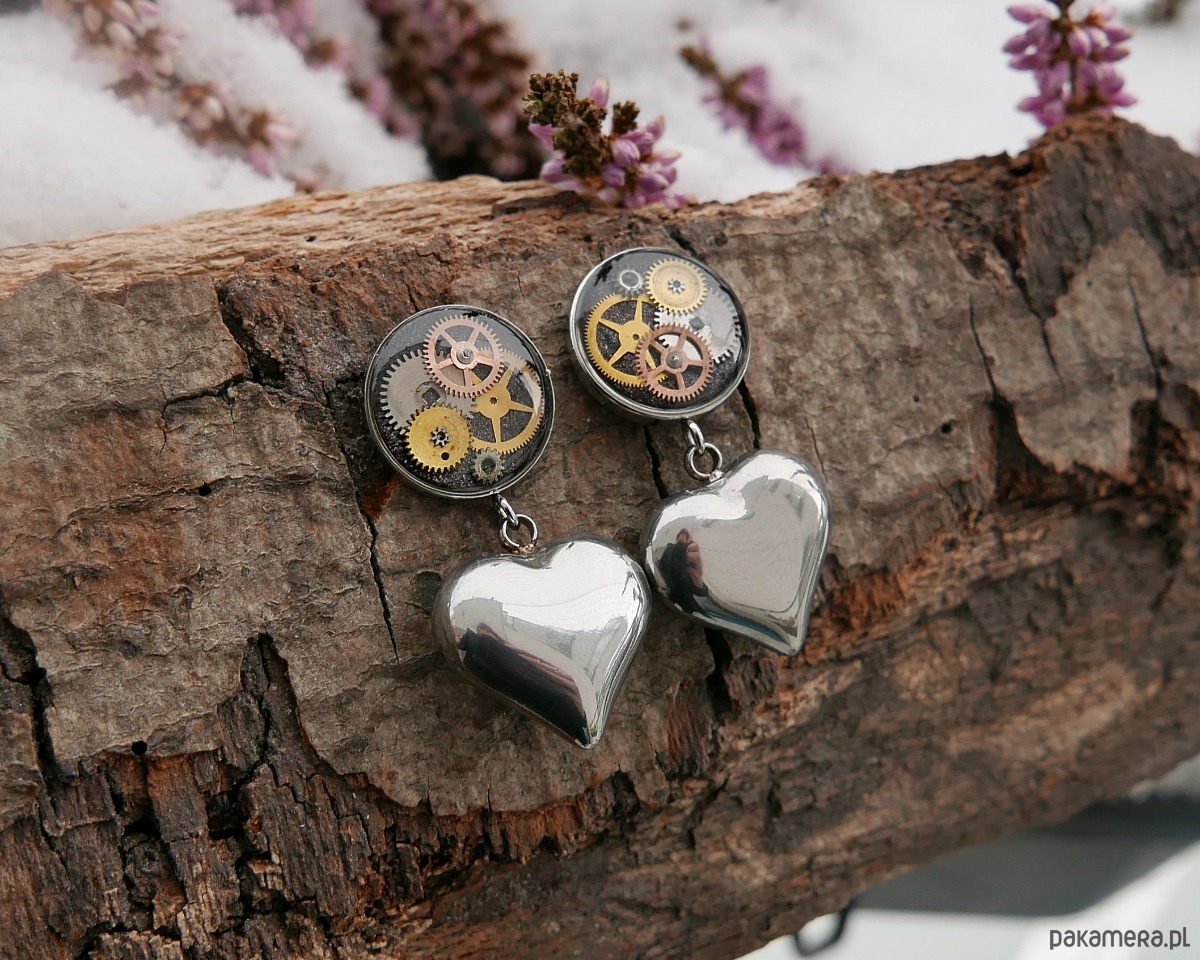 Kolczyki na sztyftach, z miniaturowymi częściami zegarka pod żywicą epoksydową.