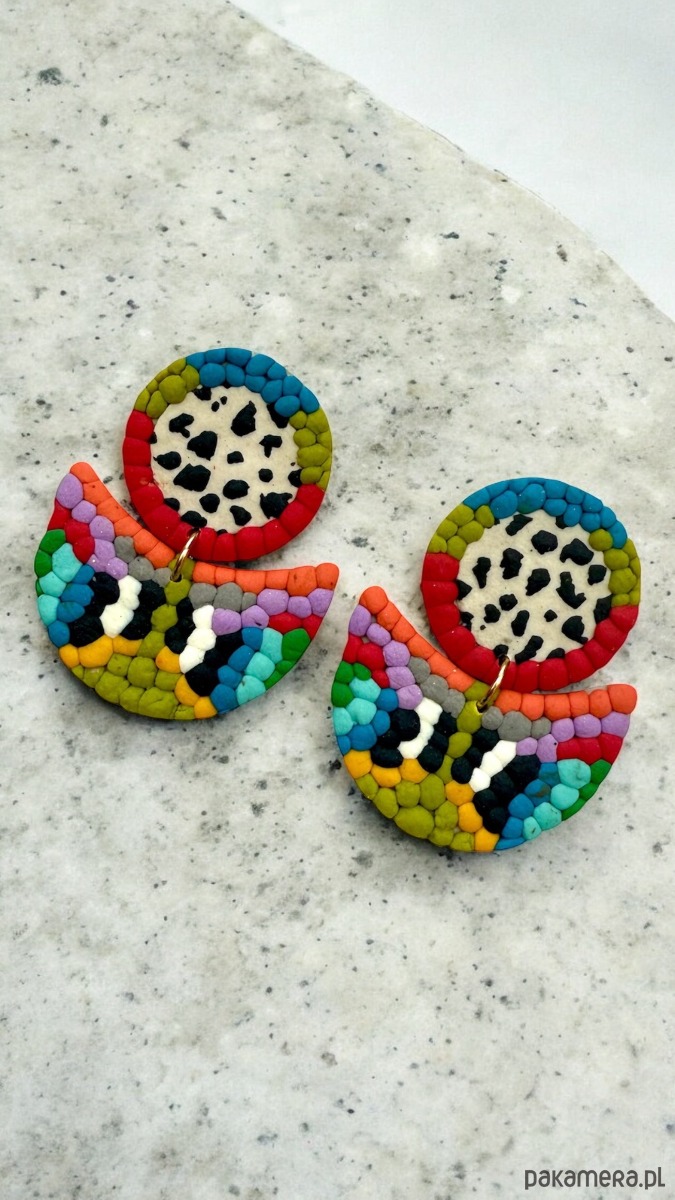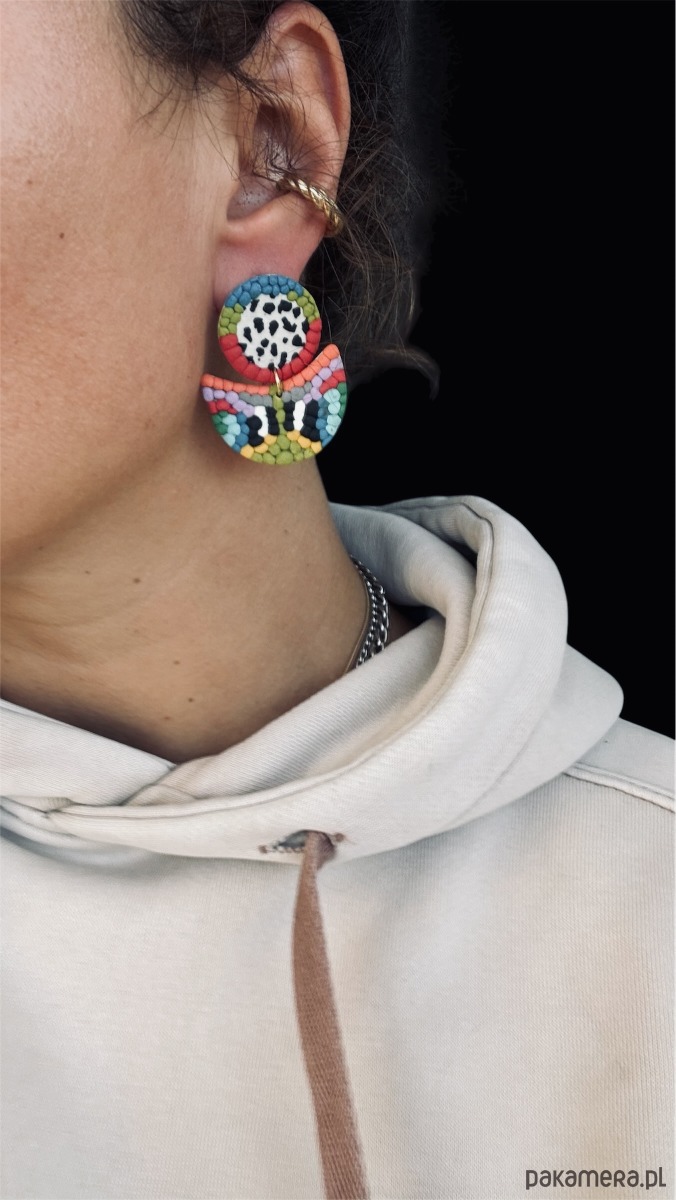 Oryginalne kolczyki wykonane ręcznie z dbałością o szczegóły z profesjonalnej glinki polimerowej, wypalane w piecu i szlifowane w domowej pracowni. Każda para kolczyków jest niepowtarzalna i wyjątkowa. Kolczyki są bardzo lekkie i wygodne, nie obciążają płatka ucha i przyciągają spojrzenia. Zapinane na sztyft ze stali chirurgicznej.