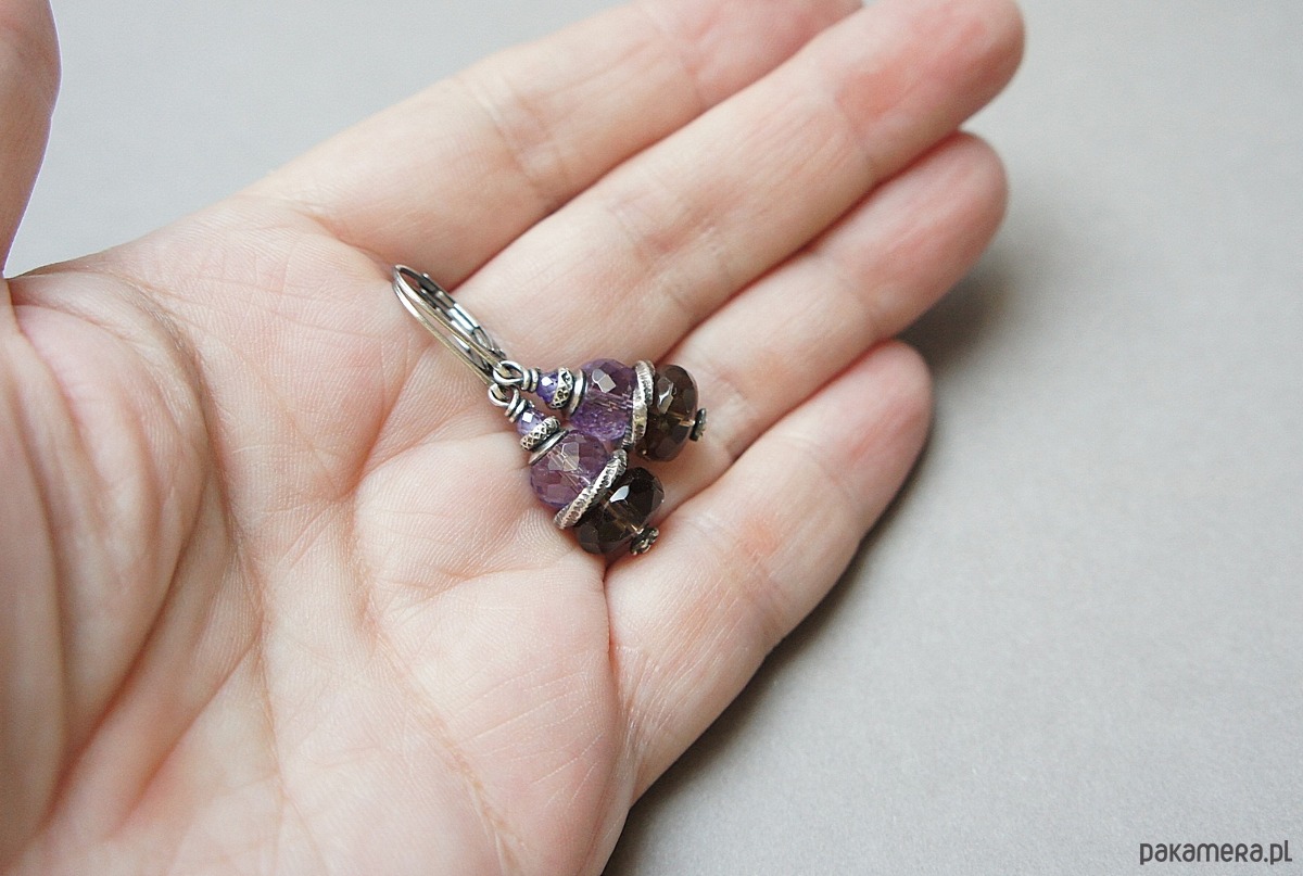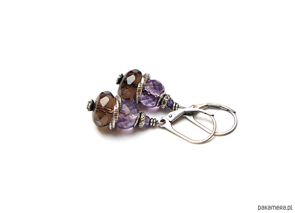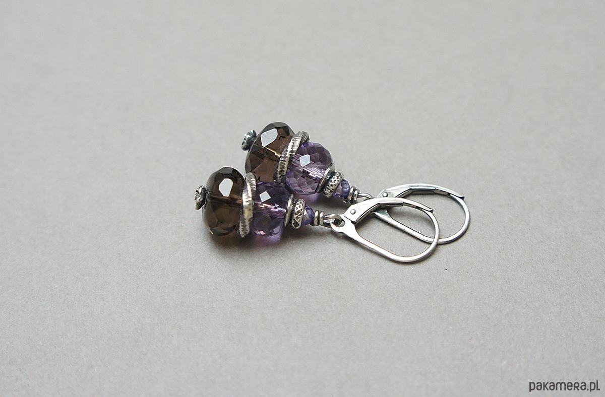 Kolczyki wykonane ze srebra [pr. 925] w połączeniu z fasetowanymi oponkami kwarcu dymnego [10mm], fasetowanymi ametystami [8mm] oraz cyrkoniami [3mm]. Całość oksydowana i przetarta. Całkowita długość kolczyków 4cm. Biżuteria ozdobnie zapakowana.