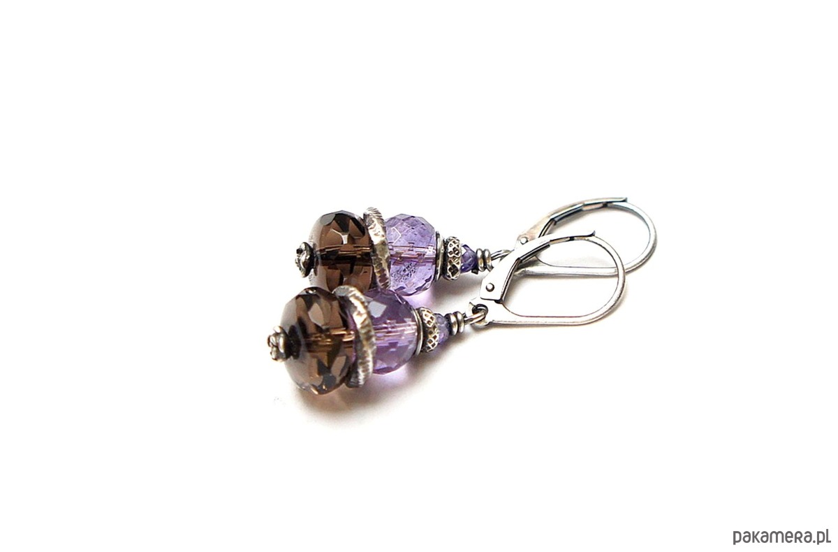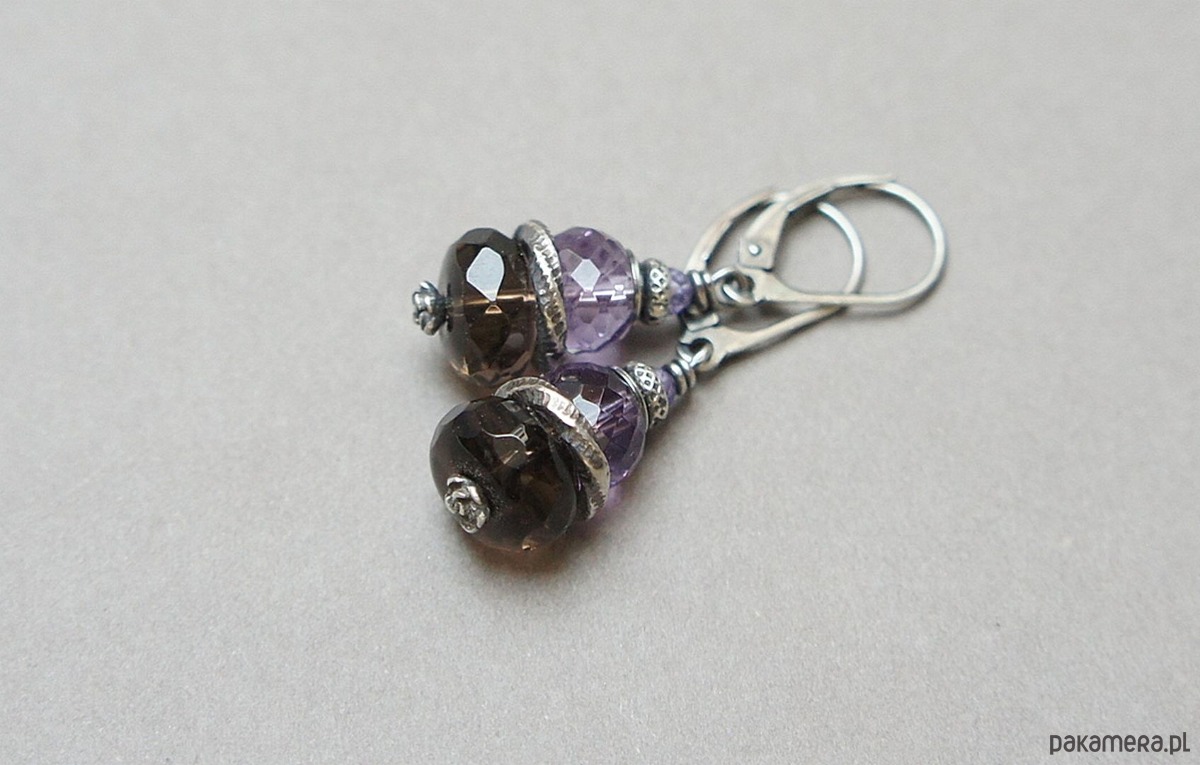 Kolczyki wykonane ze srebra [pr. 925] w połączeniu z fasetowanymi oponkami kwarcu dymnego [10mm], fasetowanymi ametystami [8mm] oraz cyrkoniami [3mm]. Całość oksydowana i przetarta. Całkowita długość kolczyków 4cm. Biżuteria ozdobnie zapakowana.