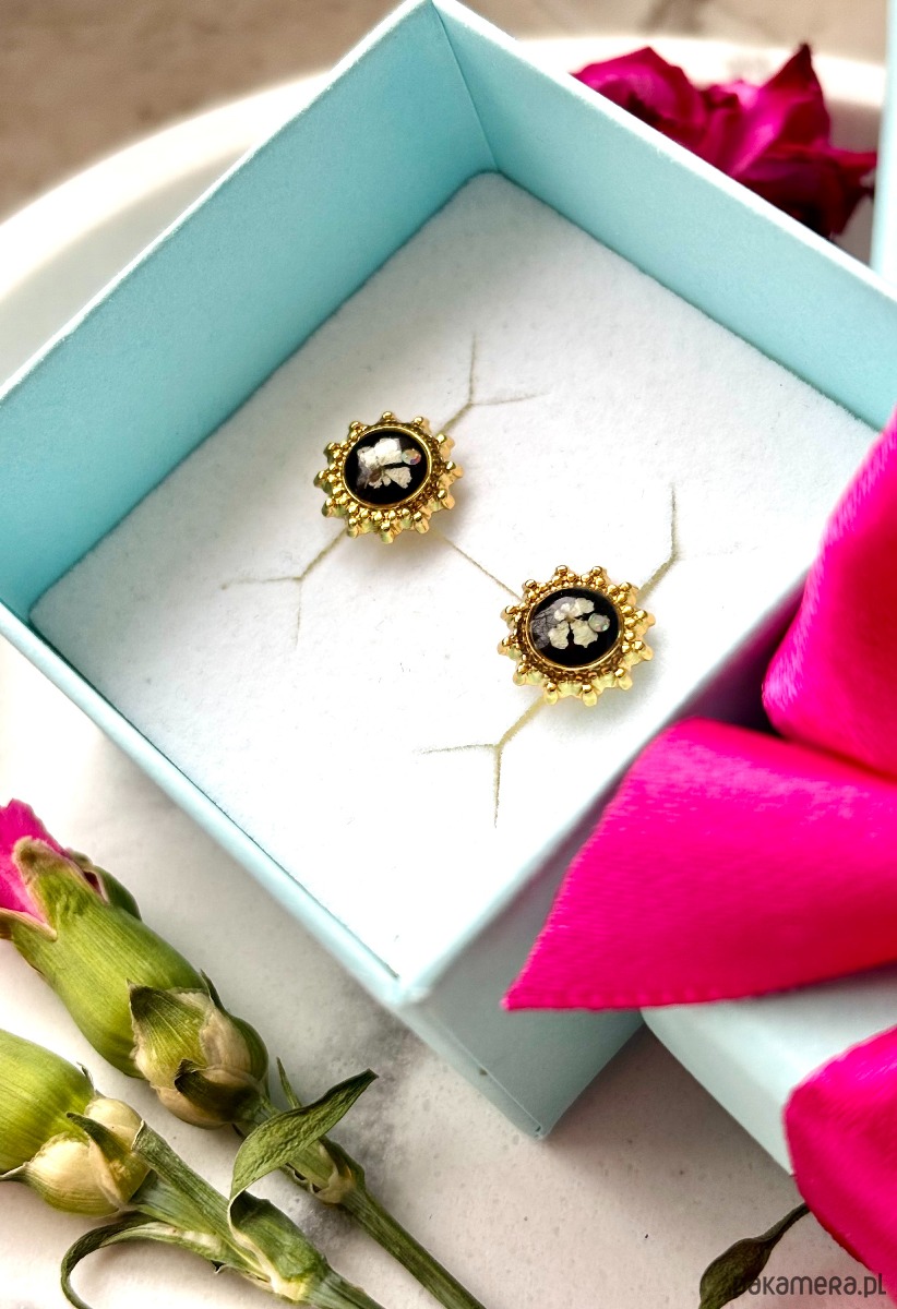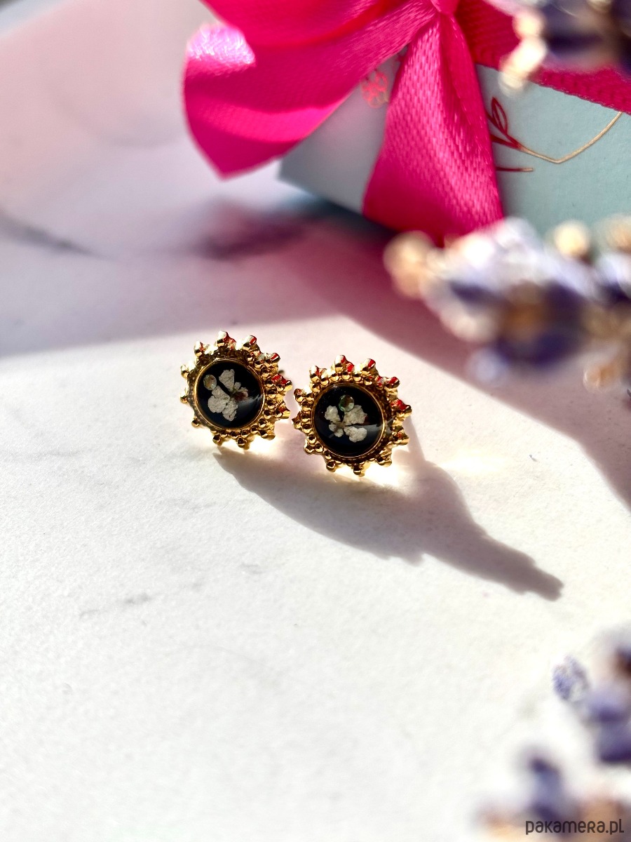 Ręcznie wykonane kolczyki z zawieszkami w kształcie słońca. Biżuteria wykonana jest z wyselekcjonowanych płatków kwiatu dzikiej marchwi i cyrkonii, na czarnym tle. Kolczyki pięknie prezentują się na uchu, są efektowne i wyjątkowo lekkie co stanowi komfort noszenia.