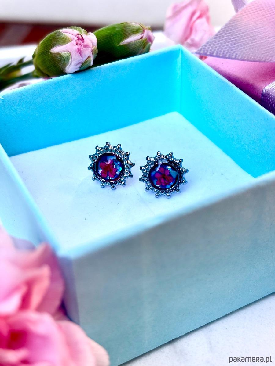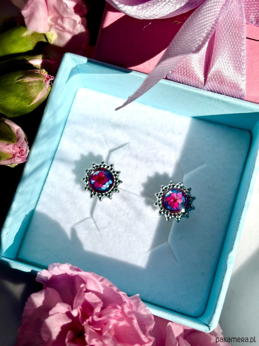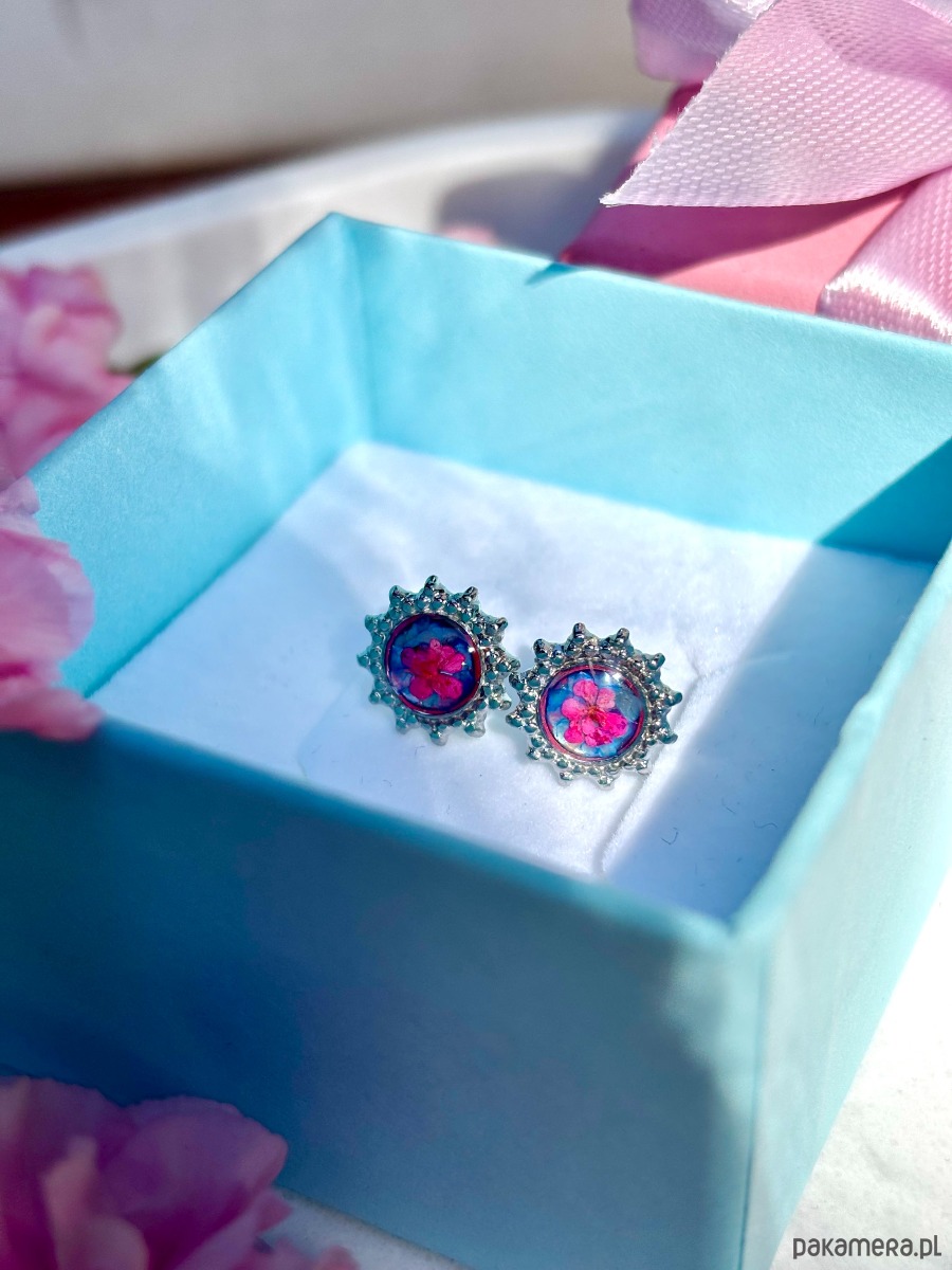 Ręcznie wykonane kolczyki z zawieszkami w kształcie słońca. Biżuteria wykonana jest z wyselekcjonowanych płatków kwiatu dzikiej marchwi oraz drobinek niebieskiej masy perłowej. Kolczyki pięknie prezentują się na uchu. Są subtelne a zarazem efektowne i wyjątkowo lekkie co stanowi komfort noszenia.