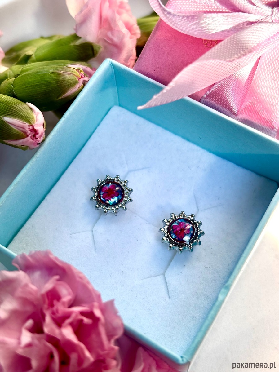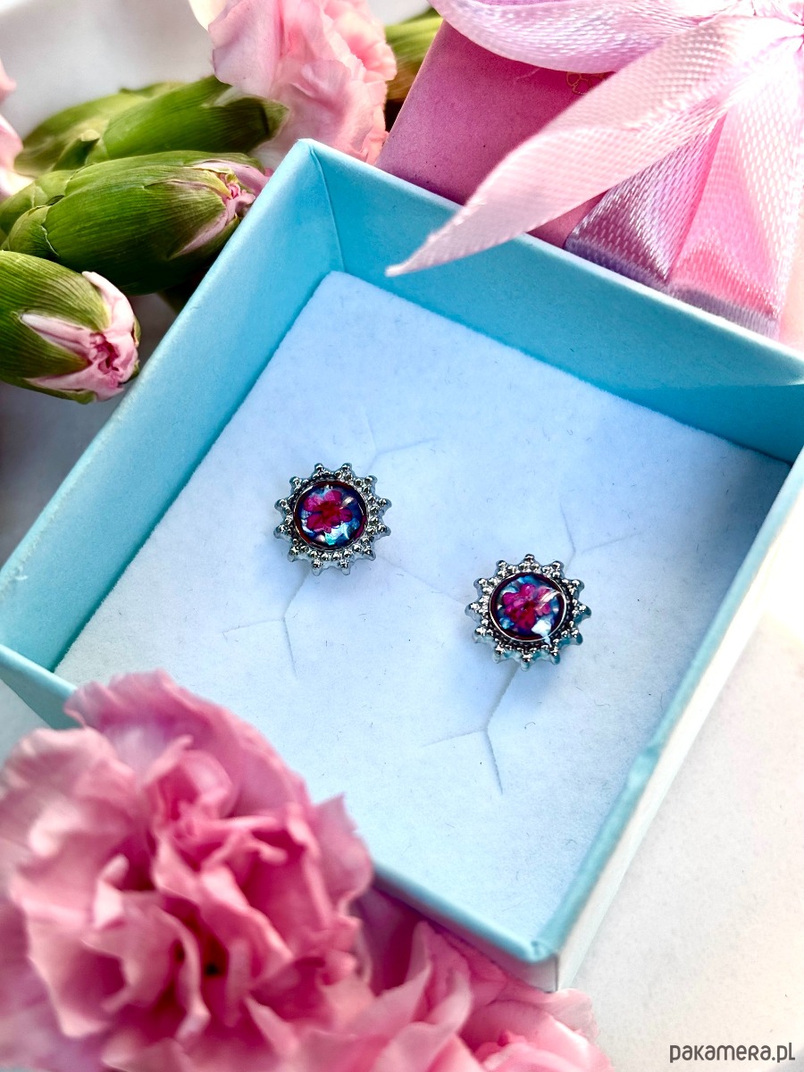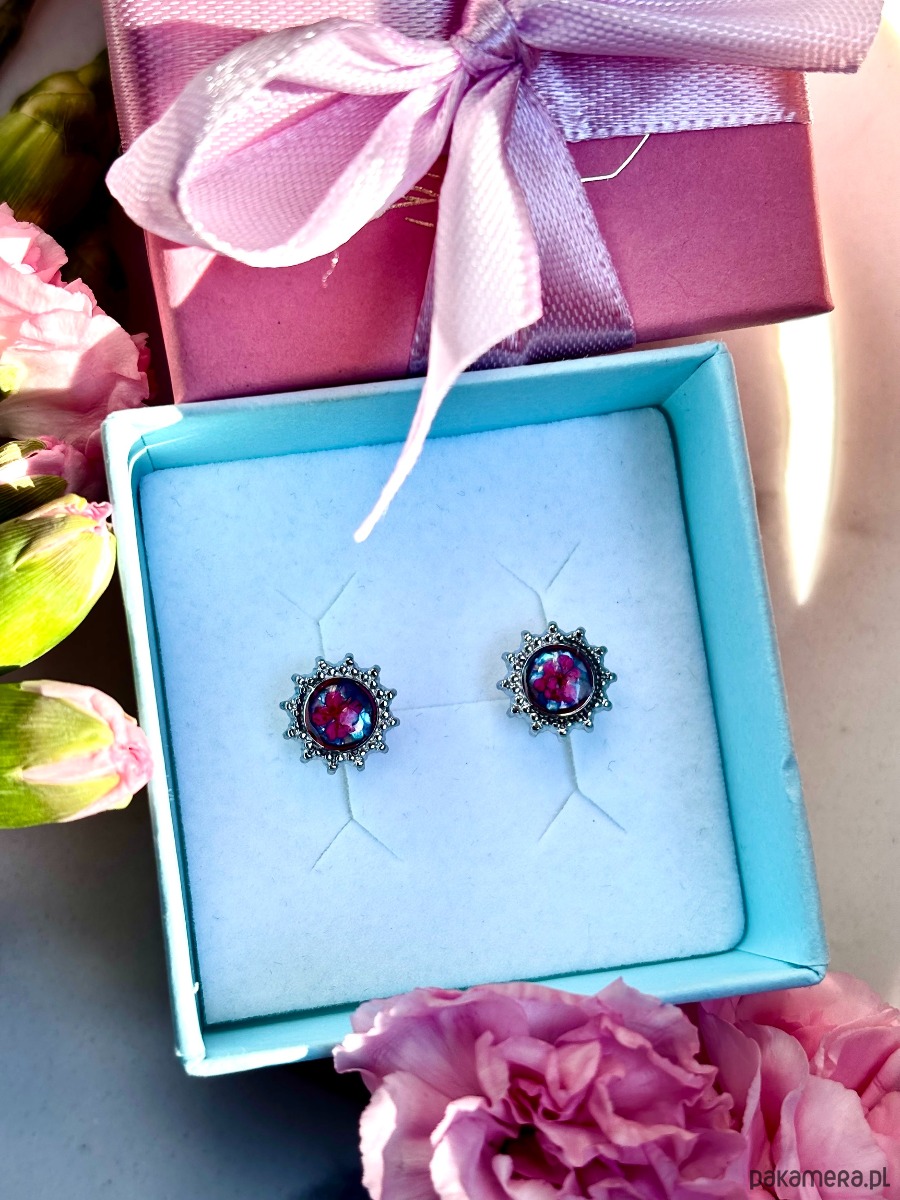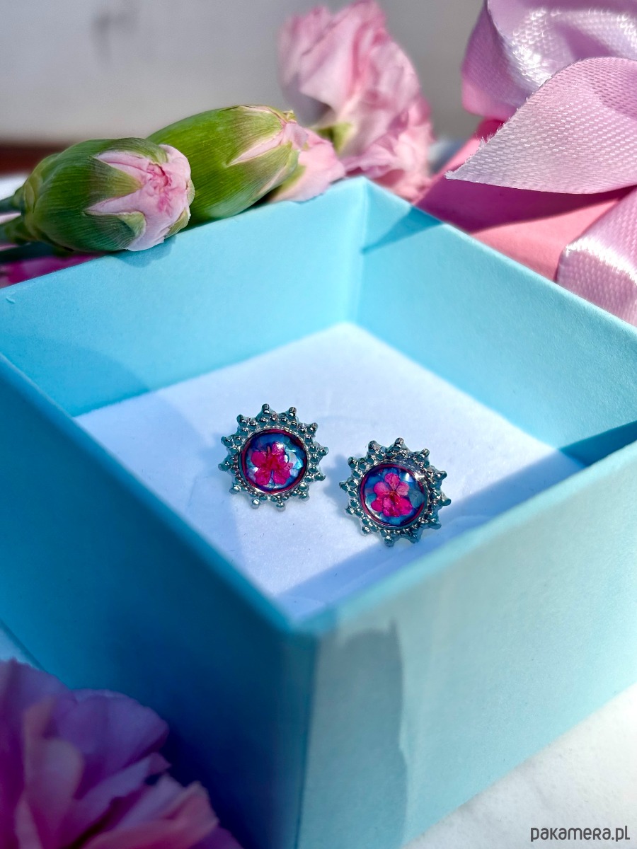 Ręcznie wykonane kolczyki z zawieszkami w kształcie słońca. Biżuteria wykonana jest z wyselekcjonowanych płatków kwiatu dzikiej marchwi oraz drobinek niebieskiej masy perłowej. Kolczyki pięknie prezentują się na uchu. Są subtelne a zarazem efektowne i wyjątkowo lekkie co stanowi komfort noszenia.