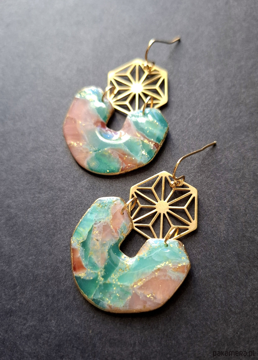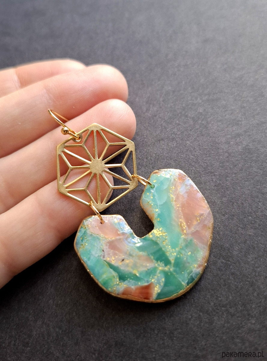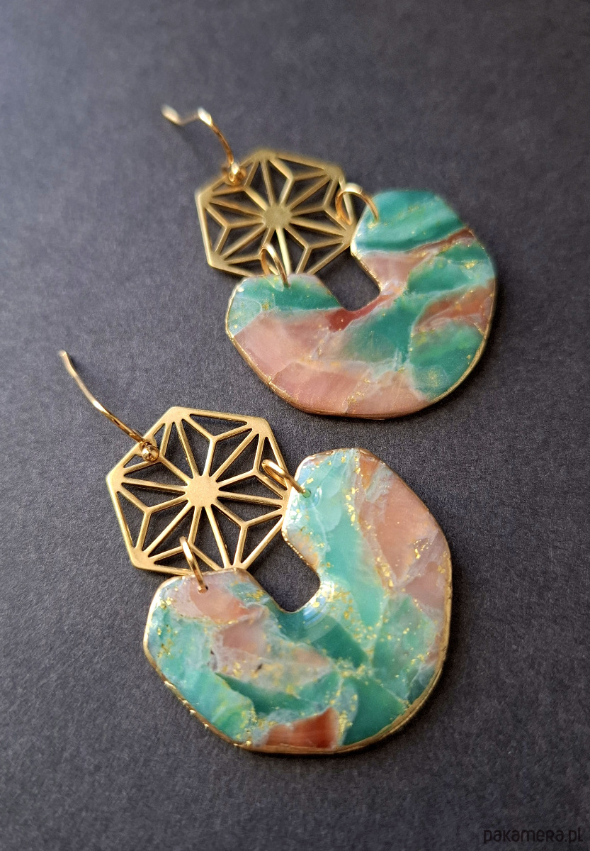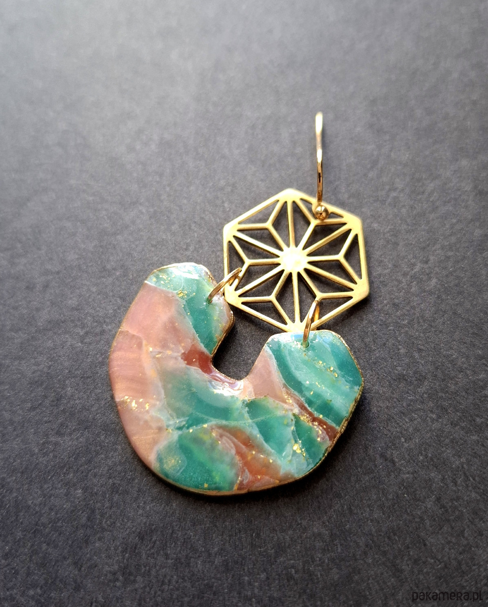 Kolczyki wiszące wykonane z wysokiej jakości glinki polimerowej z efektem półprzezroczystości i dodatkiem ozdobnych, ażurowych elementów z metalu. Jednostronne z prostymi, pozłacanymi i nieuczulającymi biglami. Wymiary: długość wraz z zapięciem: 6 x 3,4 cm. Wykonane w jedynym egzemplarzu.