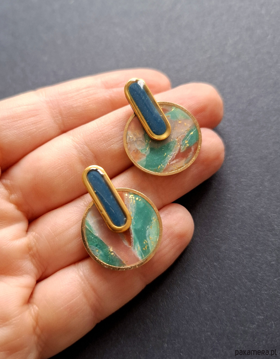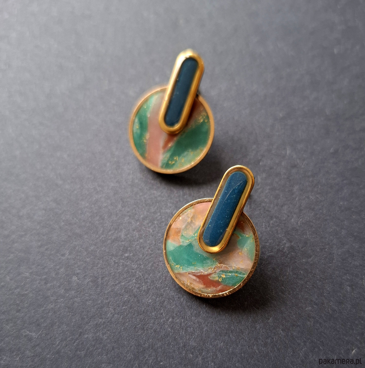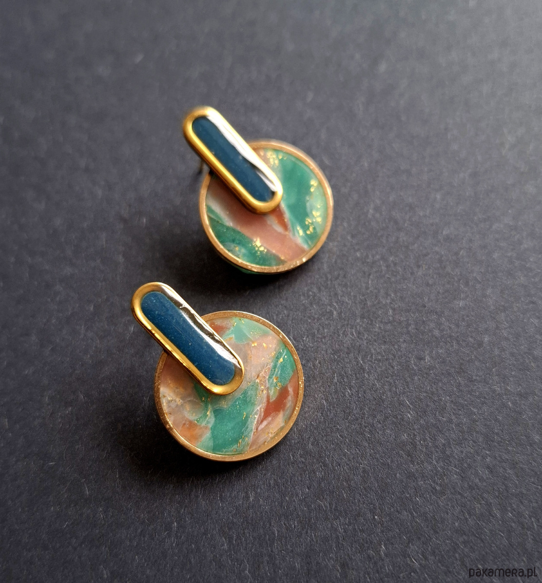 Kolczyki na sztyfty wykonane z wysokiej jakości glinki polimerowej z efektem półprzezroczystości i dodatkiem ozdobnych elementów metalowych. Jednostronne z pozłacanymi, nieuczulającymi sztyftami. Wymiary: 2,7 x 2 cm. Wykonane w jedynym egzemplarzu.