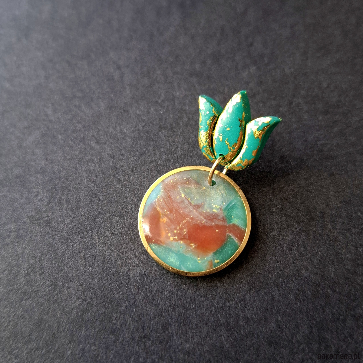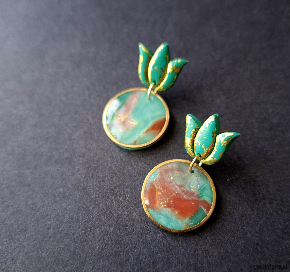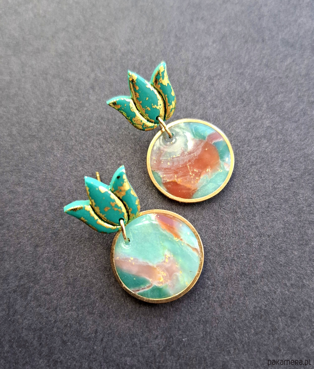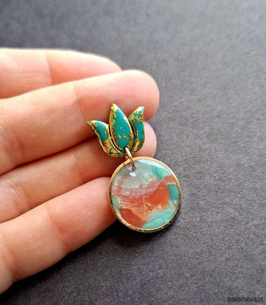 Kolczyki na sztyfty wykonane z wysokiej jakości glinki polimerowej z efektem półprzezroczystości. Jednostronne z pozłacanymi, nieuczulającymi sztyftami. Wymiary: 3,5 x 2 cm. Wykonane w jedynym egzemplarzu.
