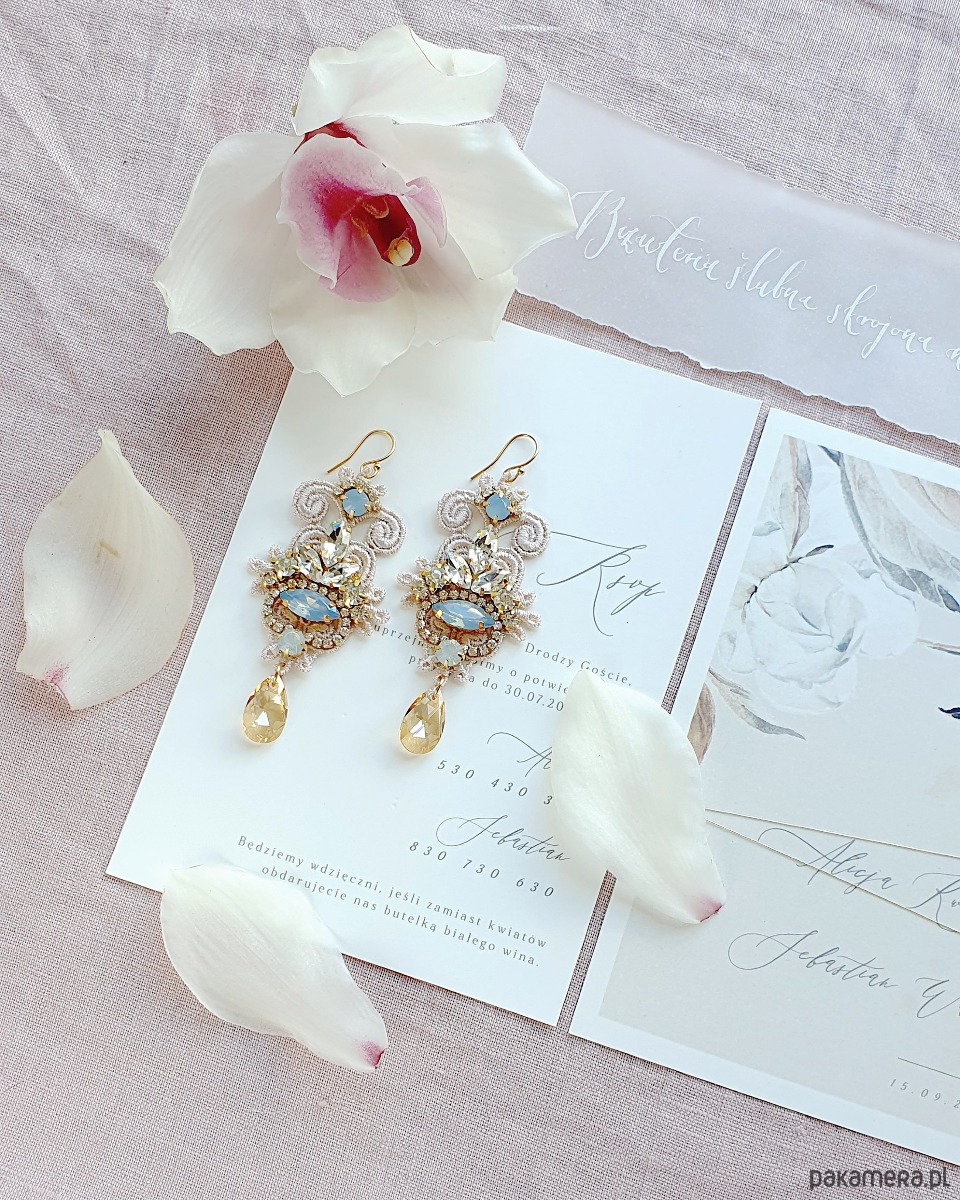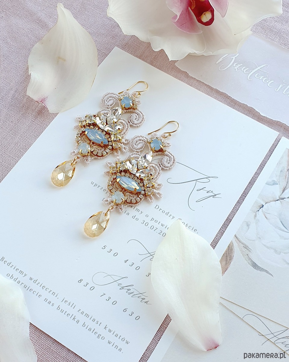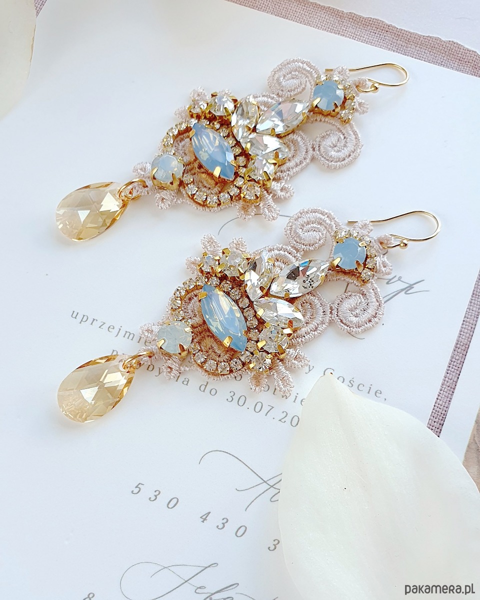 Ekskluzywne kolczyki ślubne wykonane haftem ręcznym z kamieni Swarovski oraz cyrkonii Preciosa na weneckich, złotych koronkach.