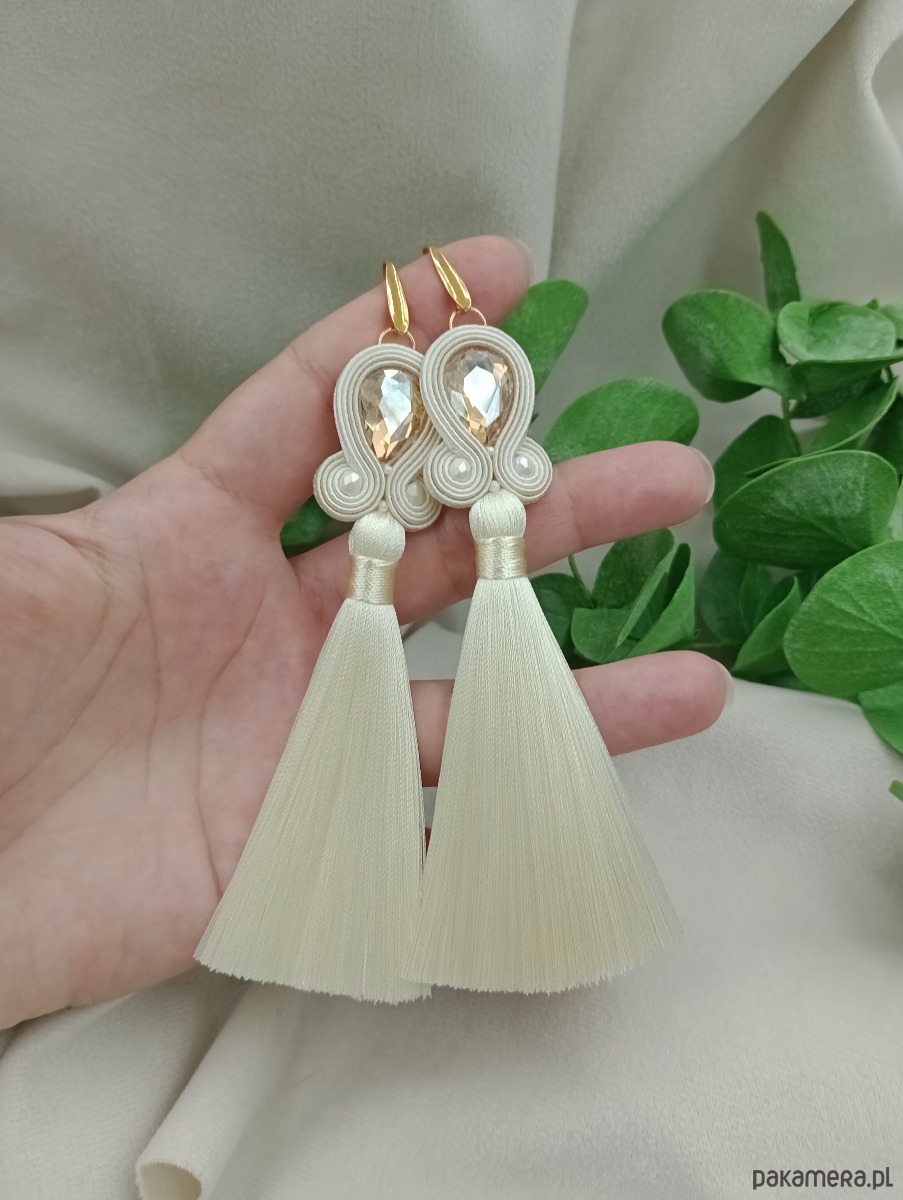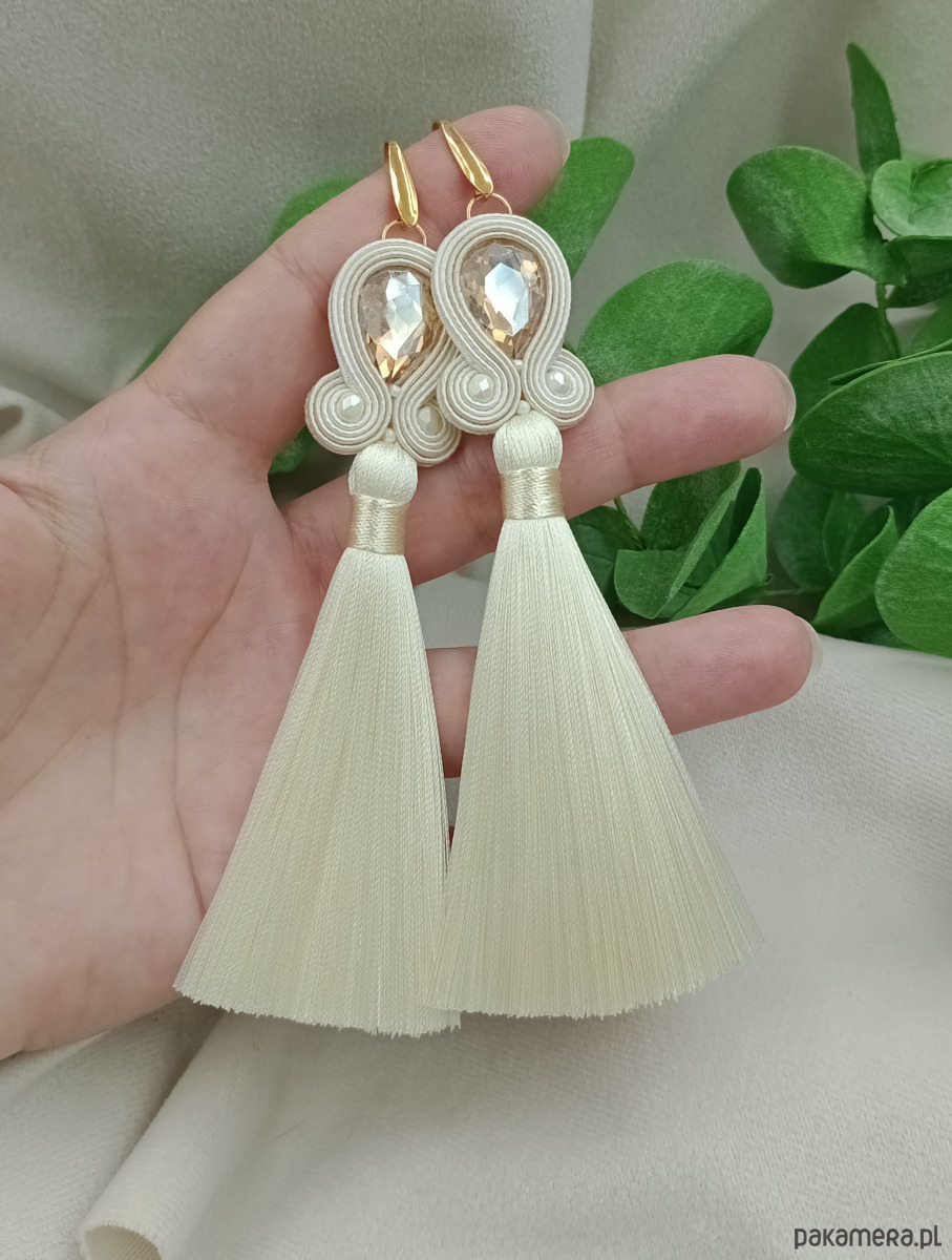 Kolczyki ślubne z chwostami, kolczyki ecru ivory kryształowe