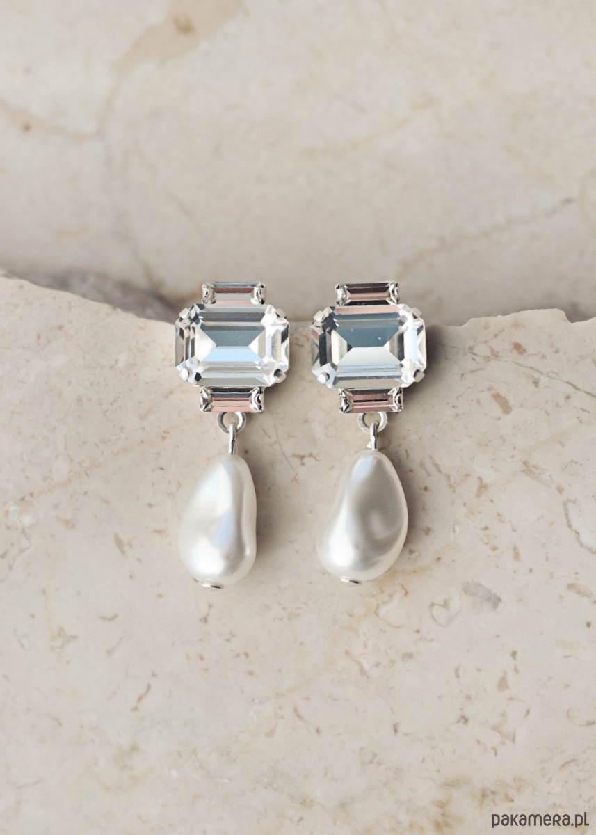 Sercem kolczyków DAPHNE są crystals by Swarovski, ułożone w architektoniczną kompozycję. Centralny kamień o szlifie szmaragdowym przyciąga światło każdym ruchem, tworząc hipnotyzujący blask. Kontrapunktem dla surowej geometrii góry jest zawieszona poniżej perła o nieregularnym, naturalnym kształcie, która nadaje całości charakteru modern boho.