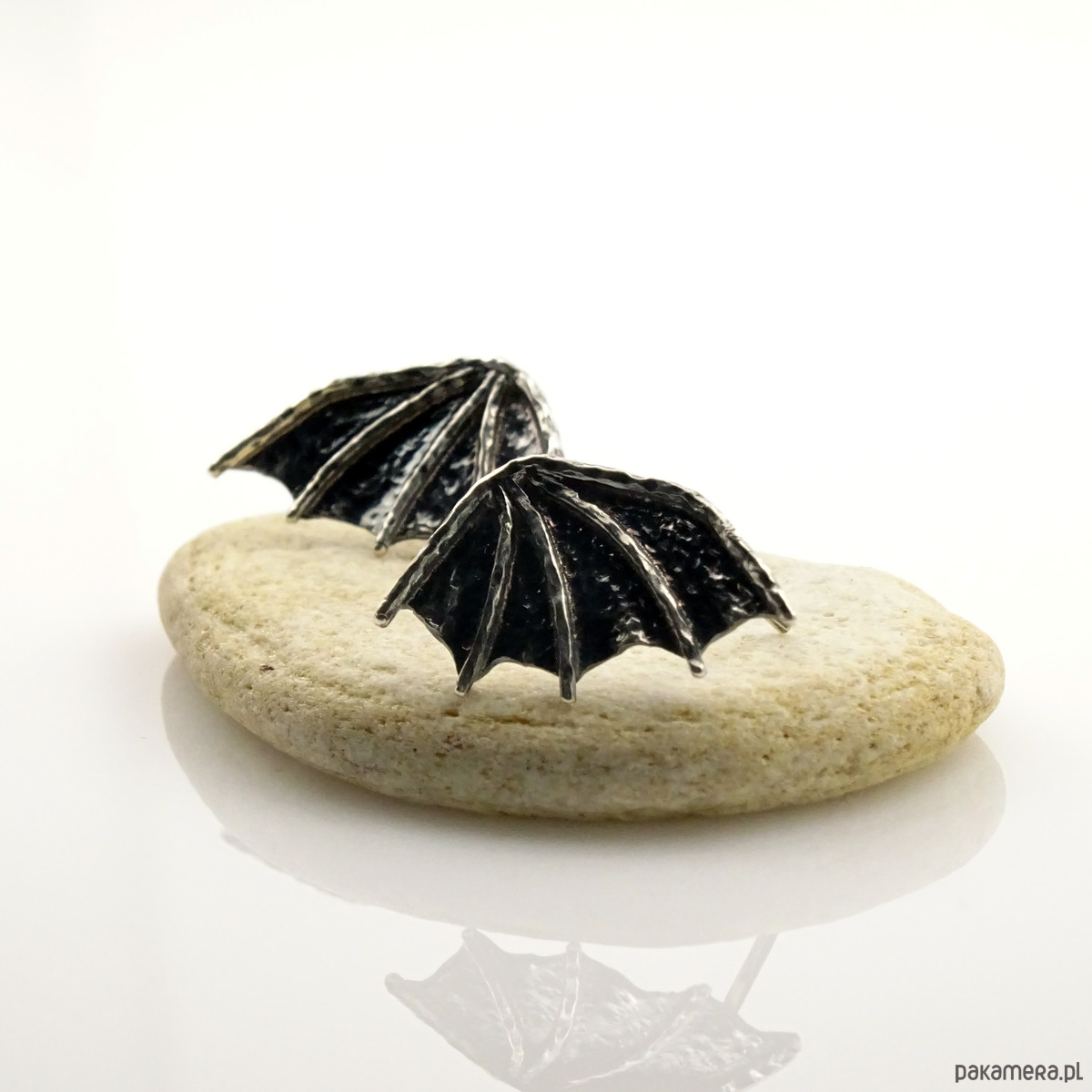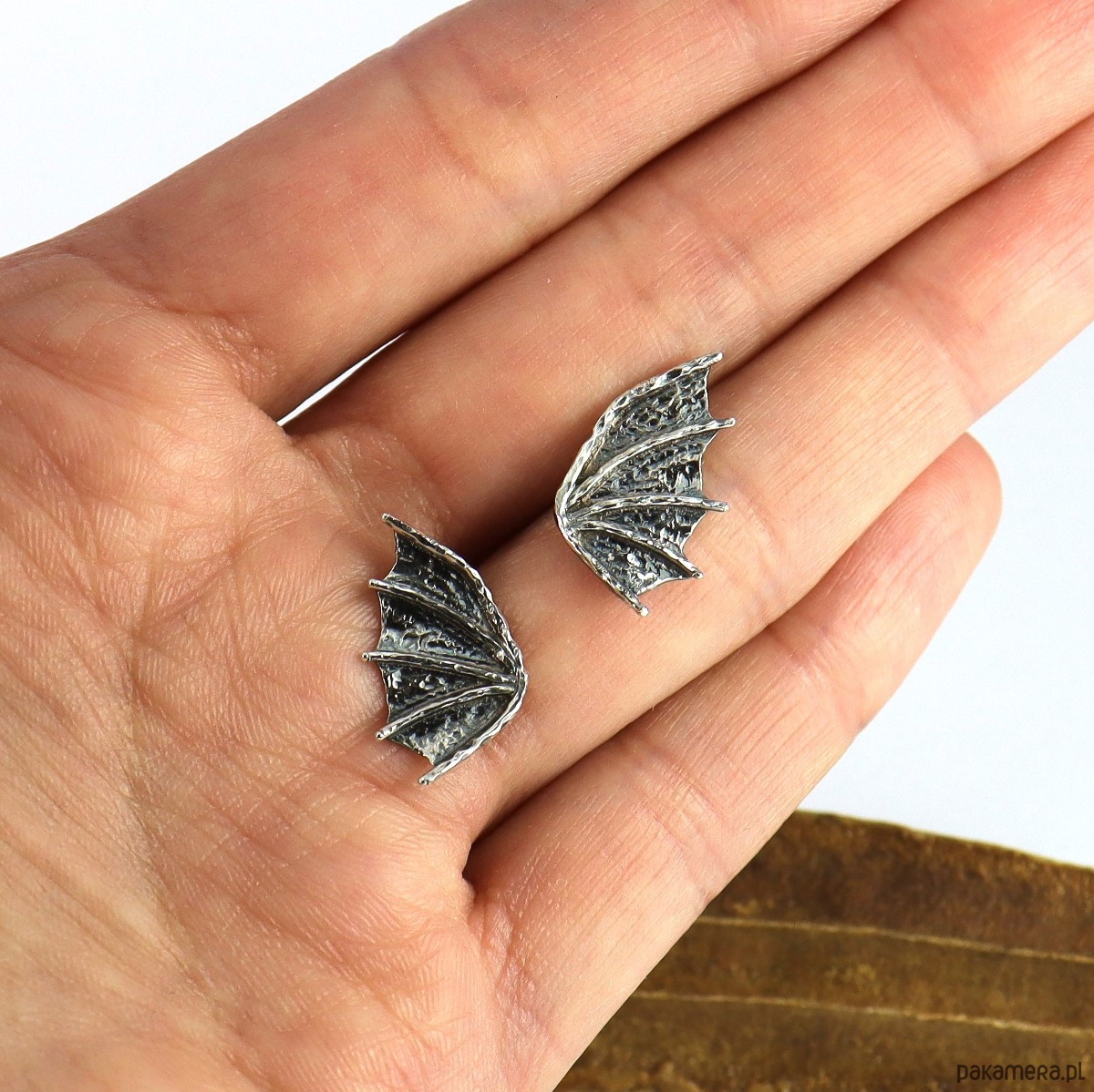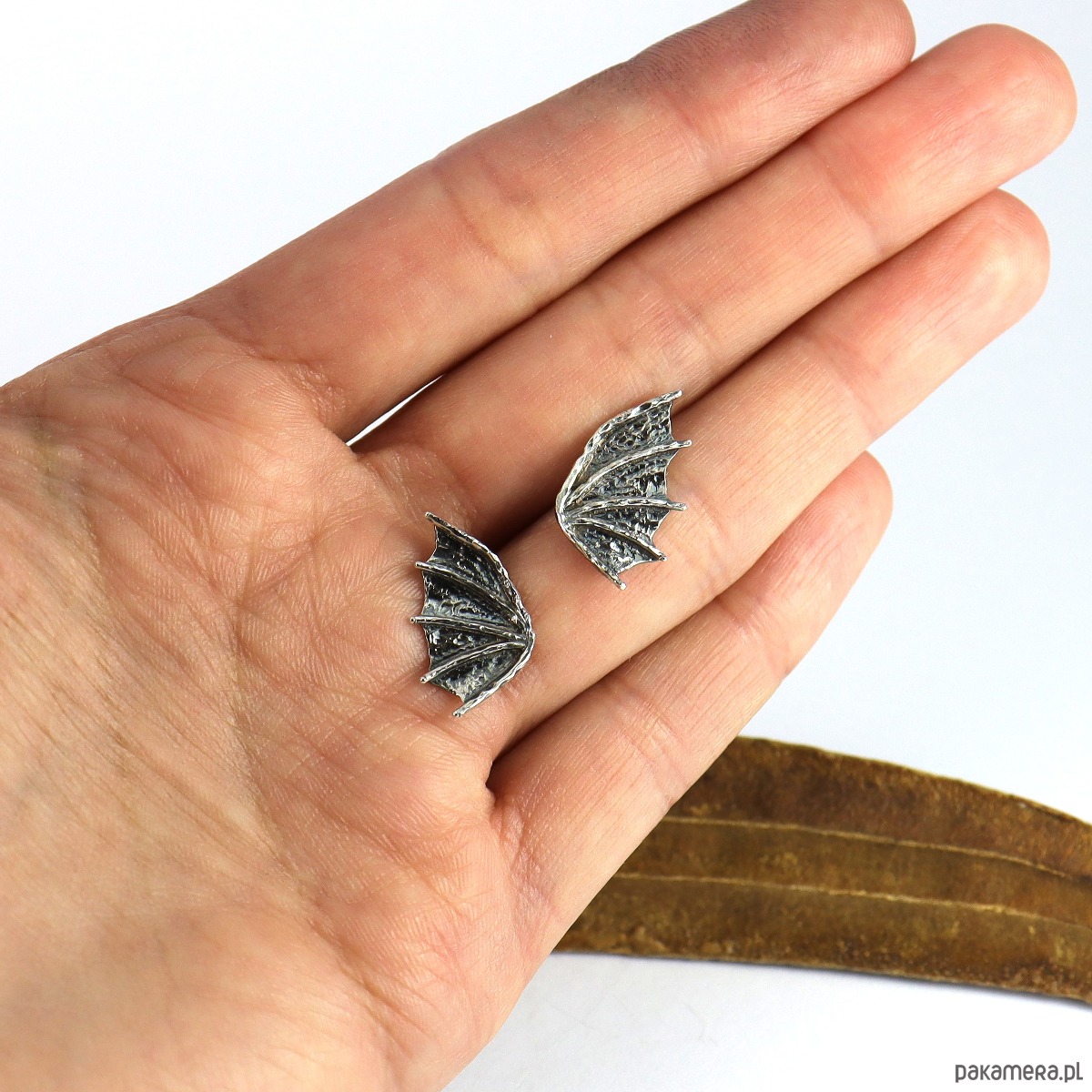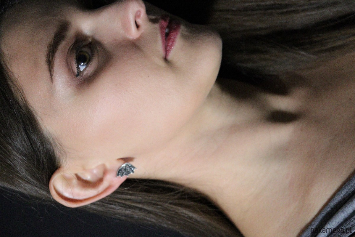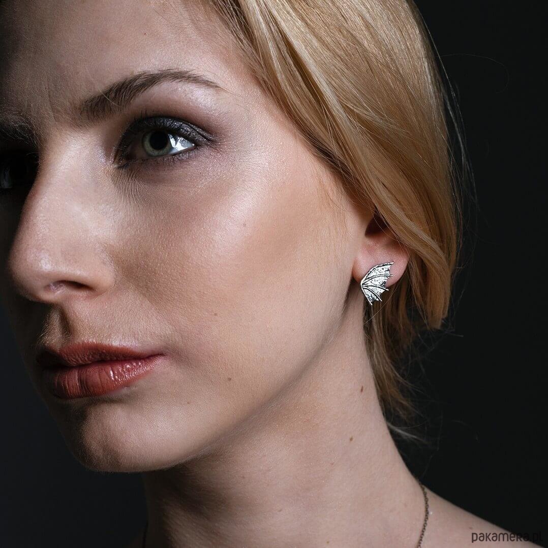 Surowe, ale jednocześnie subtelne kolczyki na sztyftach w kształcie smoczych skrzydeł (czasmi określane jako skrzydła nietoperza). Propozycja dla kobiet lubiących oryginalność i surowość w nienachalnym stylu. Powstały według autorskiego projektu i zostały wykonane ręcznie ze srebra próby 925. Dla lekko mrocznego stylu, srebro zostało przyciemnione oksydą.