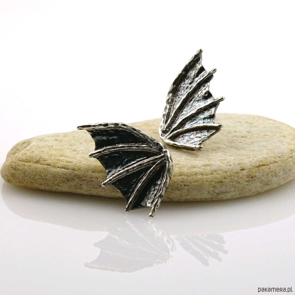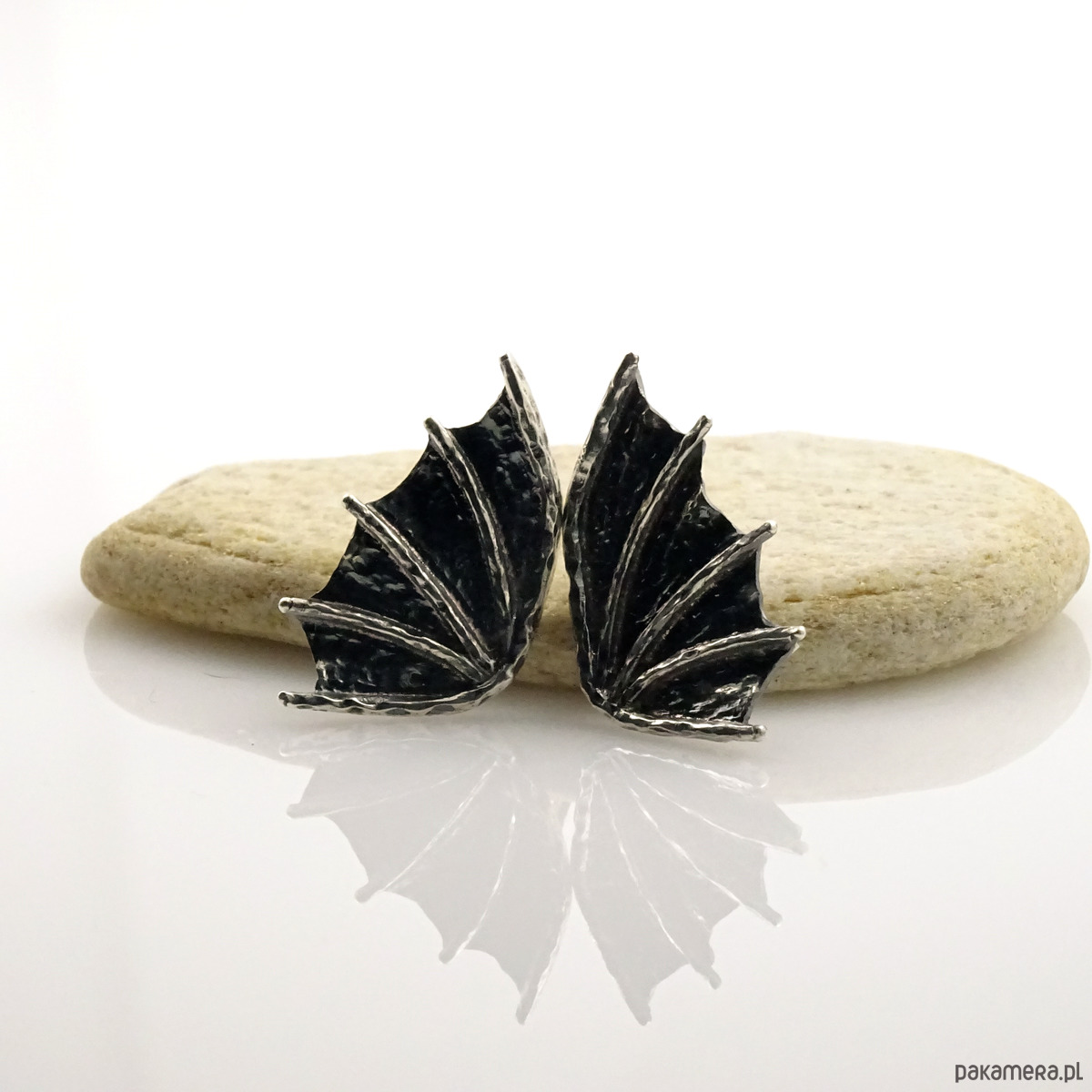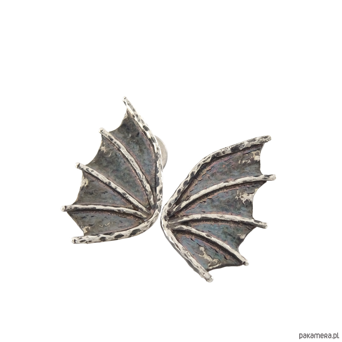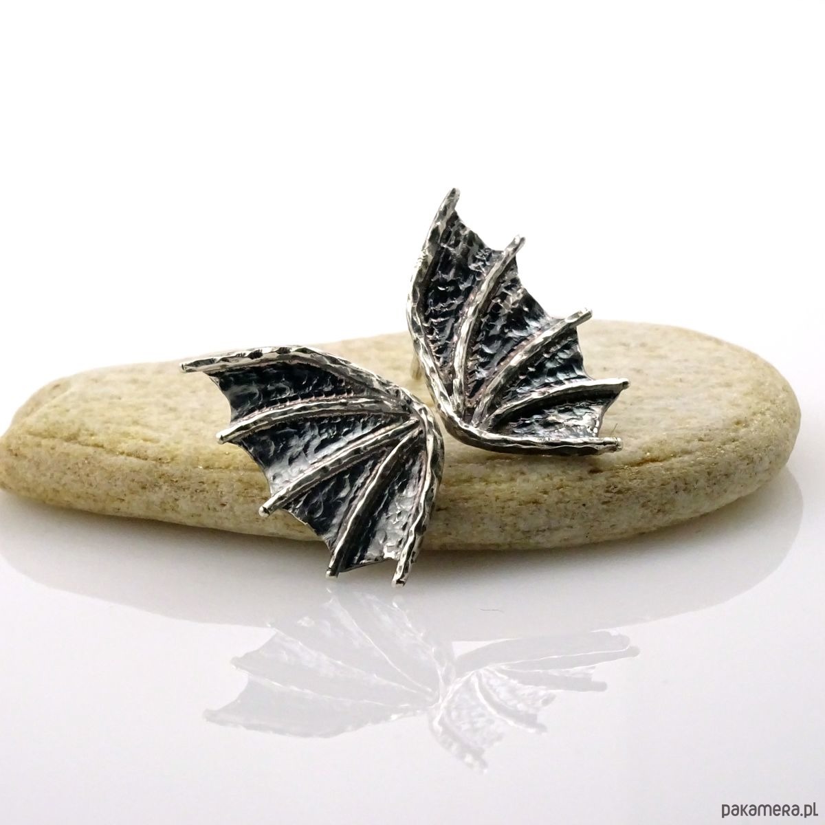 Surowe, ale jednocześnie subtelne kolczyki na sztyftach w kształcie smoczych skrzydeł (czasmi określane jako skrzydła nietoperza). Propozycja dla kobiet lubiących oryginalność i surowość w nienachalnym stylu. Powstały według autorskiego projektu i zostały wykonane ręcznie ze srebra próby 925. Dla lekko mrocznego stylu, srebro zostało przyciemnione oksydą.
