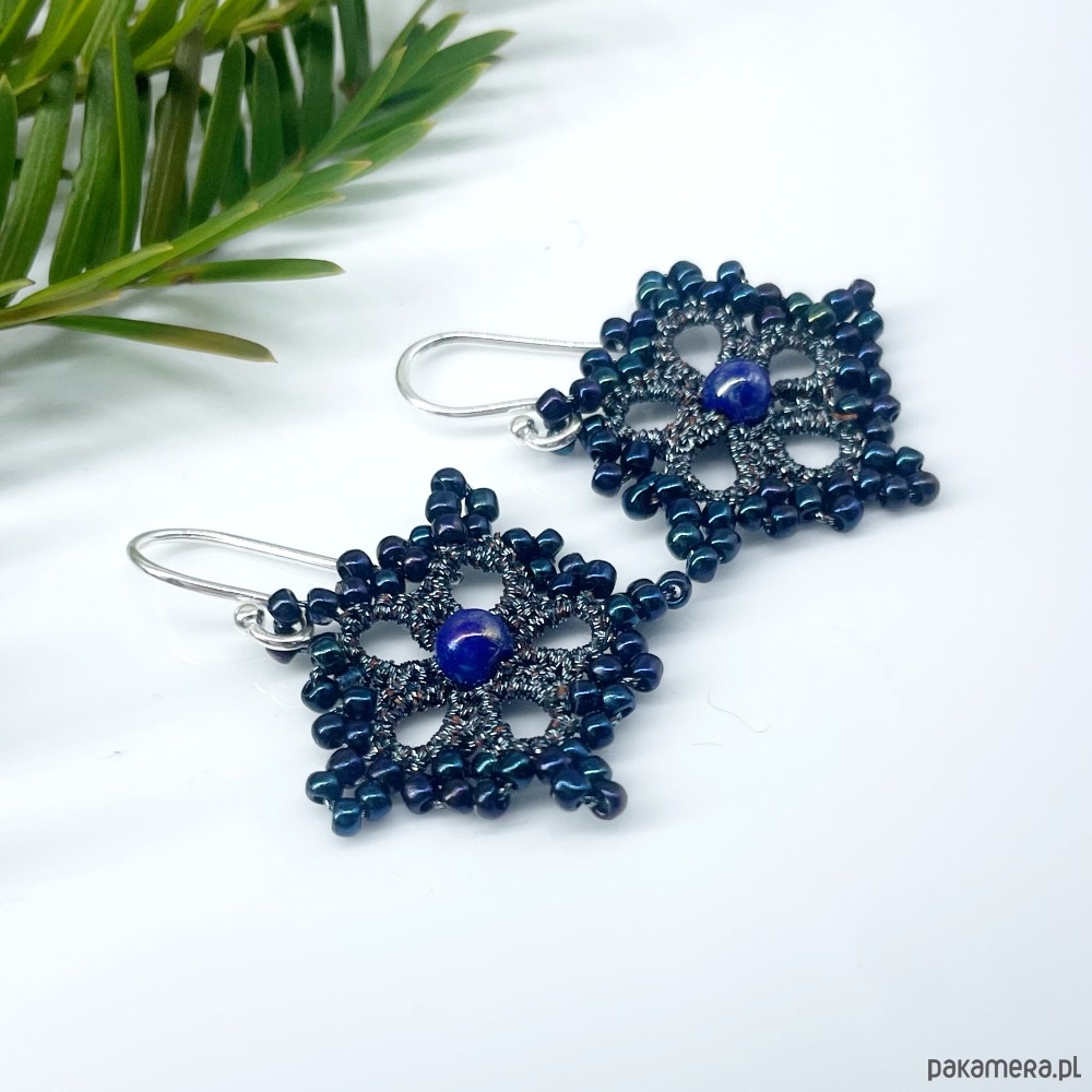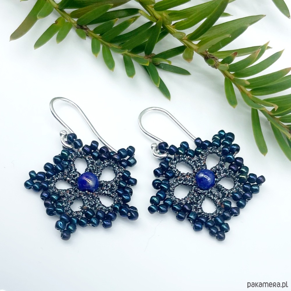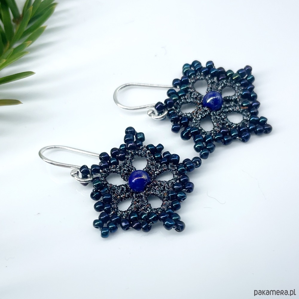 Kolczyki w kształcie gwiazdek, wykonane ręcznie w technice frywolitki z nici metalizowanej w kolorze stalowym. Ozdobione drobnymi, szklanymi koralikami. Niezwykle kobiece, bardzo lekkie. Zostały usztywnione odpowiednim preparatem, nie odkształcają się. Bigle - srebro próby 930. Polecam Paniom lubiącym koronkową biżuterię w stylu retro. Istnieje możliwość wykonania podobnych kolczyków w kolorze złotym i srebrnym.