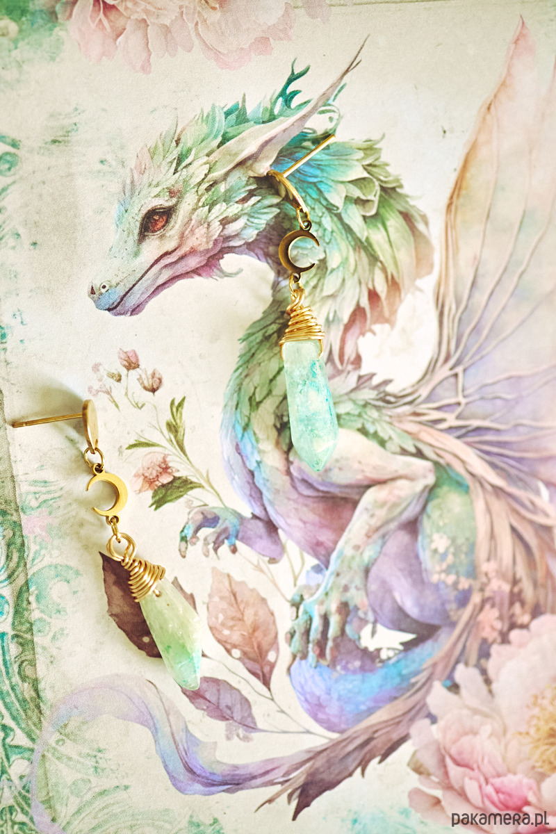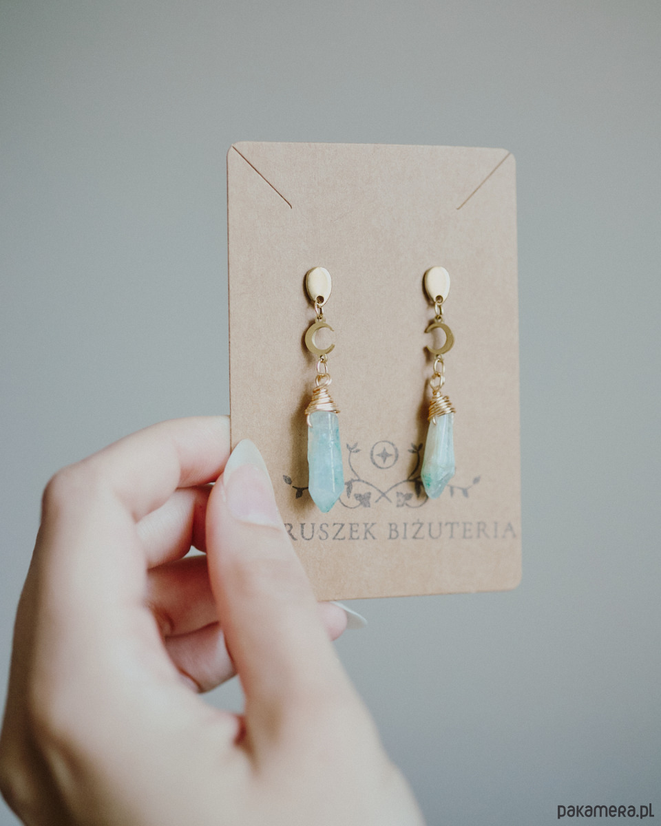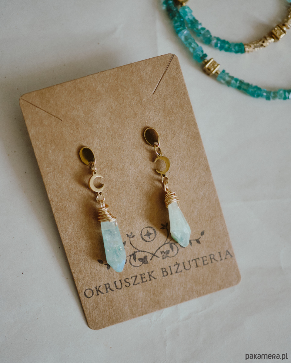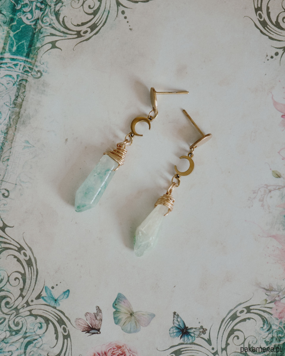 Ten model to klasyk wśród biżuterii dla wiedźm i czarodziejek! Przepełnione są mocą dzięki symbolice księżyca i gwiazd. Wykańcza je naturalny kryształ kwarcu w morskim odcieniu. Dzięki nim staniesz się Łączniczką między Morzem, Ziemią i Niebem.