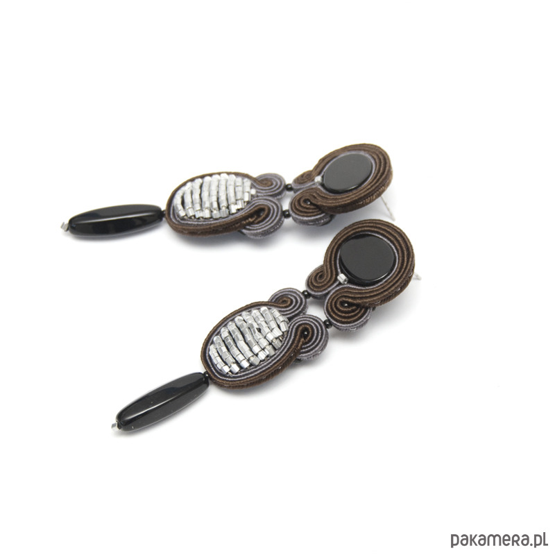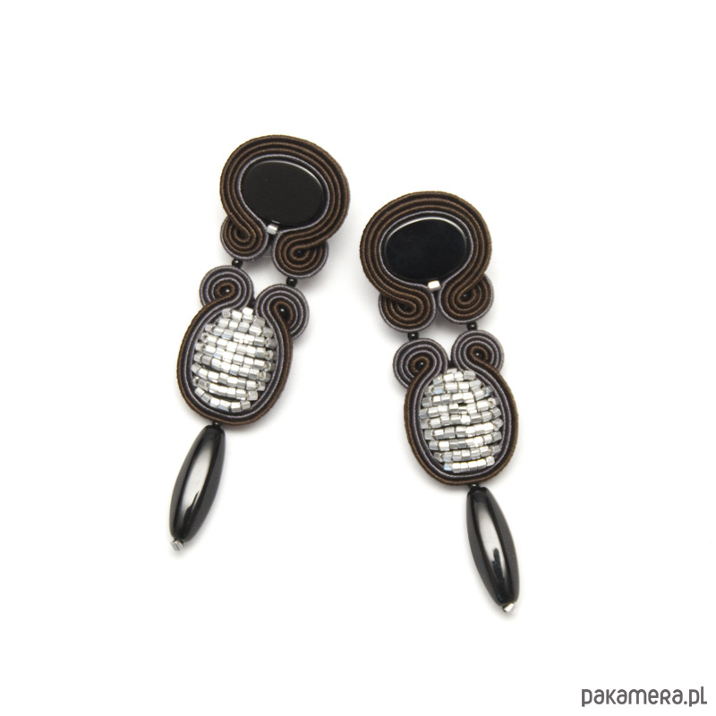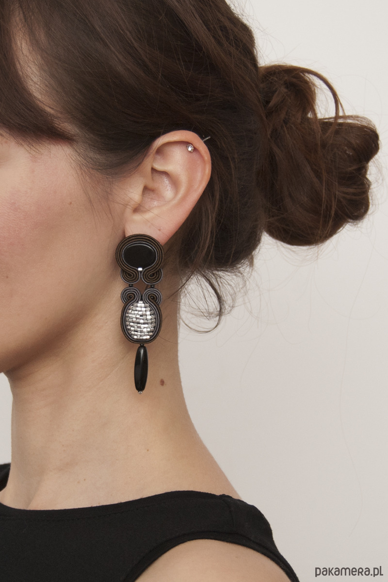 Kolczyki wykonane są techniką haftu soutache. Zrobione z onyksu, sznurków sutasz i sztyftów ze srebrnej stali chirurgicznej (antyalergiczna). Tył kolczyków stanowi cienka, delikatna skóra naturalna. Długość kolczyka to około 8 cm, szerokość w najszerszym miejscu wynosi około 2,5 cm. Kolczyki zabezpieczone są impregnatem.