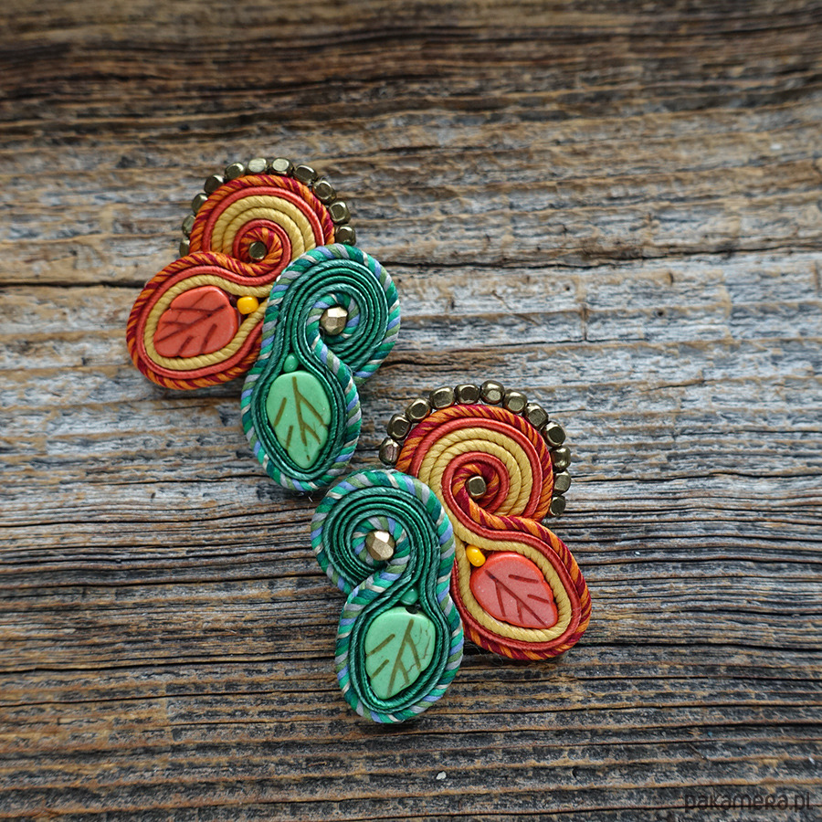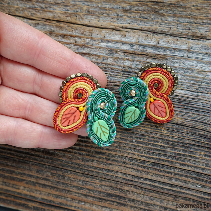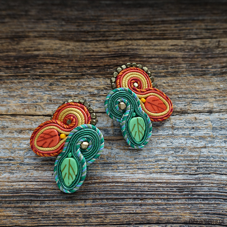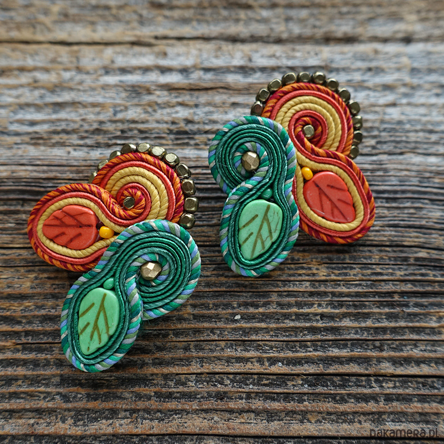 Ręcznie wykonane kolczyki metodą haftu soutache – stworzone z myślą o prawdziwych jesieniarach. W ciepłej palecie brązów, pomarańczu i granatu, z delikatnym akcentem starego złota, idealnie wpisują się w klimat kocyka, świec i kubka gorącej herbaty.