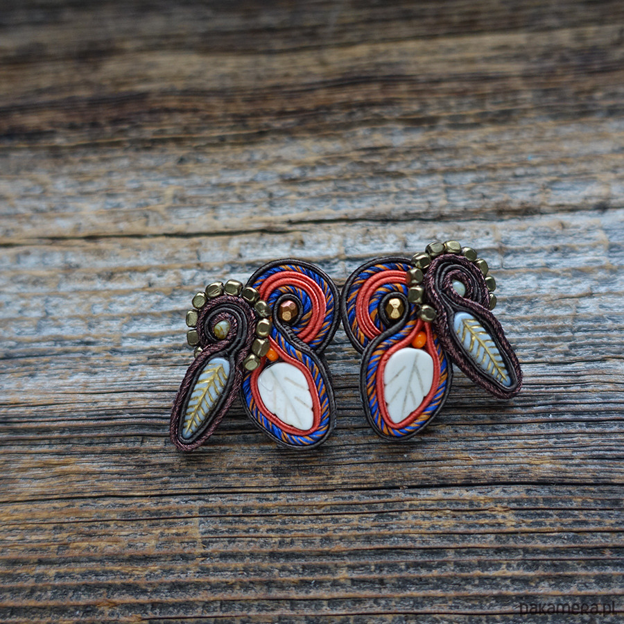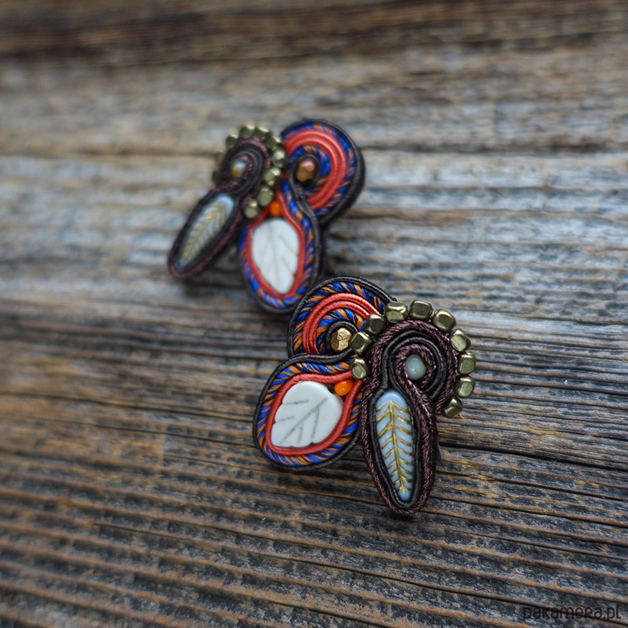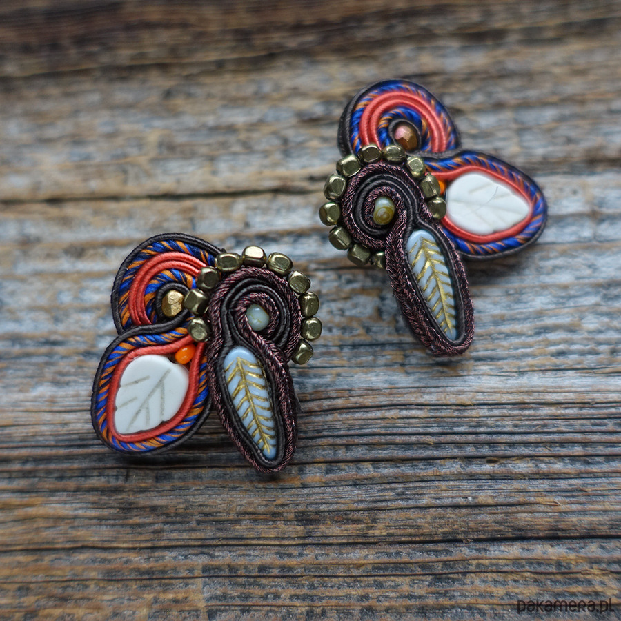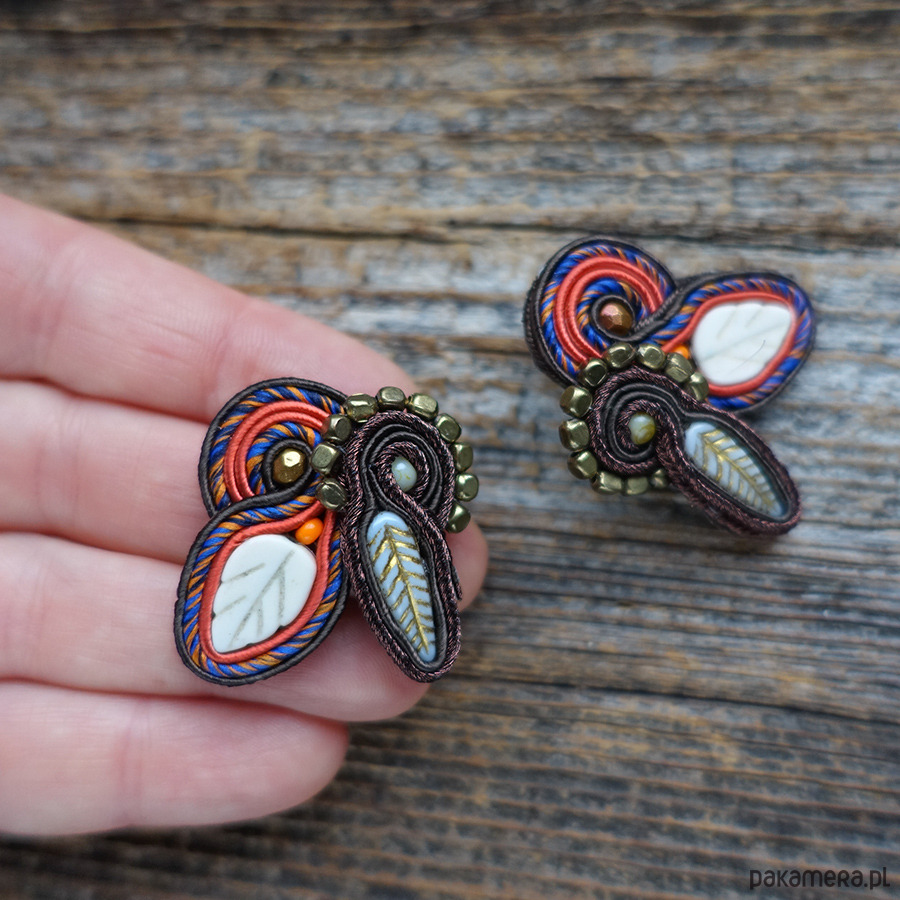 Ręcznie wykonane kolczyki metodą haftu soutache – stworzone z myślą o prawdziwych jesieniarach. W ciepłej palecie brązów, pomarańczu i granatu, z delikatnym akcentem starego złota, idealnie wpisują się w klimat kocyka, świec i kubka gorącej herbaty.