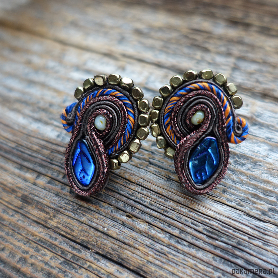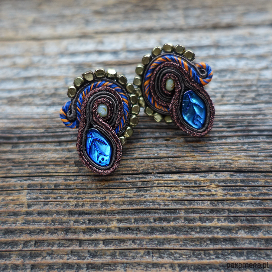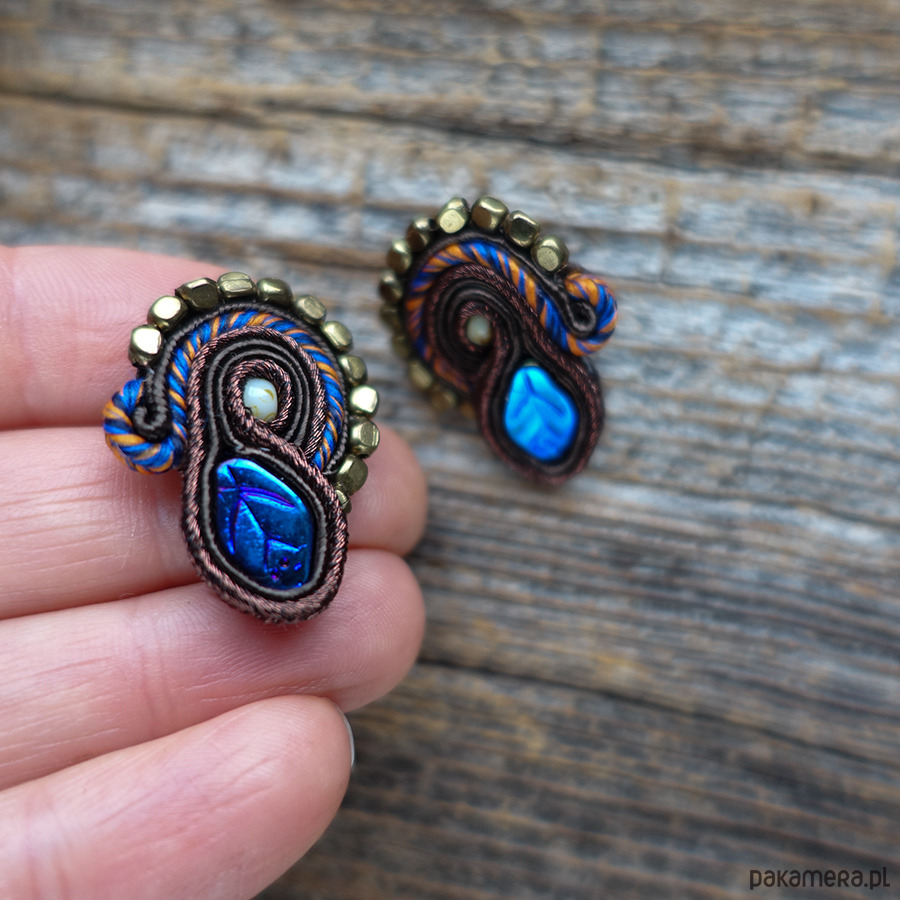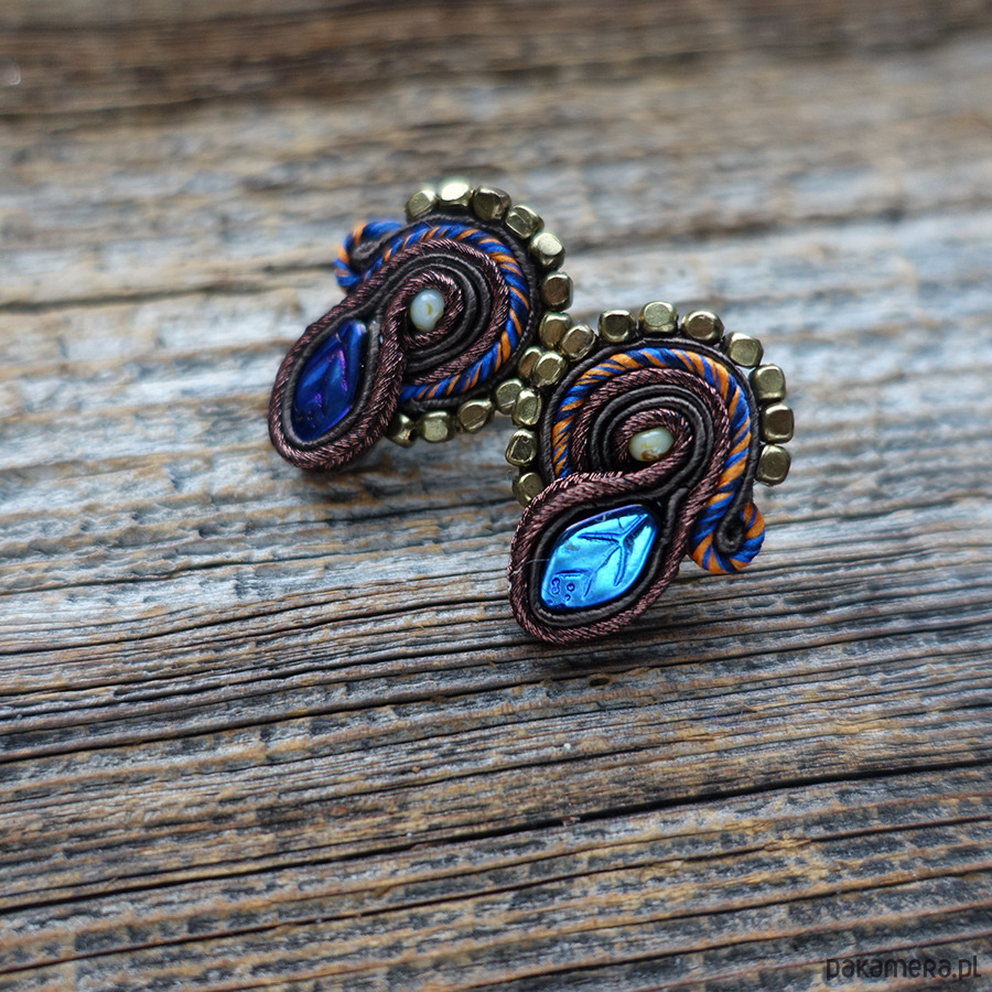 Ręcznie wykonane kolczyki metodą haftu soutache – stworzone z myślą o prawdziwych jesieniarach. W ciepłej palecie brązów, pomarańczu i granatu, z delikatnym akcentem starego złota, idealnie wpisują się w klimat kocyka, świec i kubka gorącej herbaty.