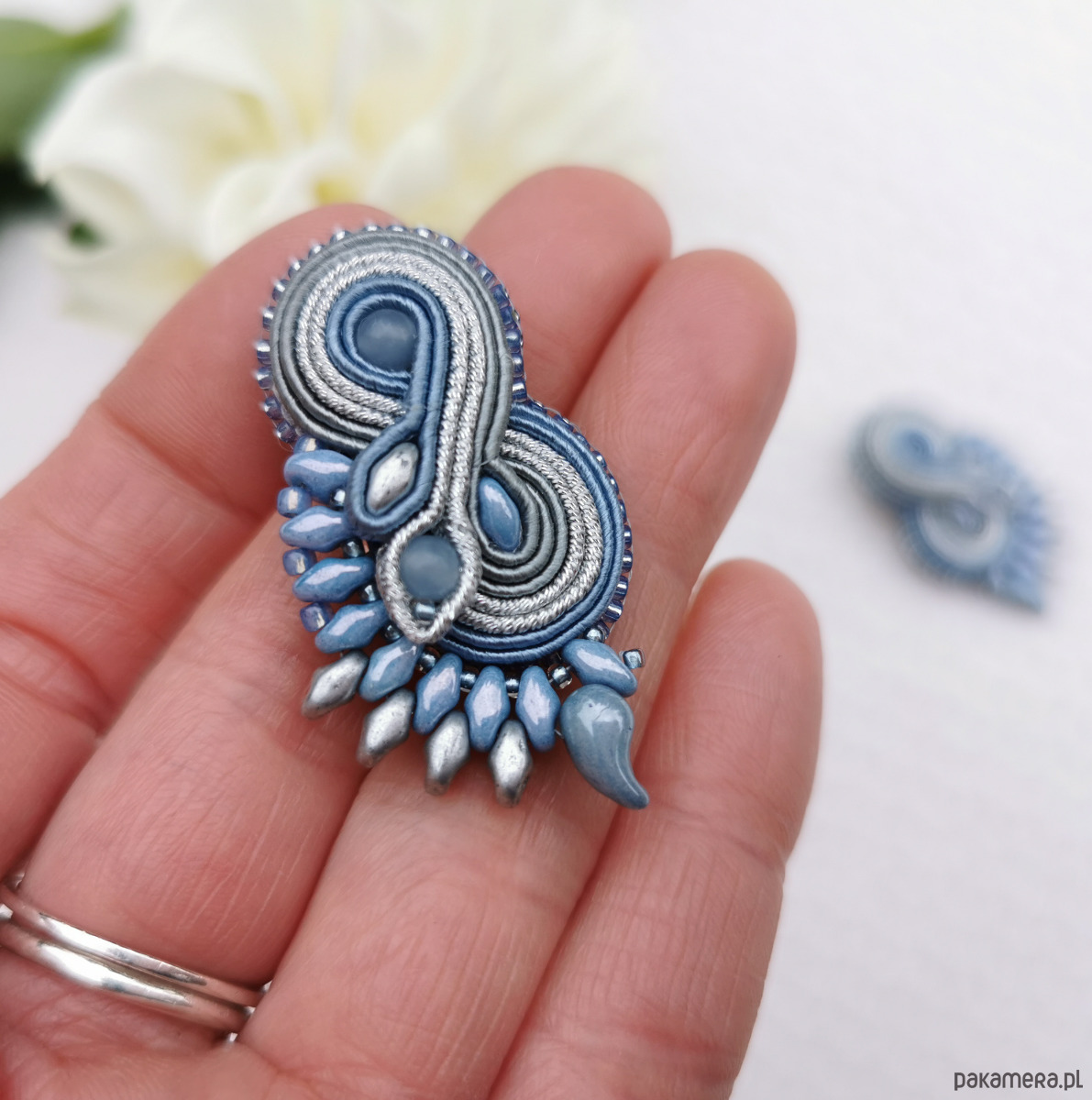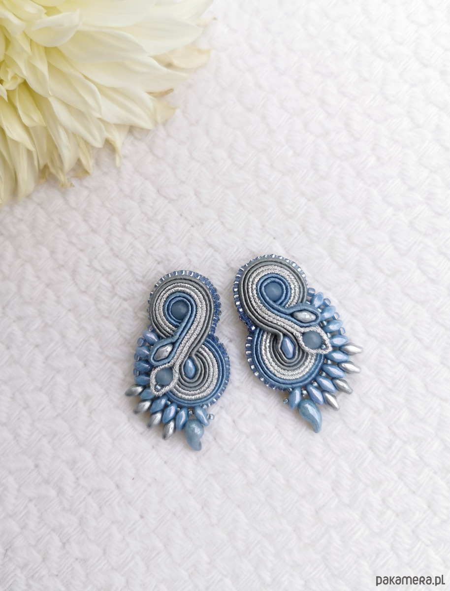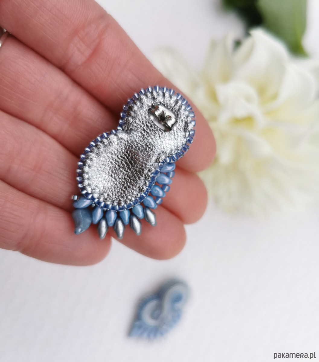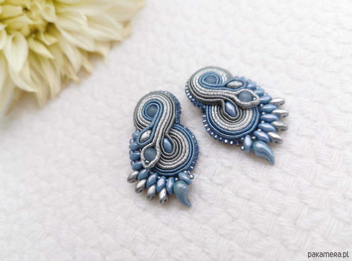 Delikatne i filigranowe, bardzo urocze kolczyki z Angelitem i czeskimi koraikami szklanymi. W całości uszyte i wykończone ręcznie. Zaopatrzone w sztyfty ze stali szlachetnej i podbite skórą naturalną z recyklingu.