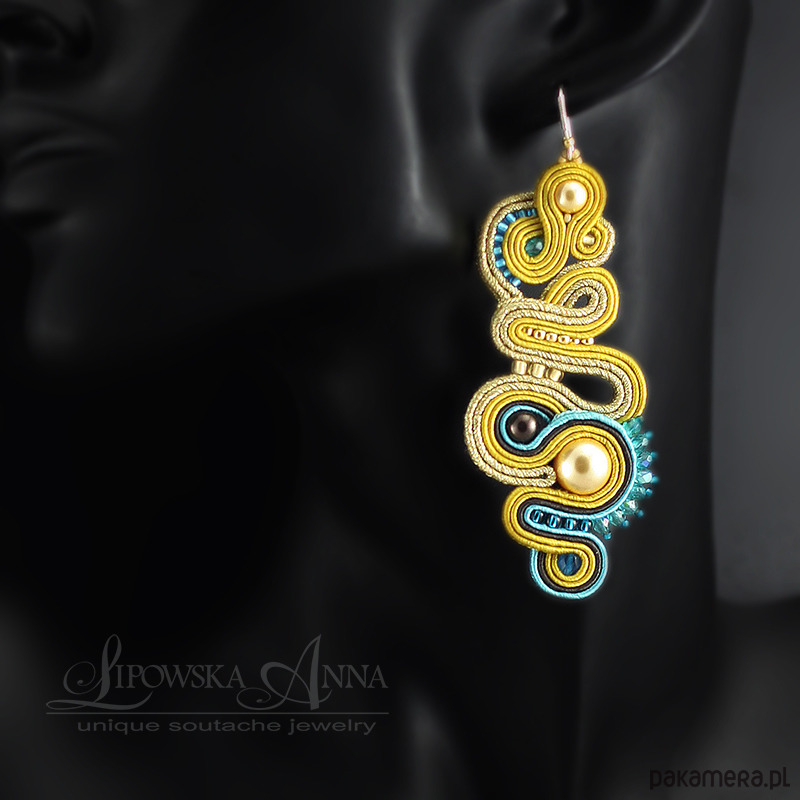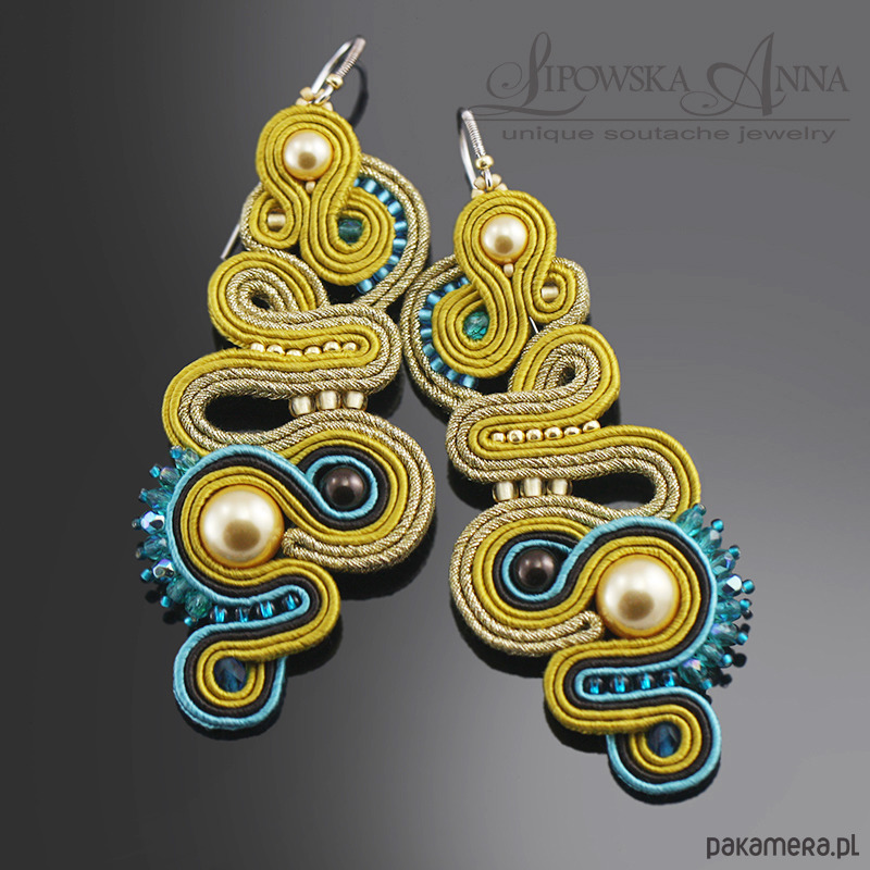Kolczyki wykonane pracochłonną techniką haftu sutasz od podstaw ręcznie z użyciem sznurków sutasz, pereł Swarovski, koralików Fire Polish i maleńkich koralików Toho. Z tyłu autorskie wykończenie ozdobionym koralikami filcem w minimalnym i tylko koniecznym stopniu, tak by całość była lekka.
