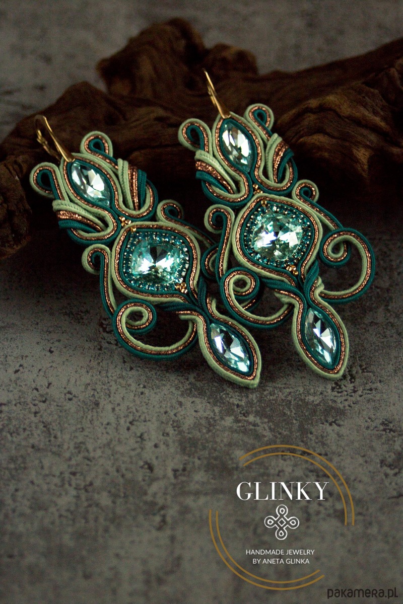 Eleganckie, błyszczące i lekkie kolczyki w odcieniach mięty. Wysokiej jakości kryształy fasetowane w kolorze akwamarynu oprawione zostały haftem sutasz w odcieniach miedzi i patyny. Kolczyki pomimo swojego rozmiaru są zachwycająco lekkie.