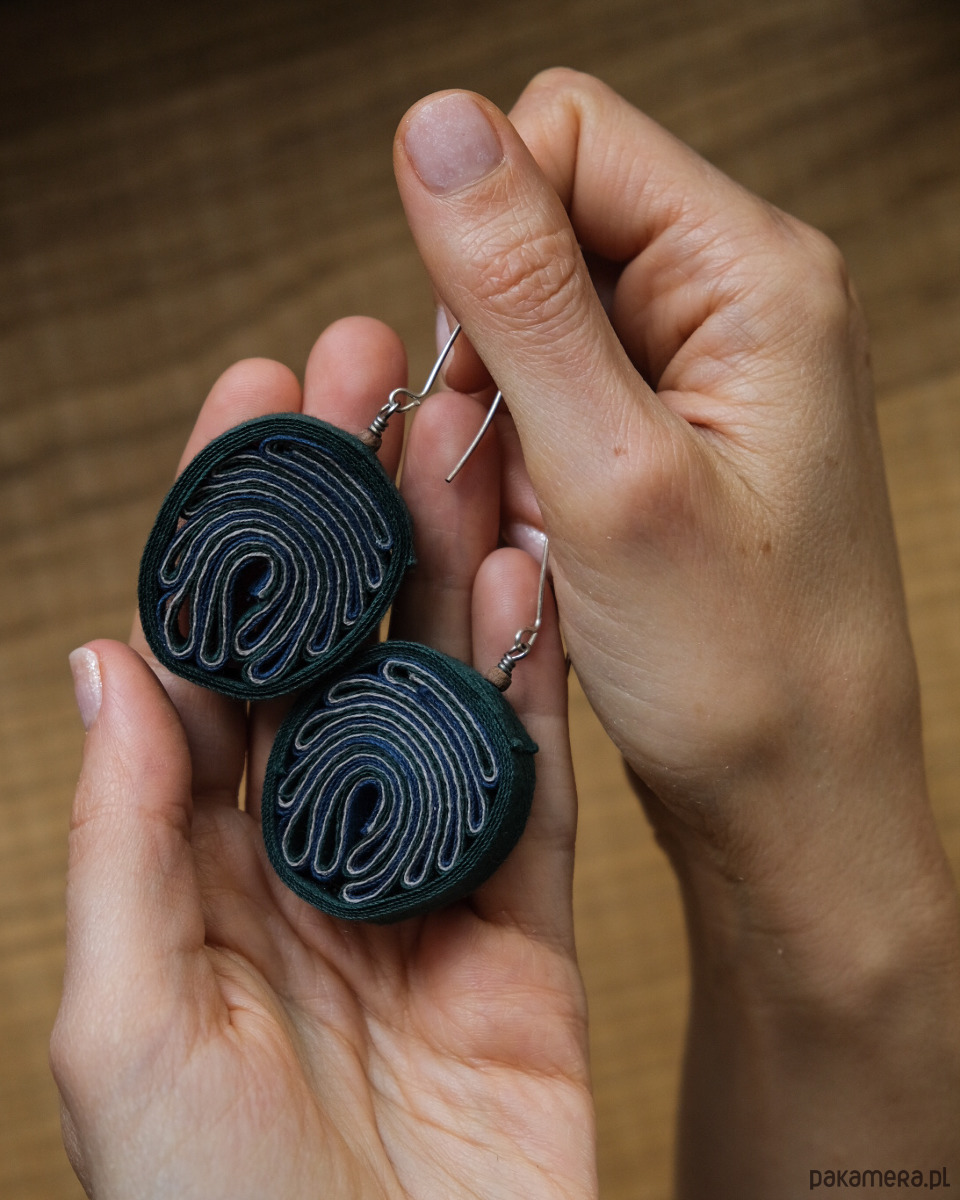 Lekkie, pracochłonne kolczyki w stylu etno, wykonane z bawełnianych taśm w kolorach granatowym, ciemnozielonym, beżowym. Dwustronne. Zachowują formę, pięknie wyglądają na uchu.