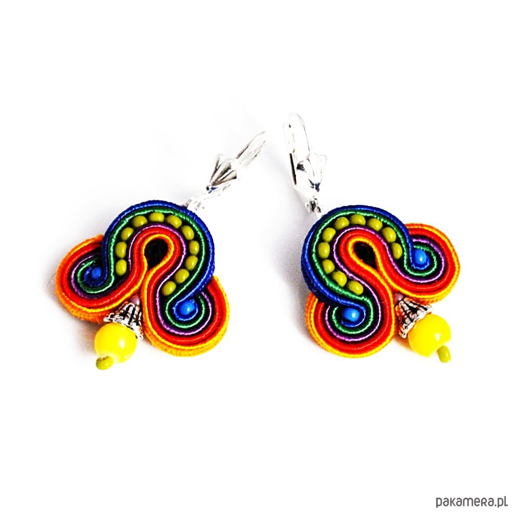Niezwykłe kolczyki pasujące idealnie na codzień do jeansów, jak również od święta - w odcieniach tęczy. Długość 3 cm. Zawieszone na antyalergicznych miedzianych biglach. Impregnowane. Kolczyki są szyte na indywidualne zamówienie.