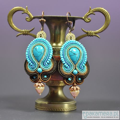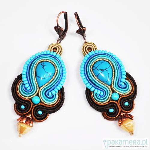 Eleganckie kolczyki w tonacji turkusu, kobaltu i brązów z magnezytem. Długość 4 cm. Bigle antyalergiczne.