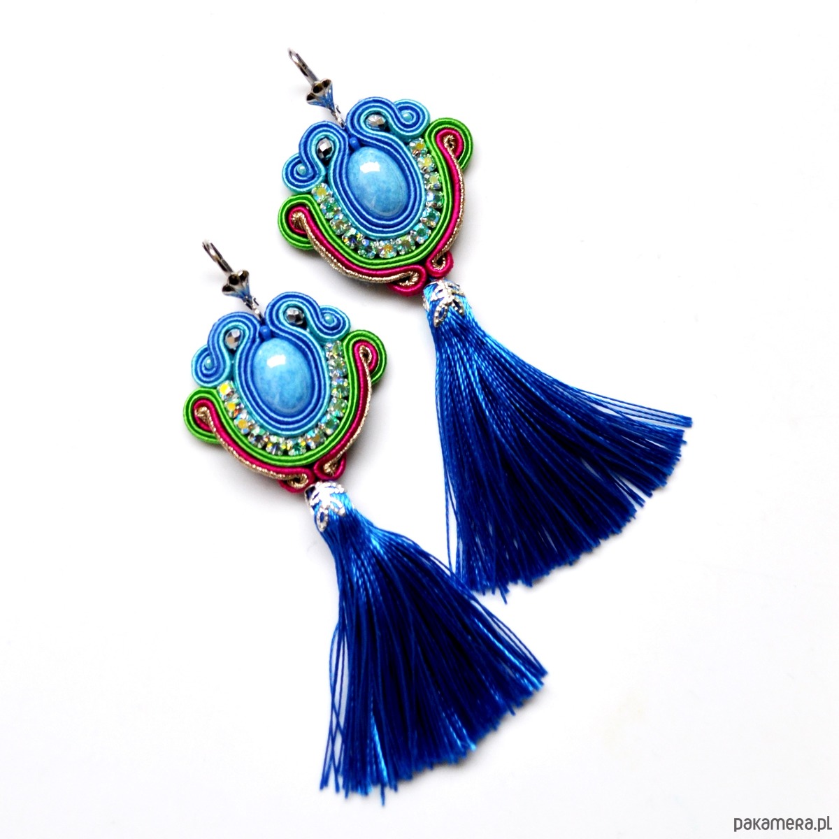 Niezwykle eleganckie kolczyki z sutaszu - w błękicie, turkusie, różu, zieleni i złocie z niebieskimi chwostami z cieniutkich niteczek. Długość 8,5 cm. Zawieszone na antyalergicznych mosiężnych biglach.