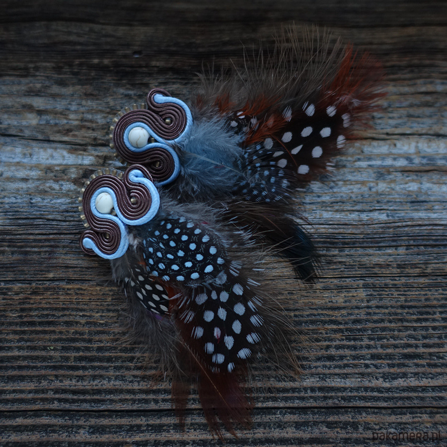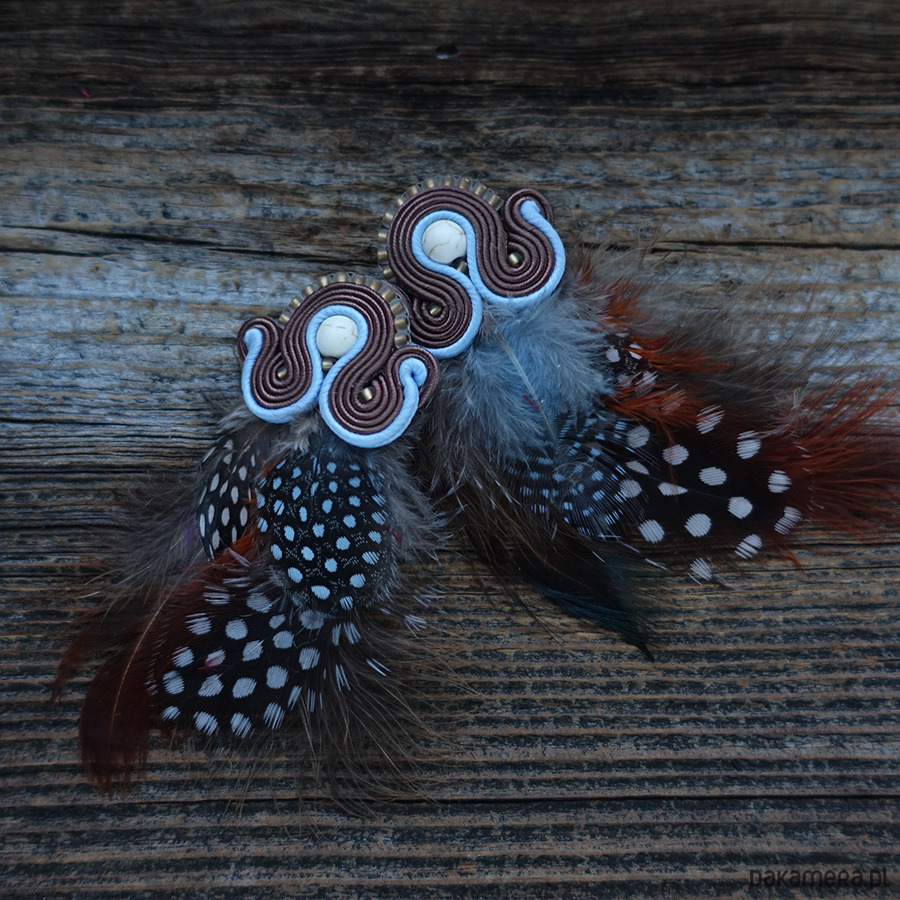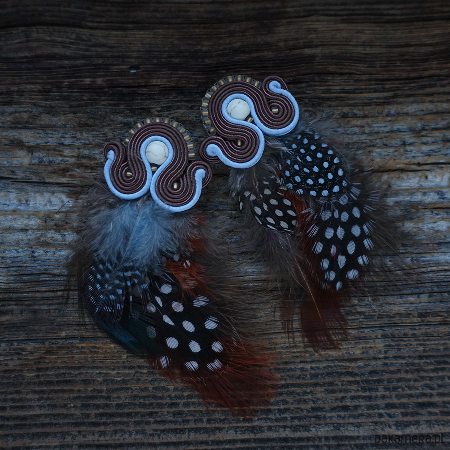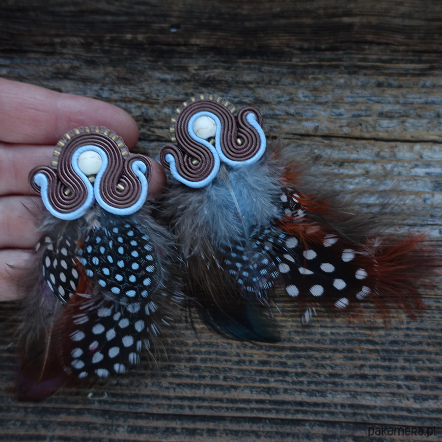 Materiały: sznurki sutasz, białe howlity , naturalne piórka, koraliki toho, sztyfty ze stali szlachetnej;