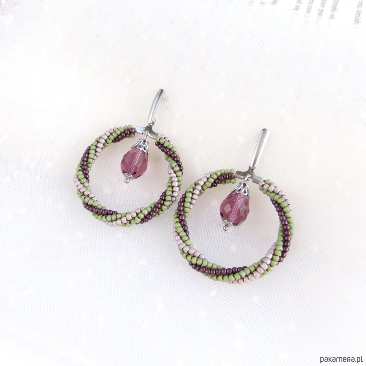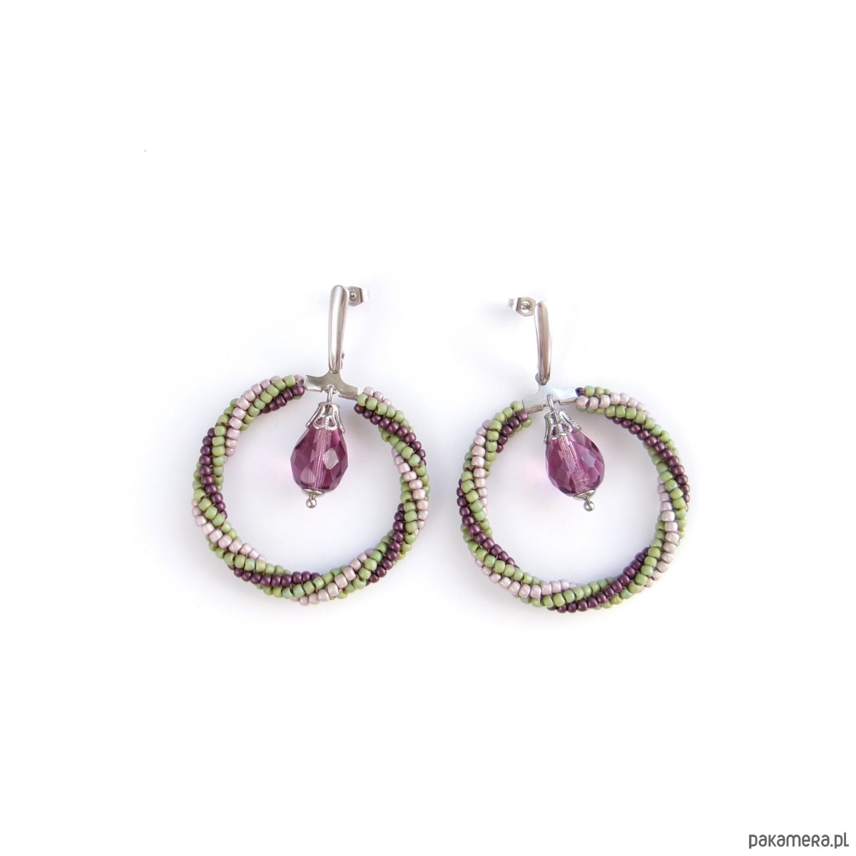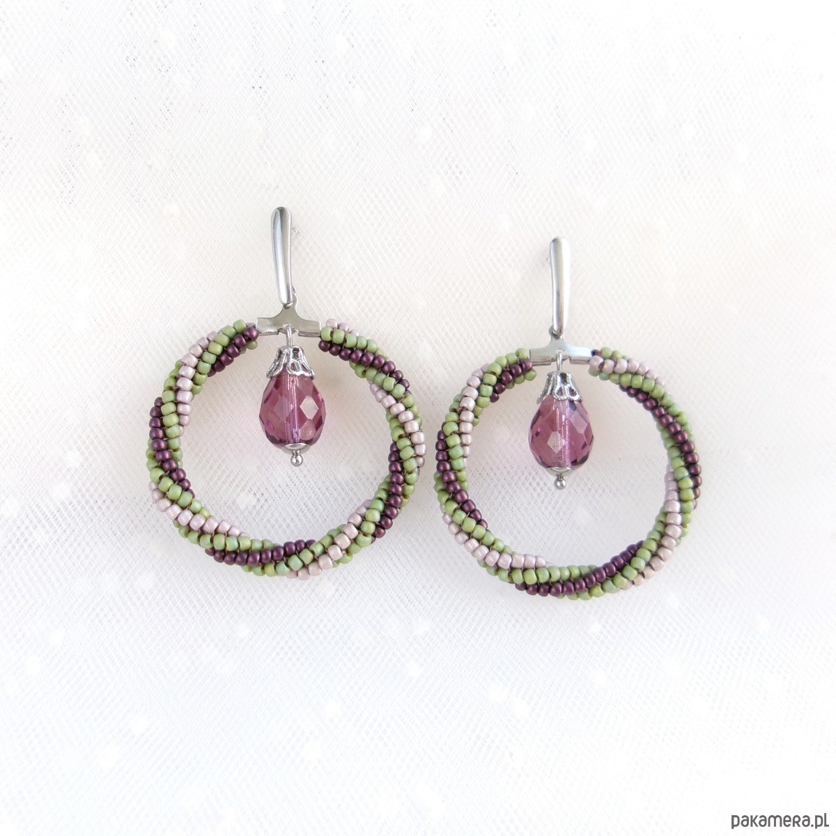 Kolczyki koła wykonane ręcznie z drobnych szklanych koralików, ozdobione fasetowanymi kroplami.