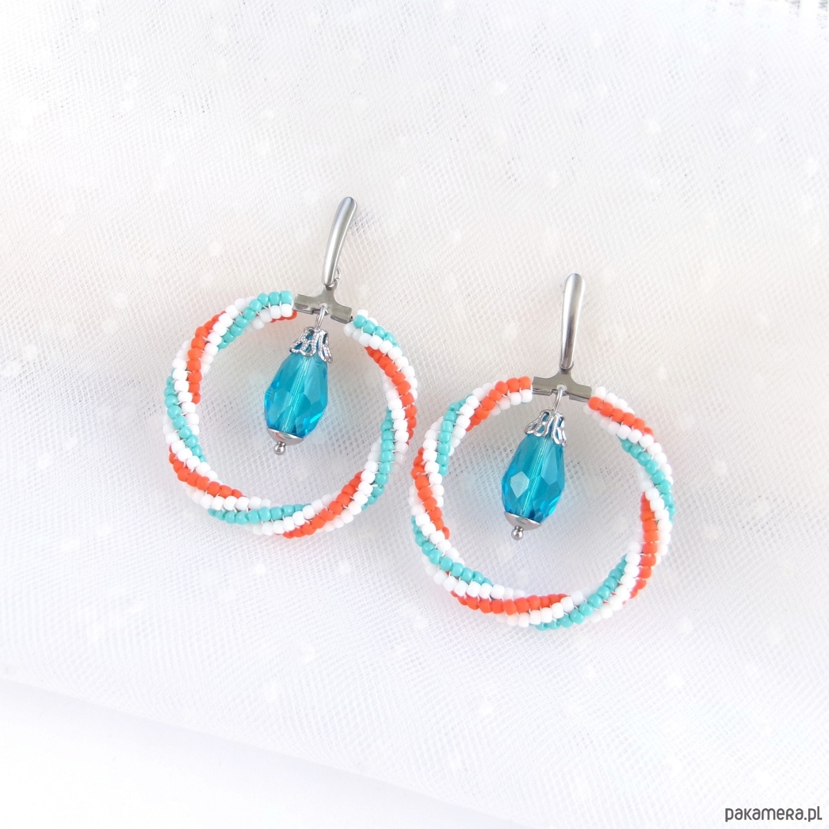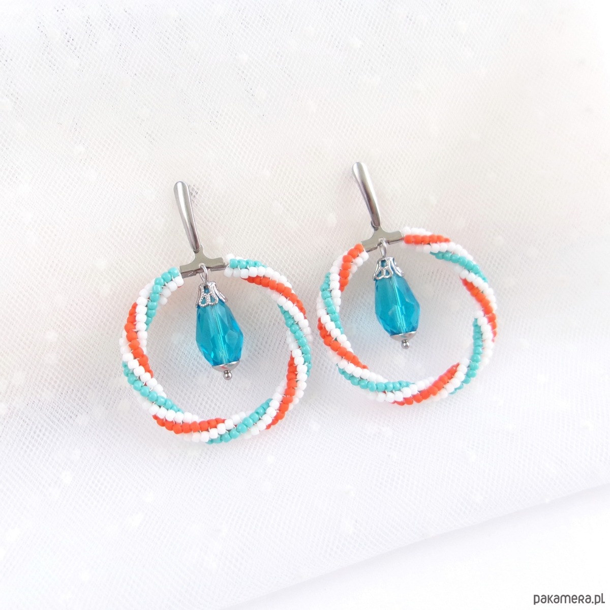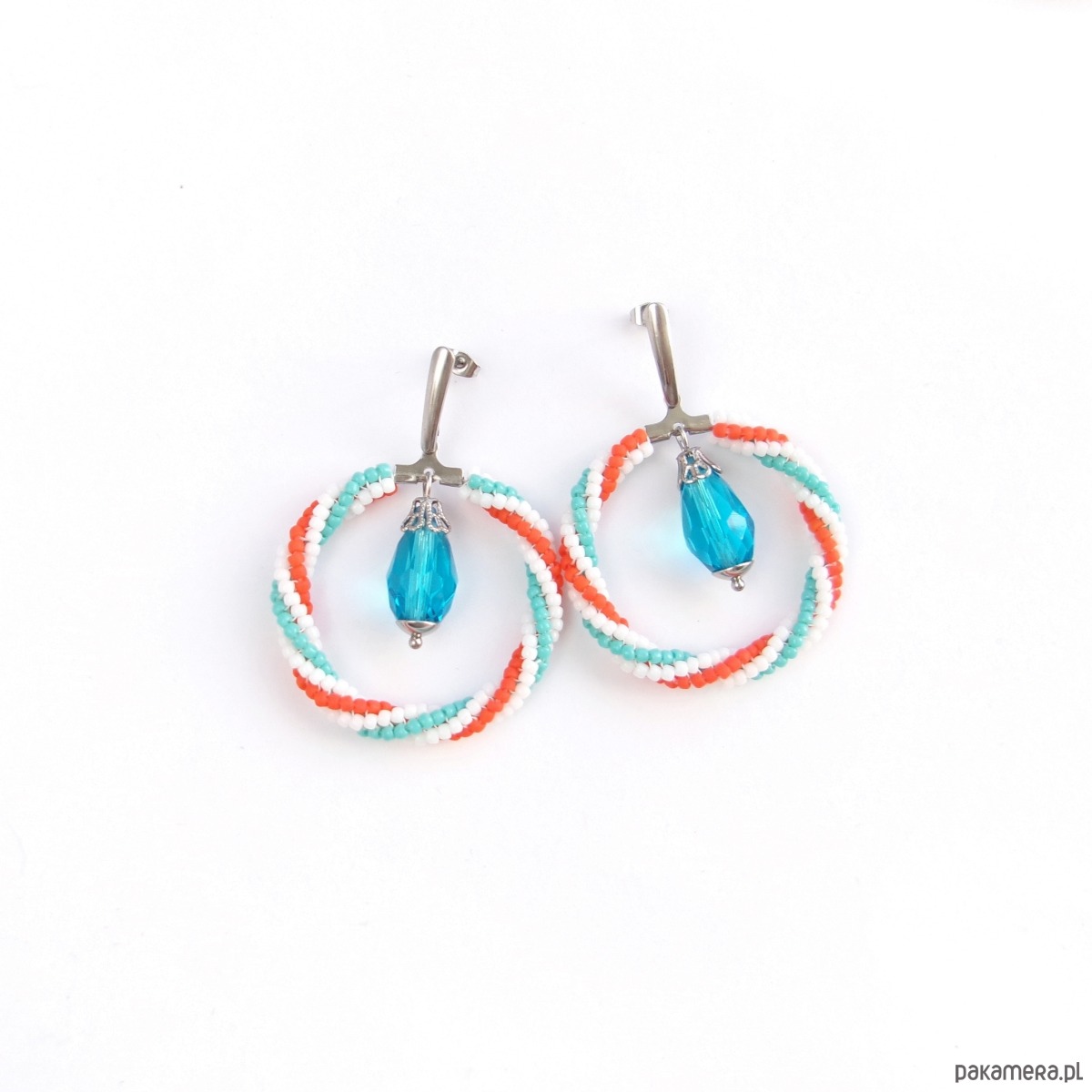Kolczyki koła wykonane ręcznie z drobnych szklanych koralików, ozdobione fasetowanymi kroplami.