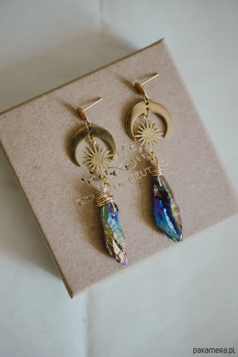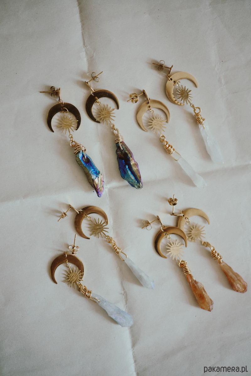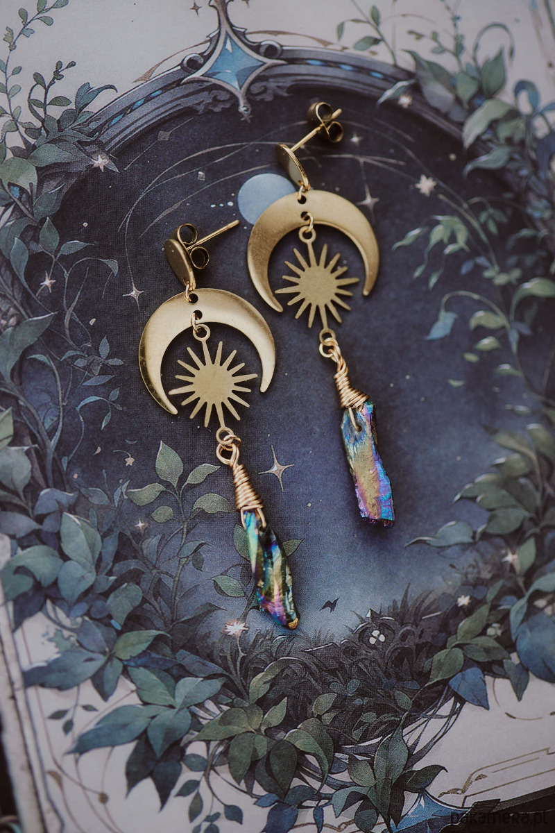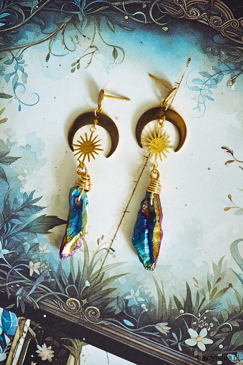 Ten model to klasyk wśród biżuterii dla wiedźm i czarodziejek! Przepełnione są mocą dzięki symbolice księżyca i gwiazd. Wykańcza je naturalny kryształ kwarcu tytanowym w ciemno tęczowym odcieniu. Dzięki nim staniesz się Łączniczką między Niebem a Ziemią.