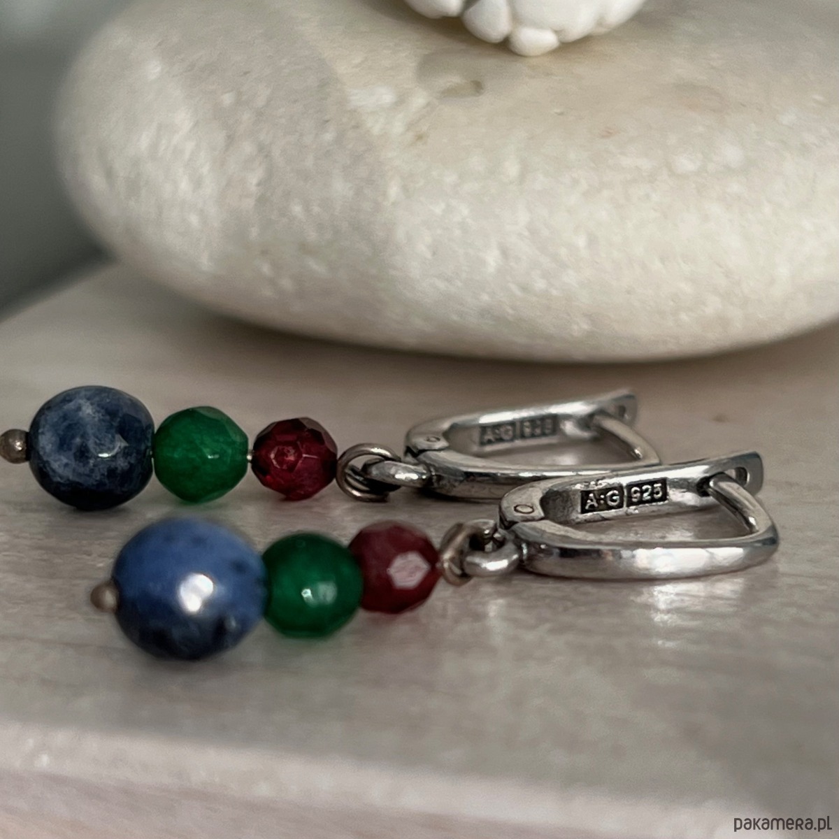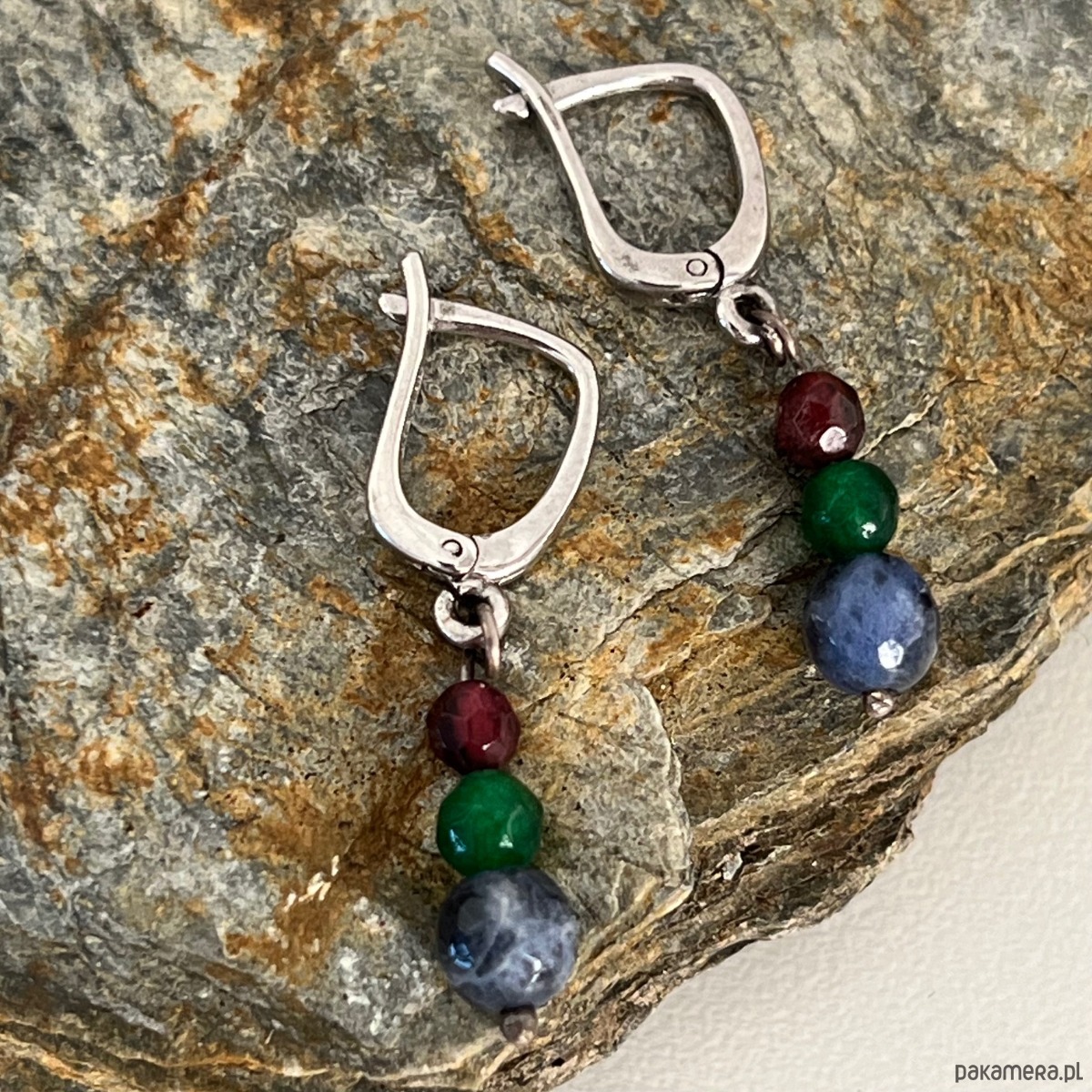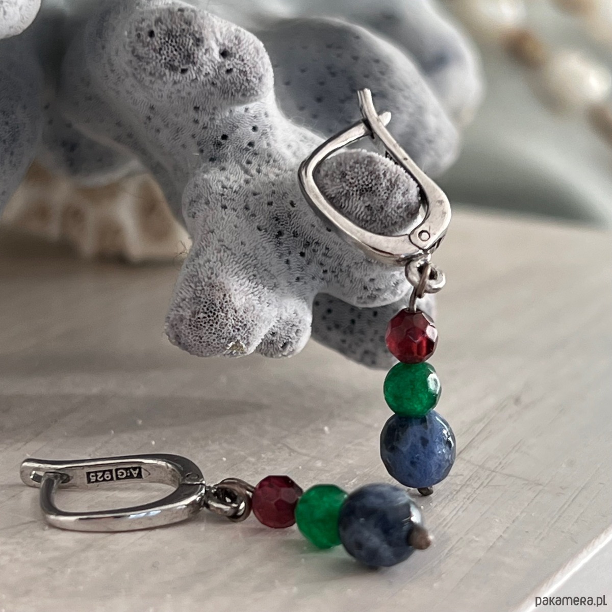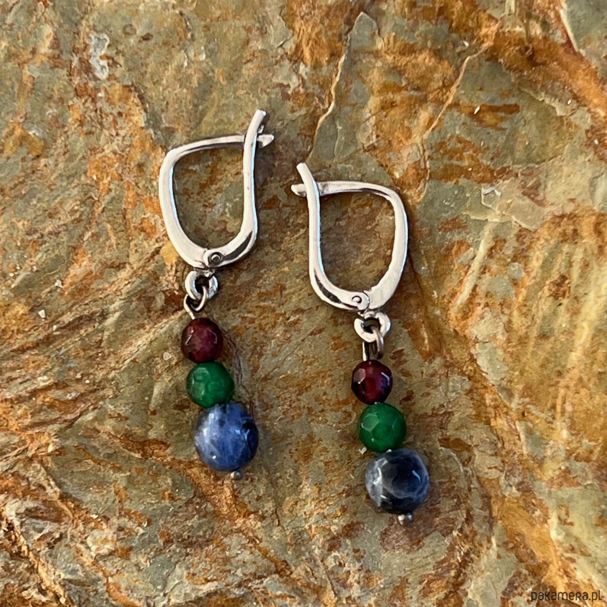 Kolczyki srebrne 925 z naturalnymi minerałami - sodolit, jadeit i granat.