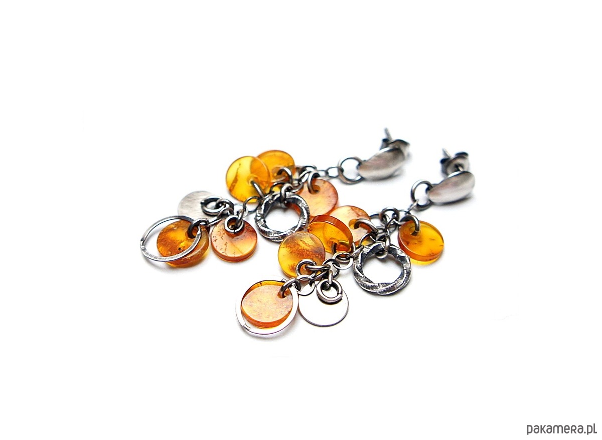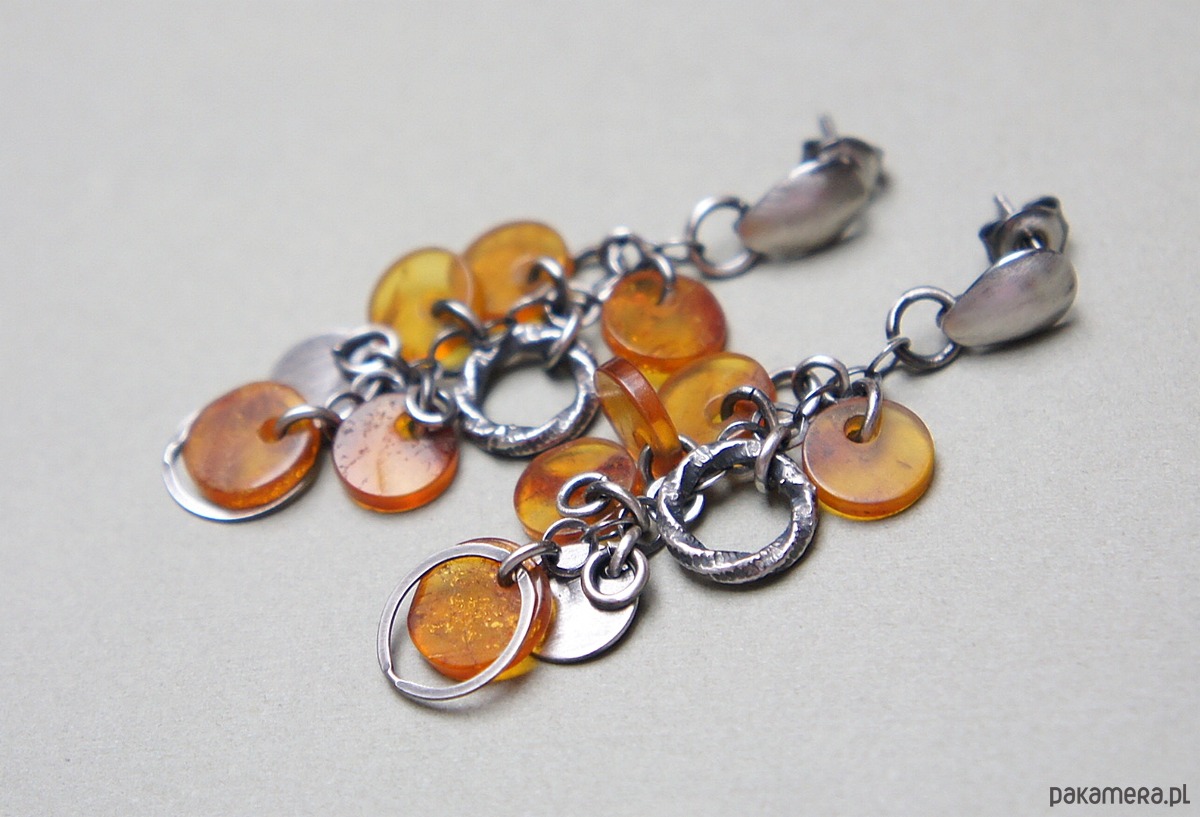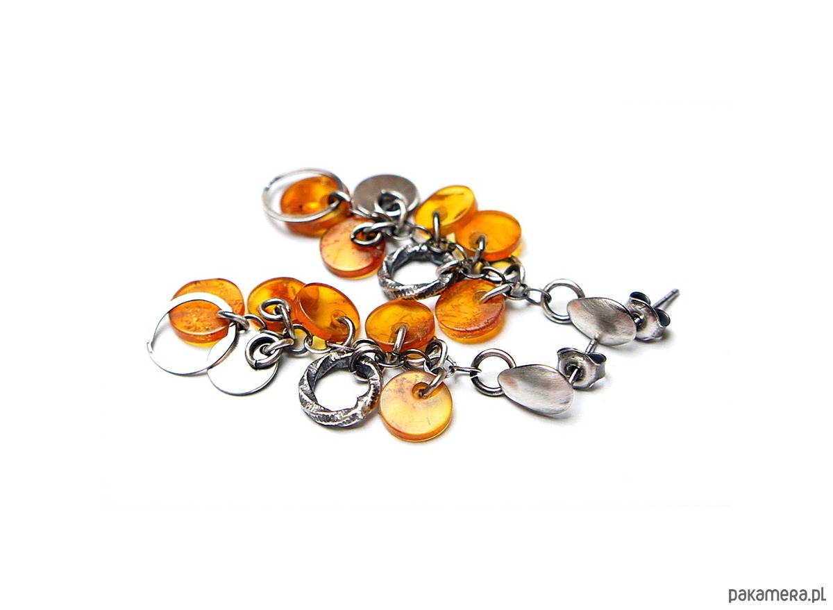 Kolczyki wykonane ze srebra [pr. 925] w połączeniu z pastylkami bursztynów [7-9mm] oraz srebrnymi blaszkami i ogniwami. Całkowita długość kolczyków 5,3. Biżuteria ozdobnie zapakowana.