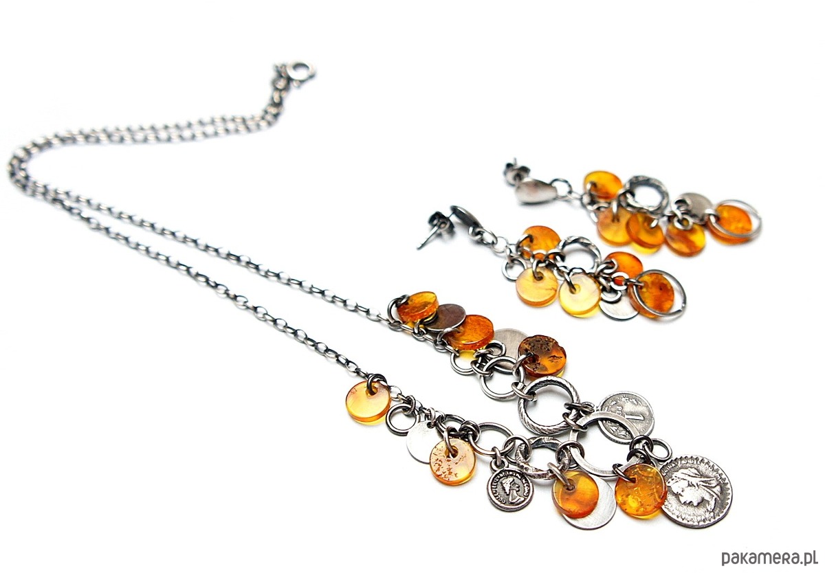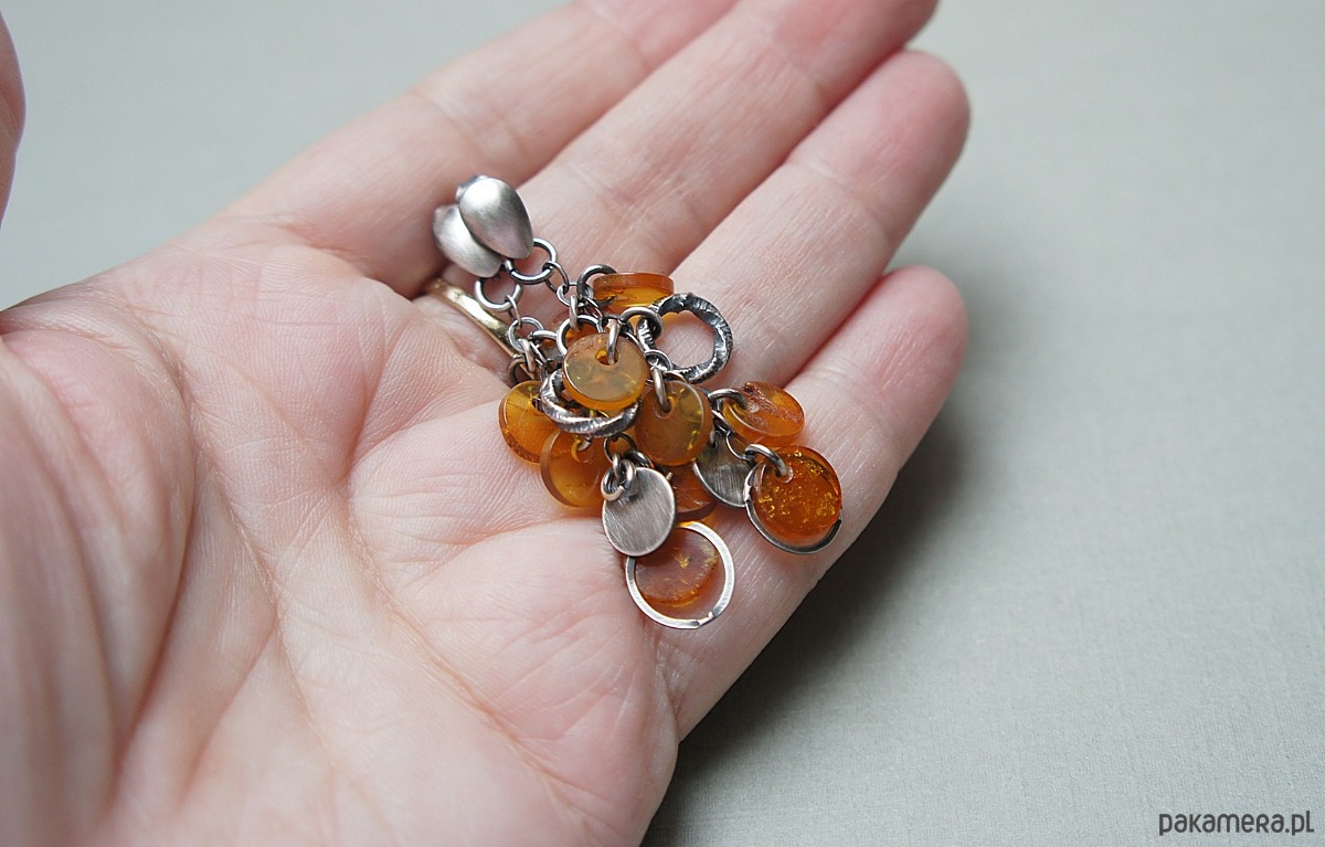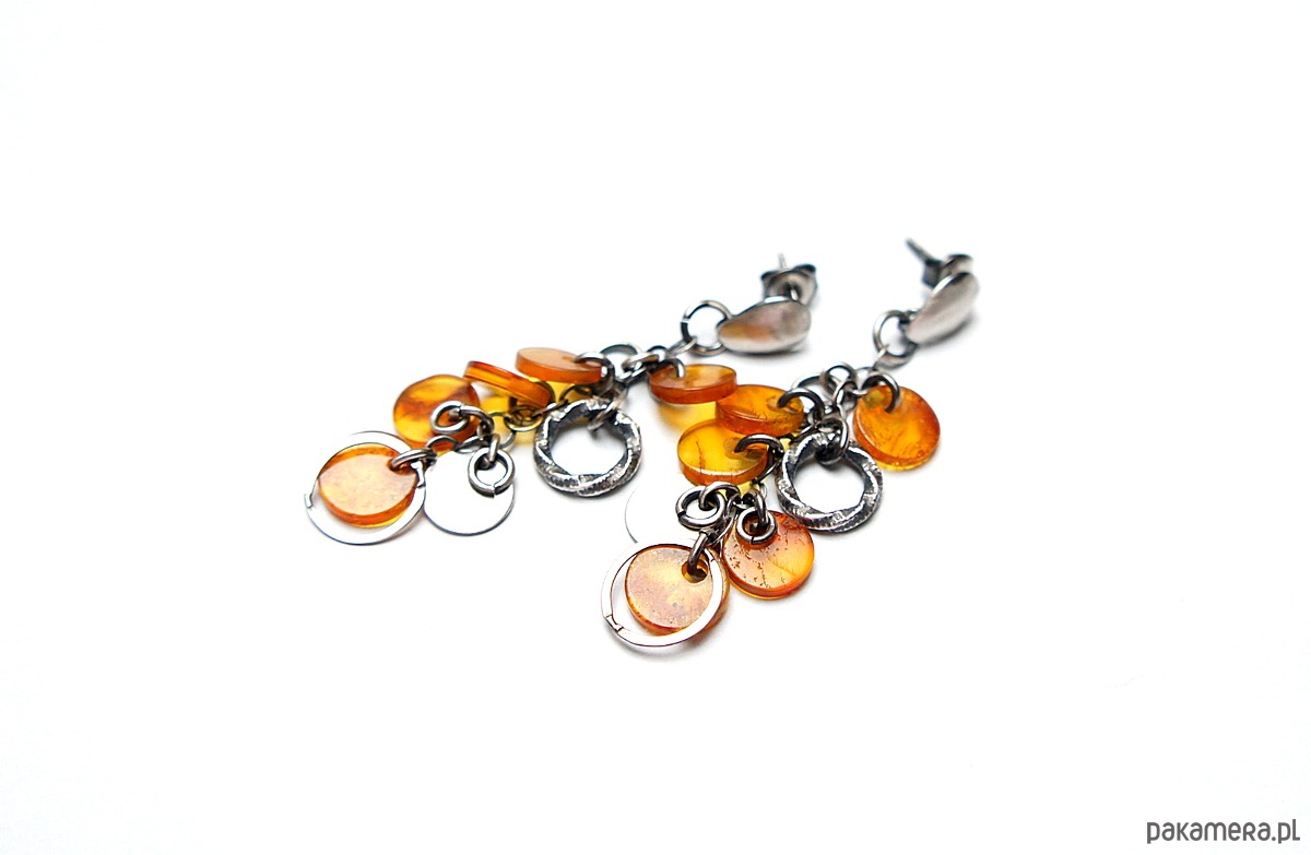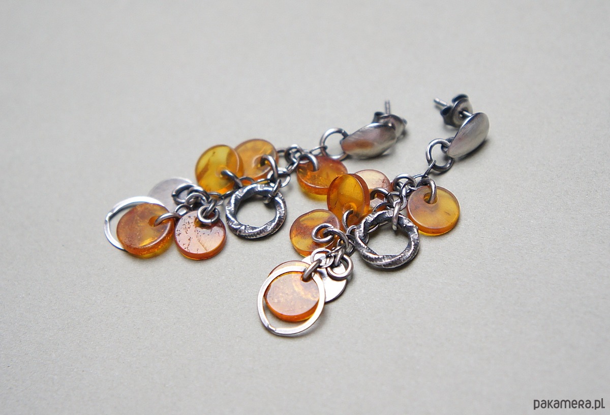 Kolczyki wykonane ze srebra [pr. 925] w połączeniu z pastylkami bursztynów [7-9mm] oraz srebrnymi blaszkami i ogniwami. Całkowita długość kolczyków 5,3. Biżuteria ozdobnie zapakowana.