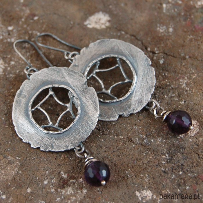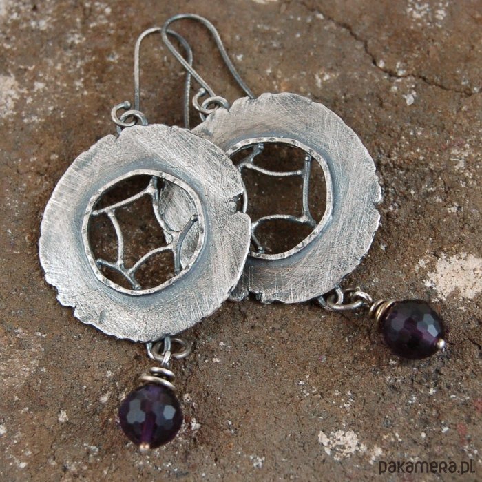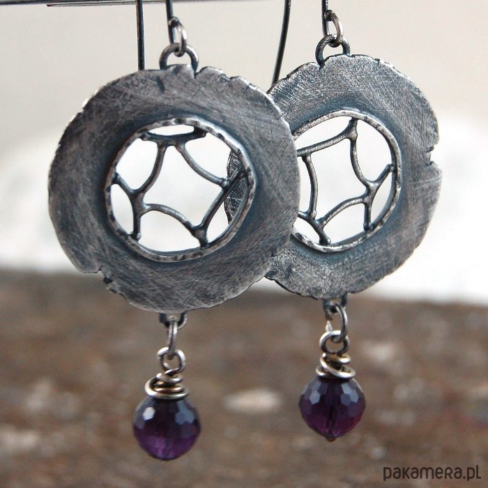 Srebrne kolczyki z ametystem. Srebro oksydowane. Średnica kamieni 0,8 cm, szerokość kolczyka 3 cm, długość 7 cm.