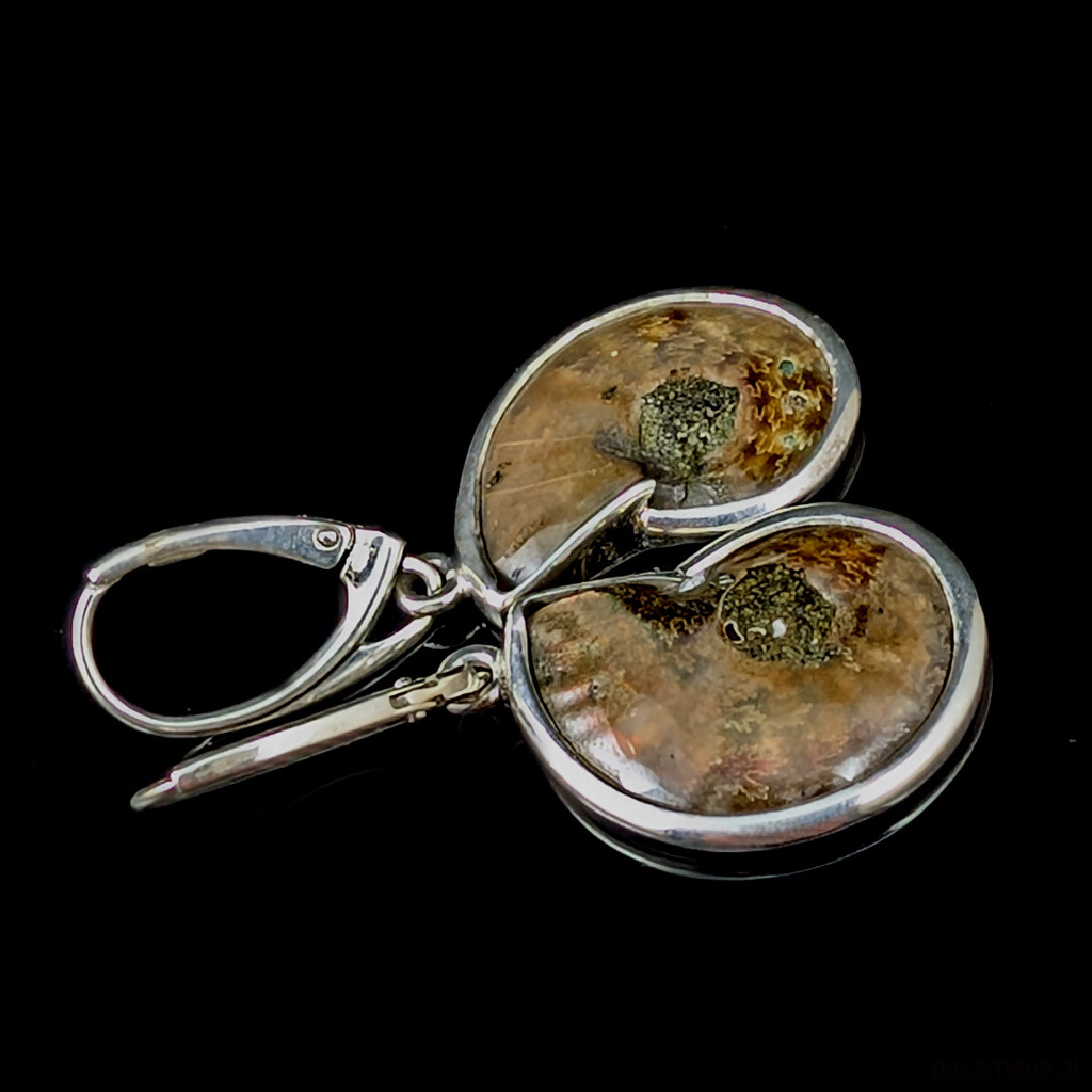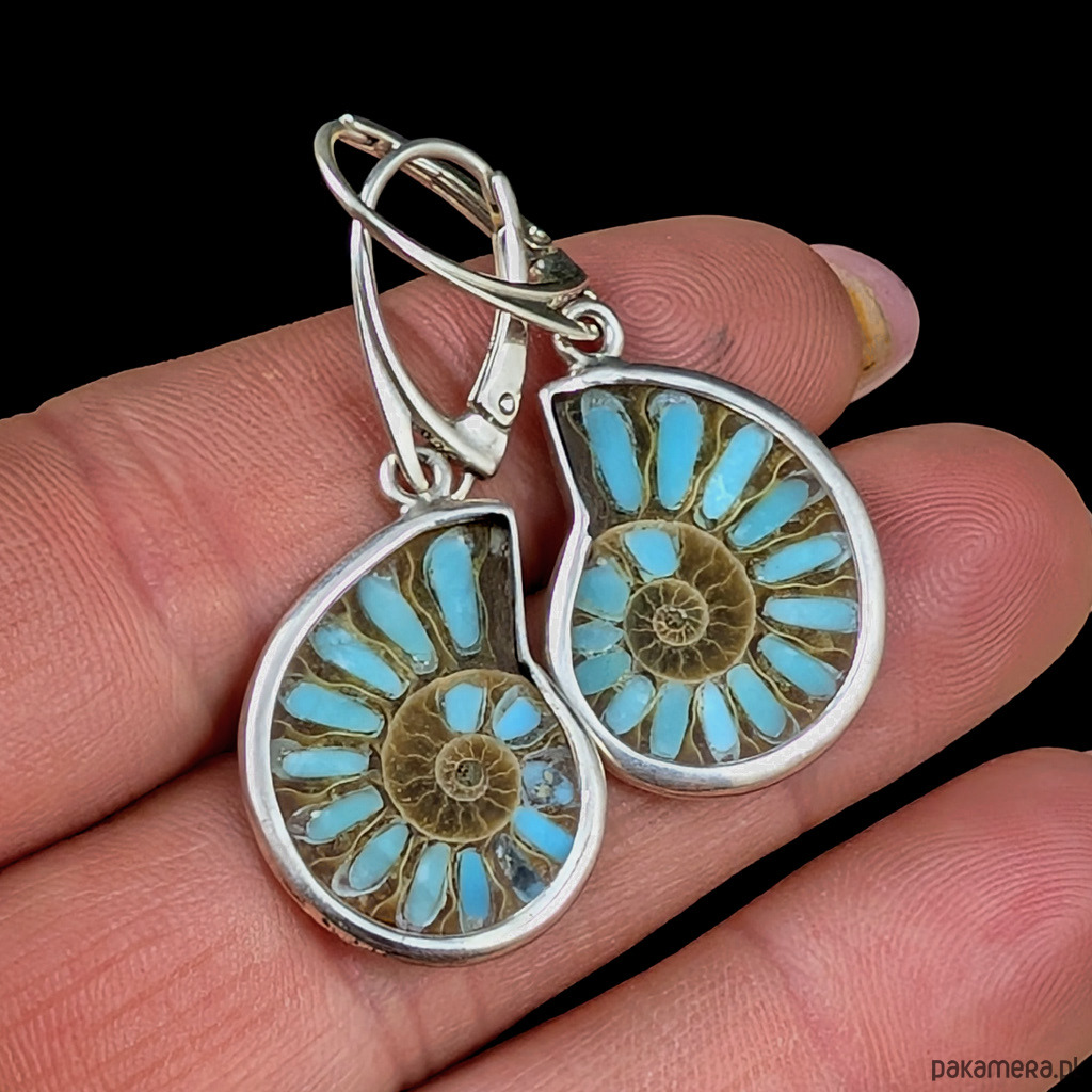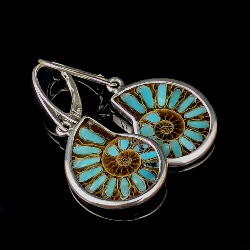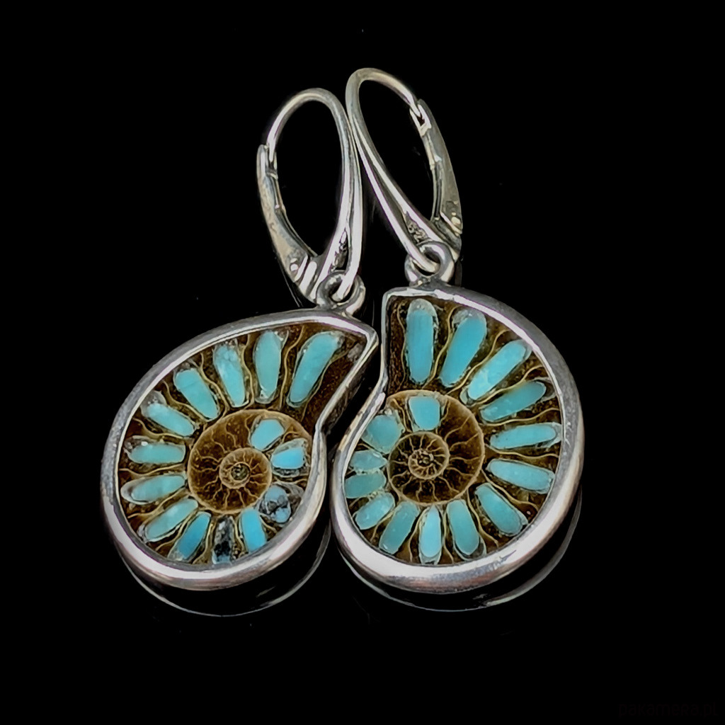 Piękne amonity zawierają w komorach inkrustowany turkus. Kamienie oprawione w srebro próby 925.